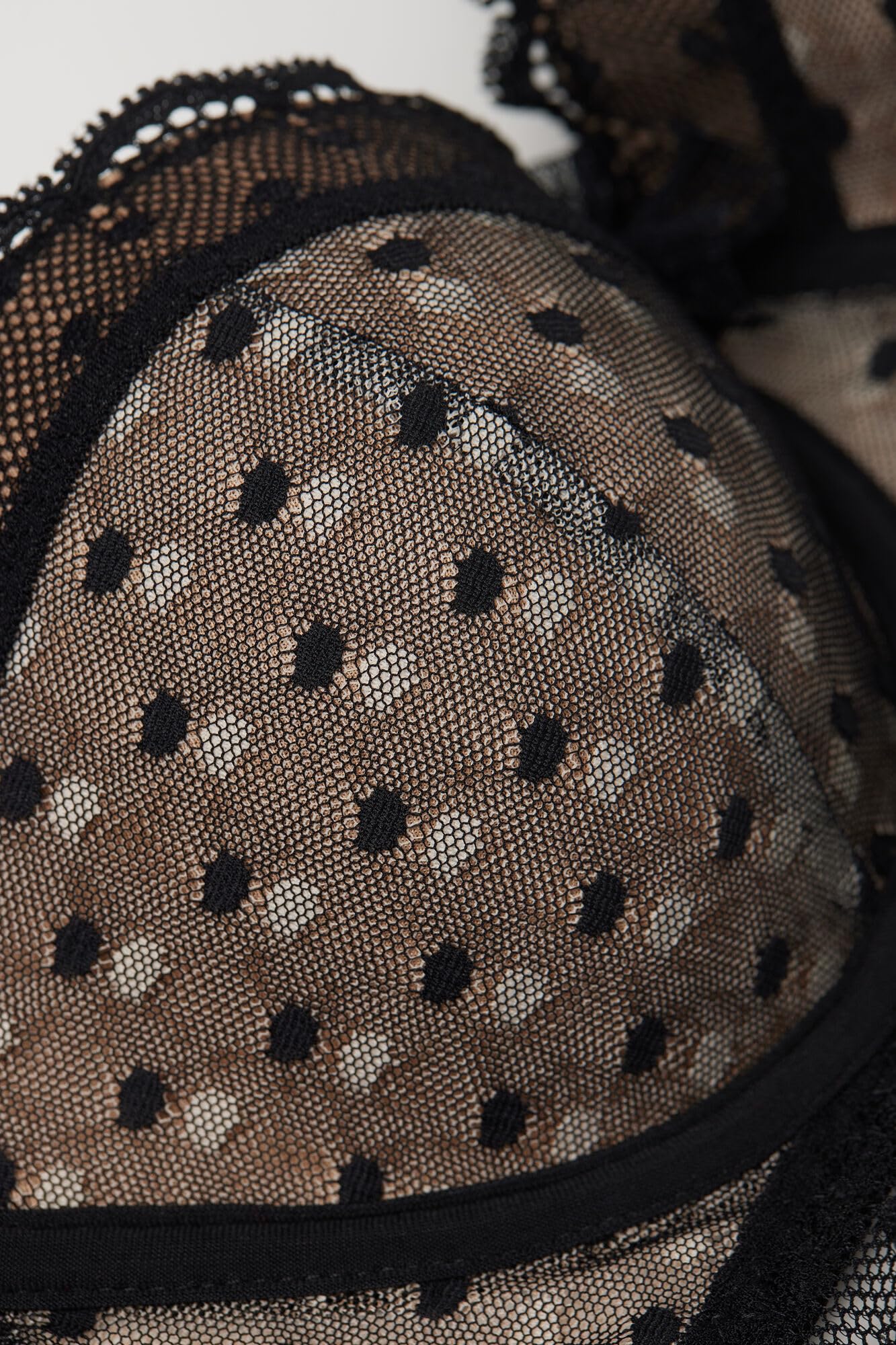 Description Tulle Sofia balconette bra with a refined contrast color dot motif embellished with romantic details like a lace ruffle and small bow at the center of the bust. Exposed microfiber trim. It is a bra that naturally shapes with maximum comfort, and it is perfect to mischievously wear exposed beneath a neckline or see-through top.