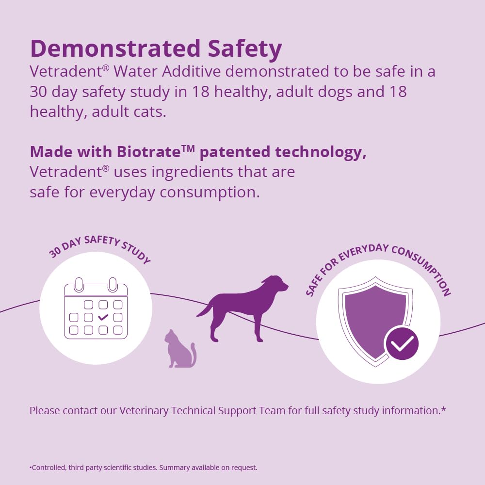 VETRADENT Water Additive has the 'VOHC Accepted' Seal to Help Control Tartar in dogs. It is scientifically formulated with Biotrate Technology to control tartar by working against bacteria and altering the environment in the pet’s oral cavity. This easy-to-use home dental product is provided to the pet by simply adding a measured amount of VETRADENT Water Additive to the pet’s drinking water.