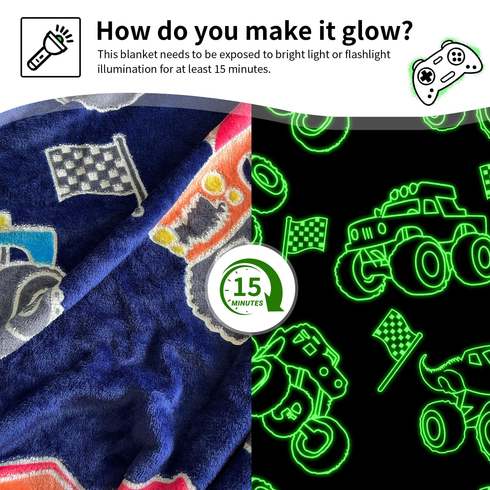 Glows in the Dark Blanket: Our truck blanket glows in the dark, simply expose the truck blanket to bright light for 15 minutes, then turn off the light and magical things will happen.