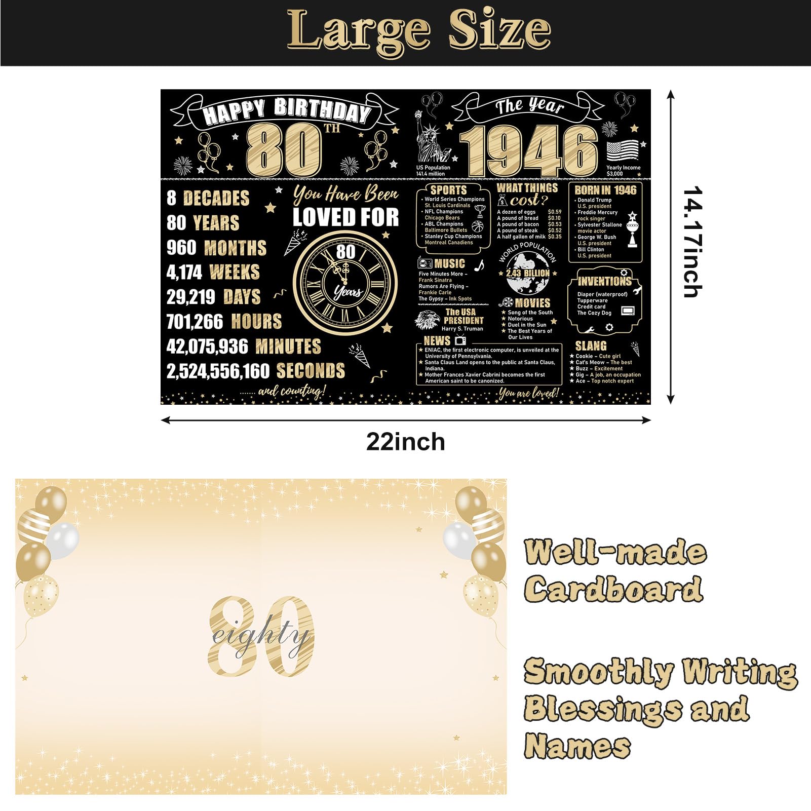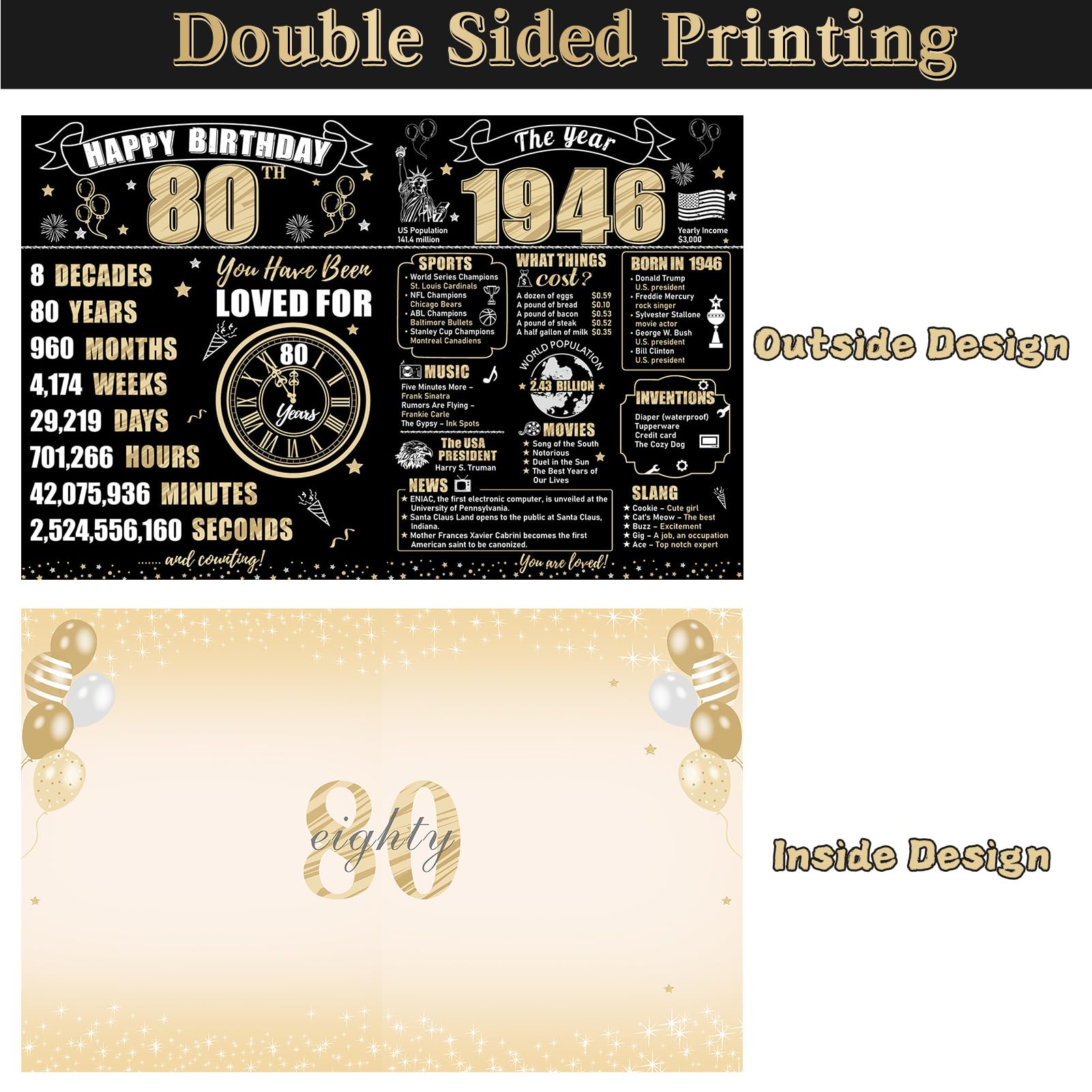 【Vintage 1946 80th birthday themed design】The double-sided design incorporates black and gold tones, featuring birthday elements like balloons and fireworks, commemorating significant events from 1946. It is both interesting and meaningful