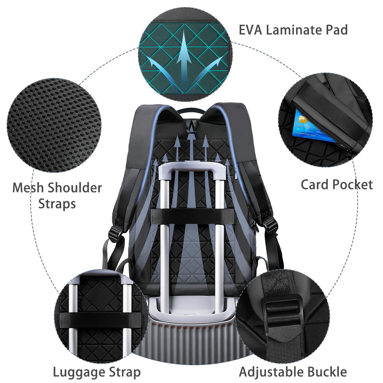 【Comfortable & Durable】This blue laptop backpacks for men is made of waterproof sturdy Oxford cloth with durable metal zippers. The back side is built with high quality EVA material, which is comfortable and soft, gives you maximum back support. Breathable and adjustable shoulder straps with foam pad help relieve the stress of shoulder.