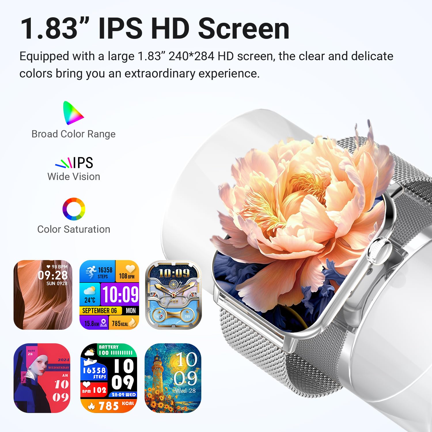 Bluetooth Calls & Alerts: Compatible with Android 5.0+ and iOS 9.0+, this smart watch lets you make and receive Bluetooth calls with clear sound. It also displays text messages and app notifications (message replies not supported)