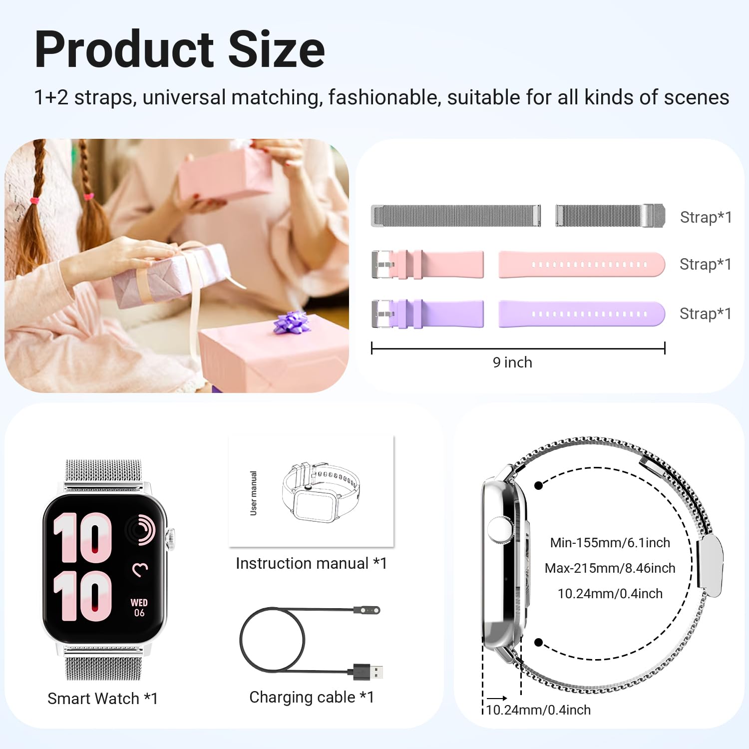 Voice Control: Activate the smart voice assistant to effortlessly manage music playback, stopwatch, alarms, flashlight, reminders, and more—all with simple voice commands. 3 band styles included: 1 metal and 2 silicone, to suit various styles