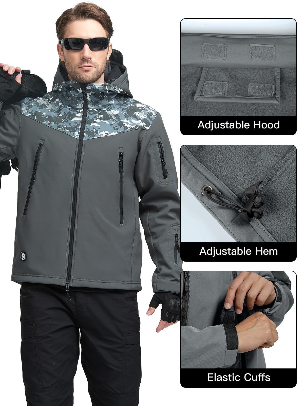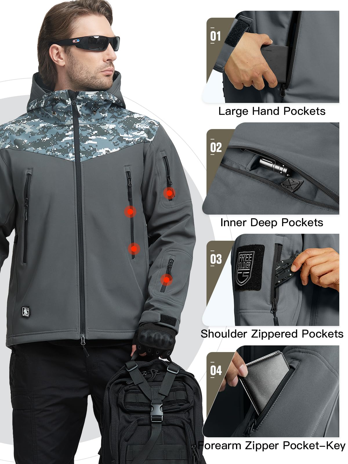 FUNCTIONAL POCKETS - This Military Tactical Jacket up to 7 pockets provide large and safe storage - 2 huge storage chest pockets with internal EDC pocket for tactical pen and light, metal D-rings & headphone jack. 2 zippered shoulder pockets with hook & loop tapes. Forearm zipper pocket on the left arm for key, cards or small accessaries. 1 back connected pocket which can carry tactical equipment, more convenient for you to store things when you go outside to keep your hands free