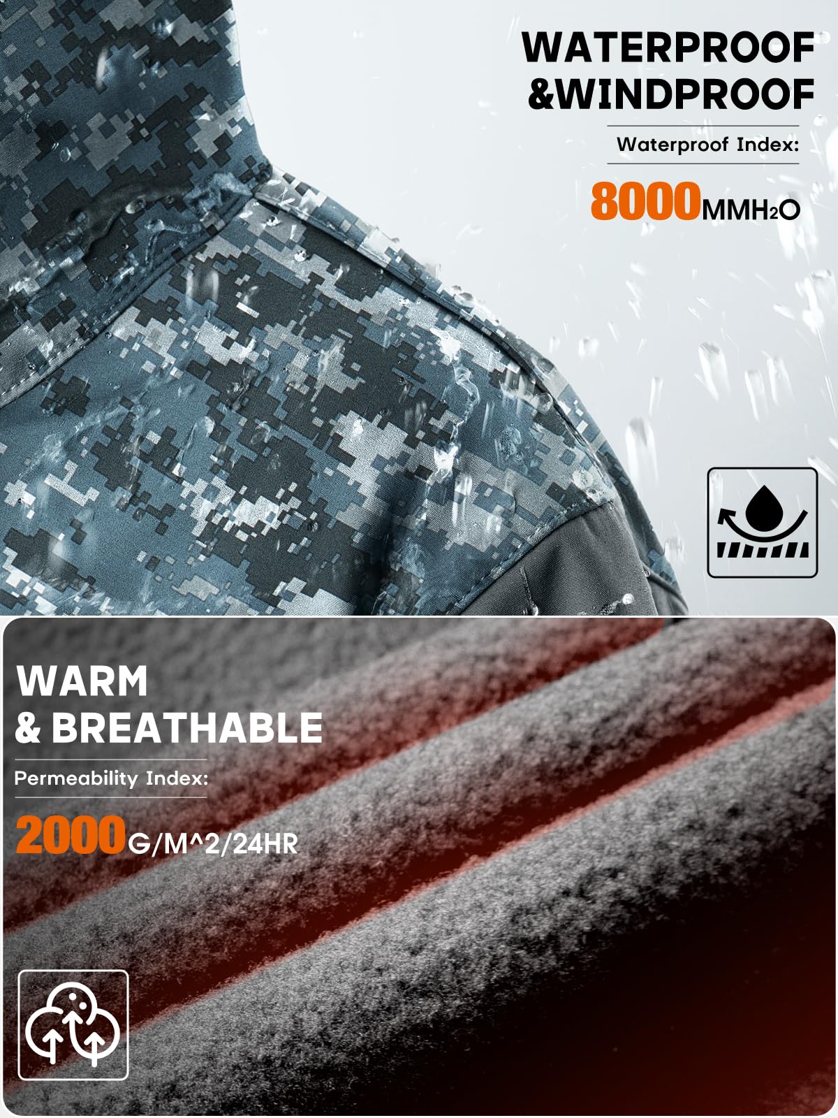 KEEP WARM & COMFORT- Men's Waterproof Softshell Jacket is made of 94% Polyester 6% Spandex and 100% Polyester Thermal 8000mm Fleece Liner. Scratch-resistant Polyester fabric and stretch spandex are especially suitable for outdoor activities with extreme flexibility and comfort. Designed with warmth and comfort in mind, this mens fleece lined jacket adopts a high-quality Polar Fleece Lining for breathing freely, a skin-friendly feel and superior moisture-wicking performance