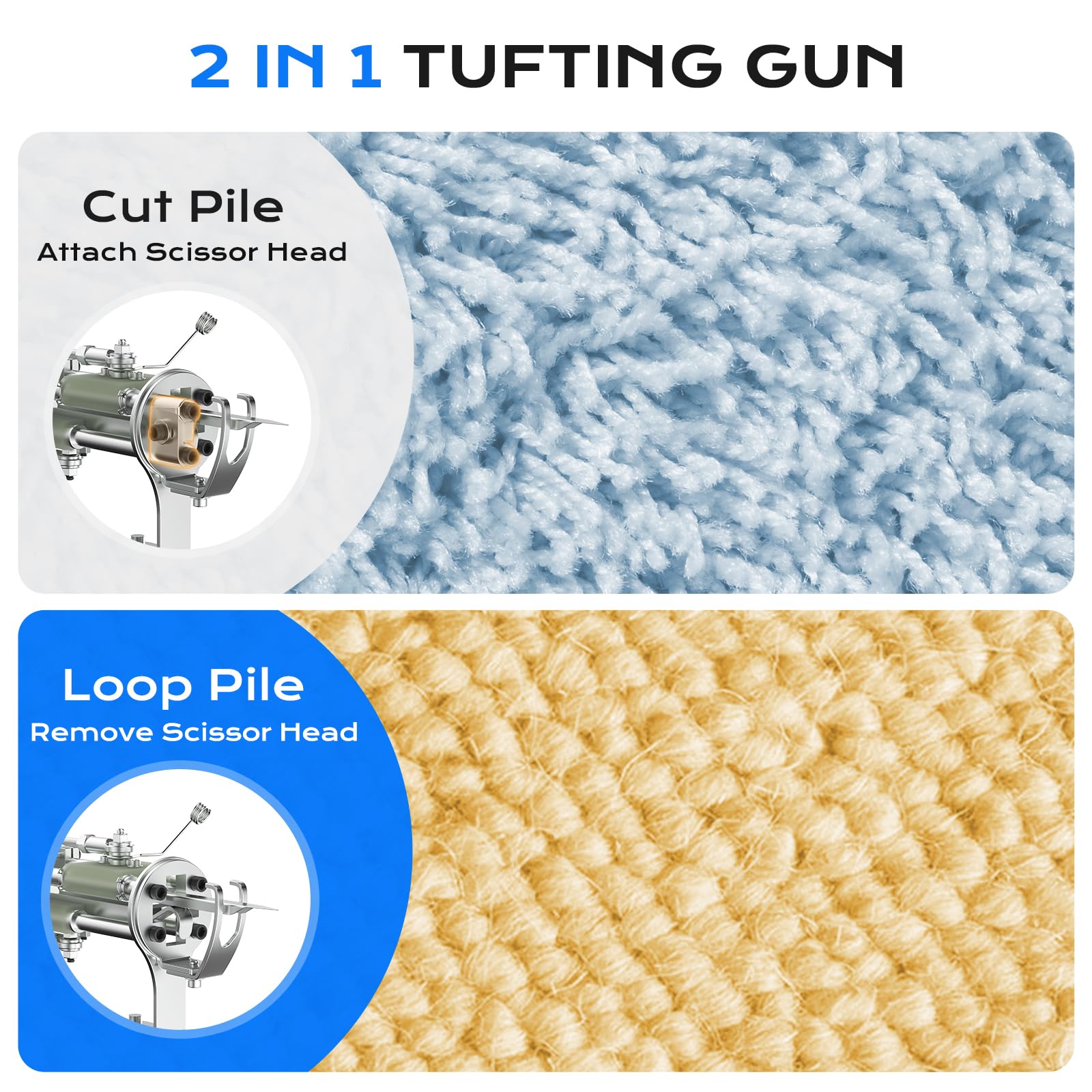 Cut and Loop Pile 2-in-1 Rug Tufting Gun: The rug tufting kit can manually switch between cut pile and loop pile with the scissors changed. The pile height can be adjusted between 7-21mm(Cut Pile). The tufting gun starter kit default with cut pile mode;(It is recommended to use thicker 8 strands of yarn)