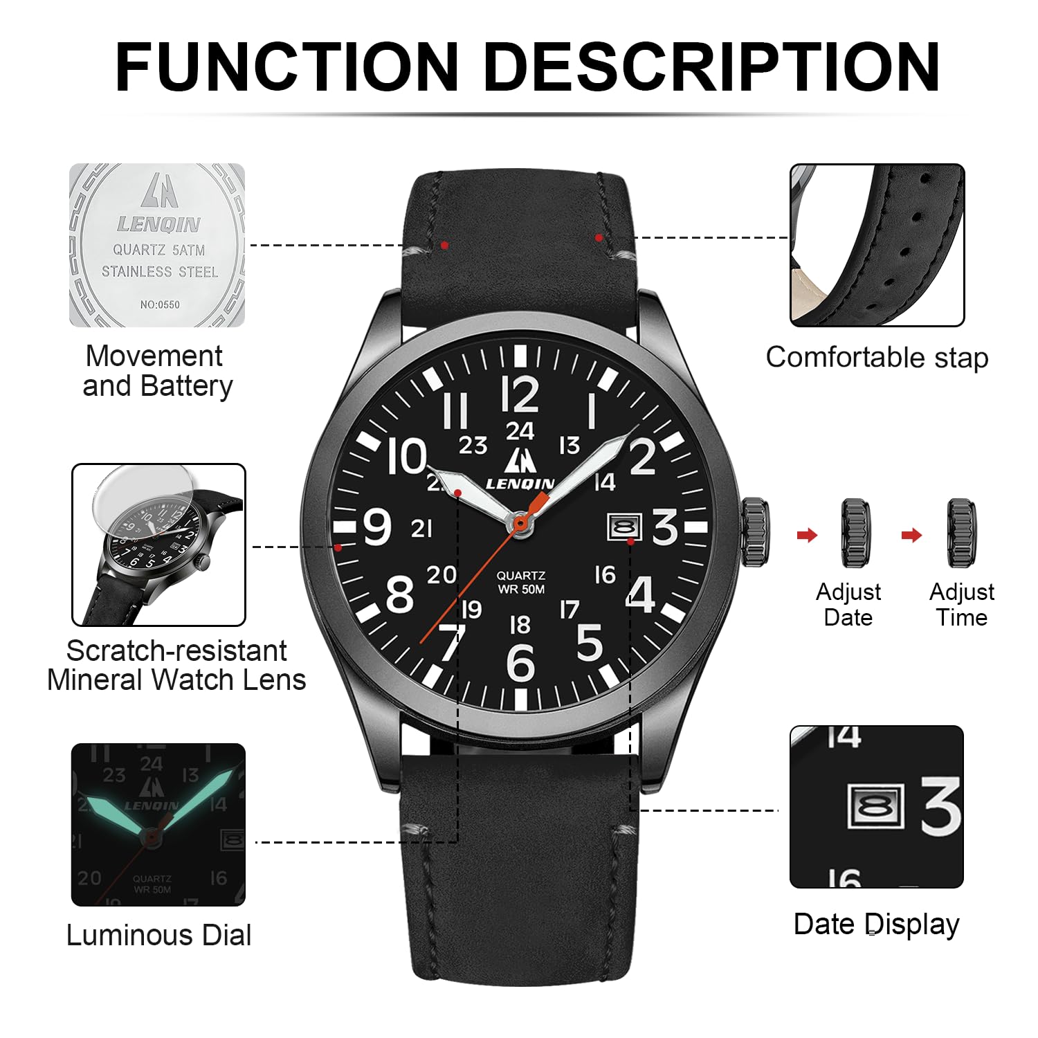 ⌚ EASY TO READ TIME: 12 / 24 hrs military time and luminous dial. The mens watches equipped with date calendar can tell you the time quickly and accurately. Come with luminous function, easy to read the time even in the dark.