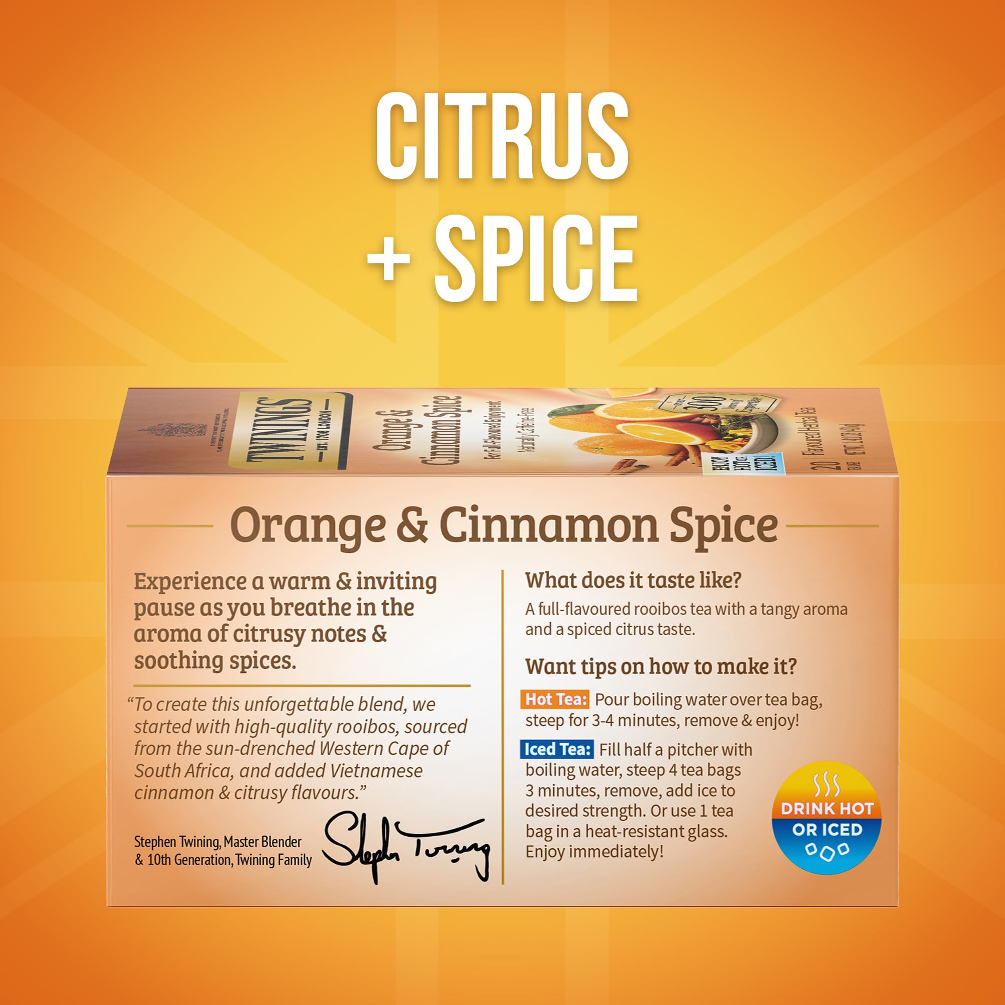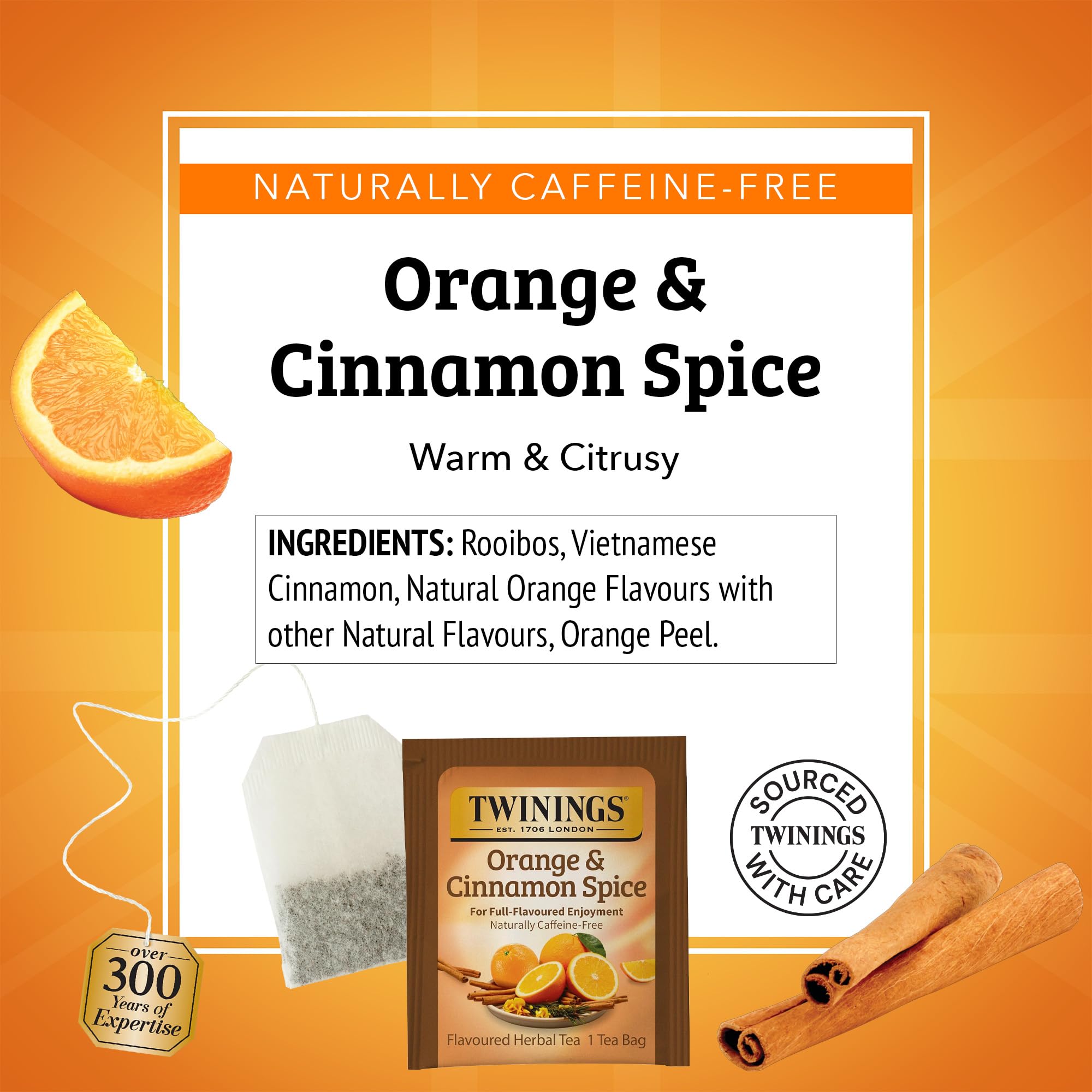 Safety Information May contain peanuts. Not recommended for individuals with peanut allergies. Ingredients Twinings Orange & Cinnamon Spice Tea, Naturally Caffeine-Free Sweet and Spicy Tea with Rooibos, Orange, and Cinnamon, Herbal Tea Bags Individually Wrapped, 20 Count Directions Steep a tea bag in freshly boiled water for 3-5 minutes. For iced tea, let the brewed tea cool before pouring it over ice. Legal Disclaimer Statements regarding dietary supplements have not been evaluated by the FDA and are not intended to diagnose, treat, cure, or prevent any disease or health condition.
