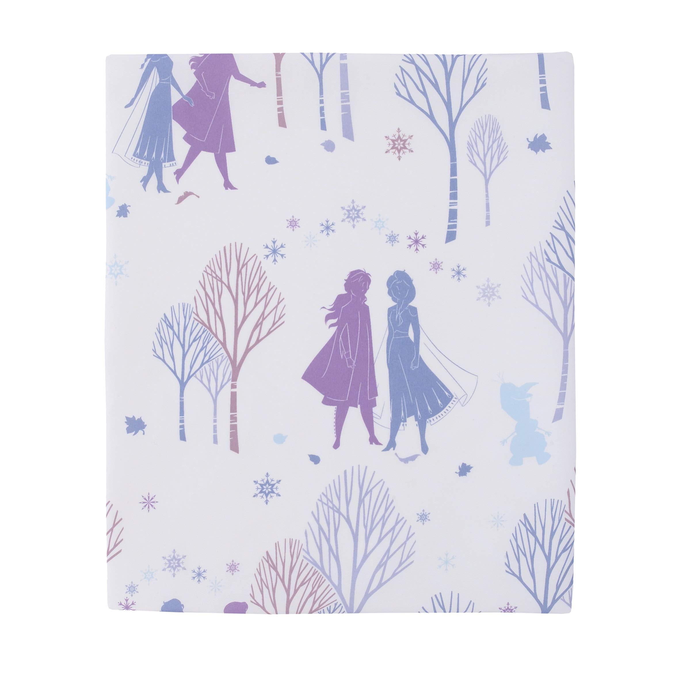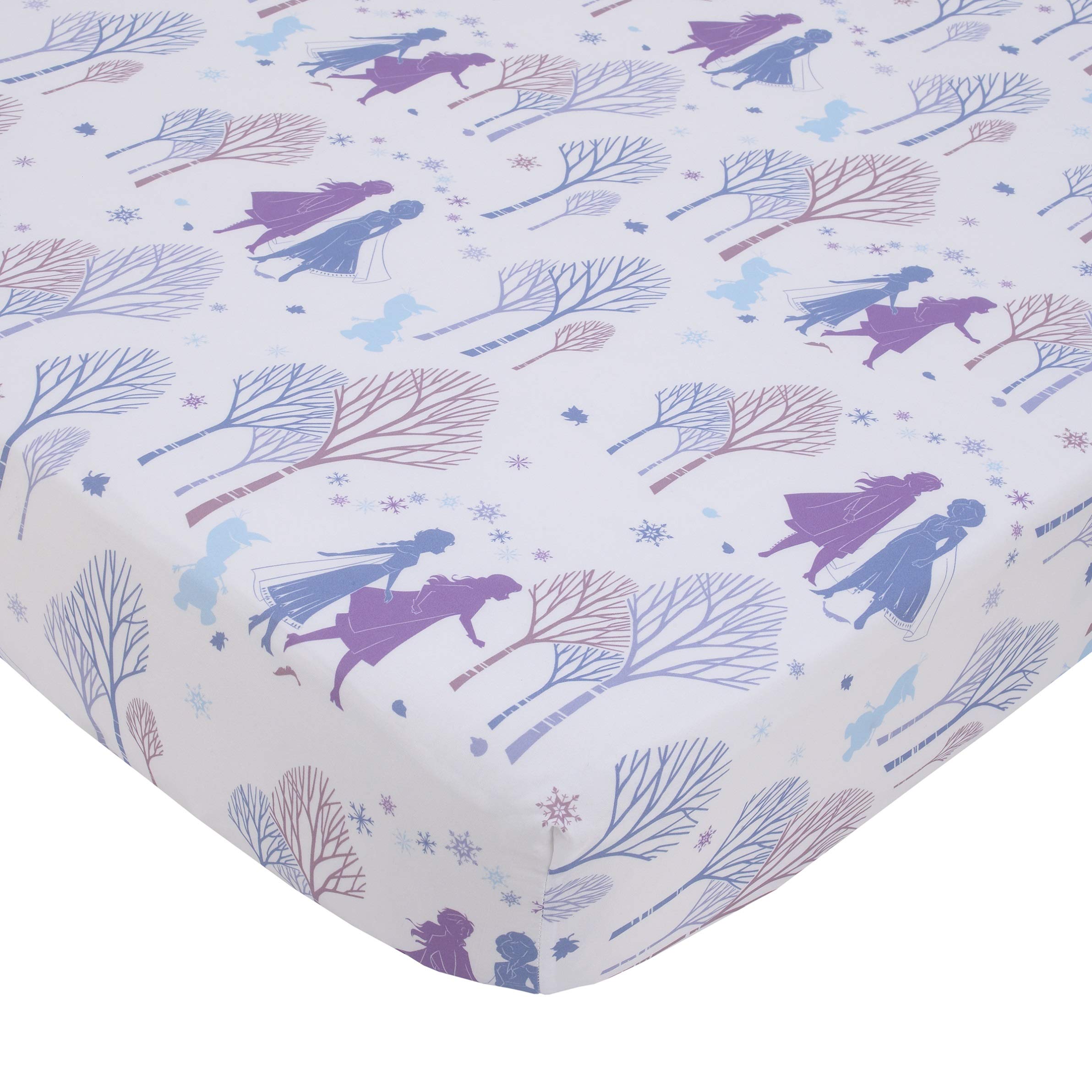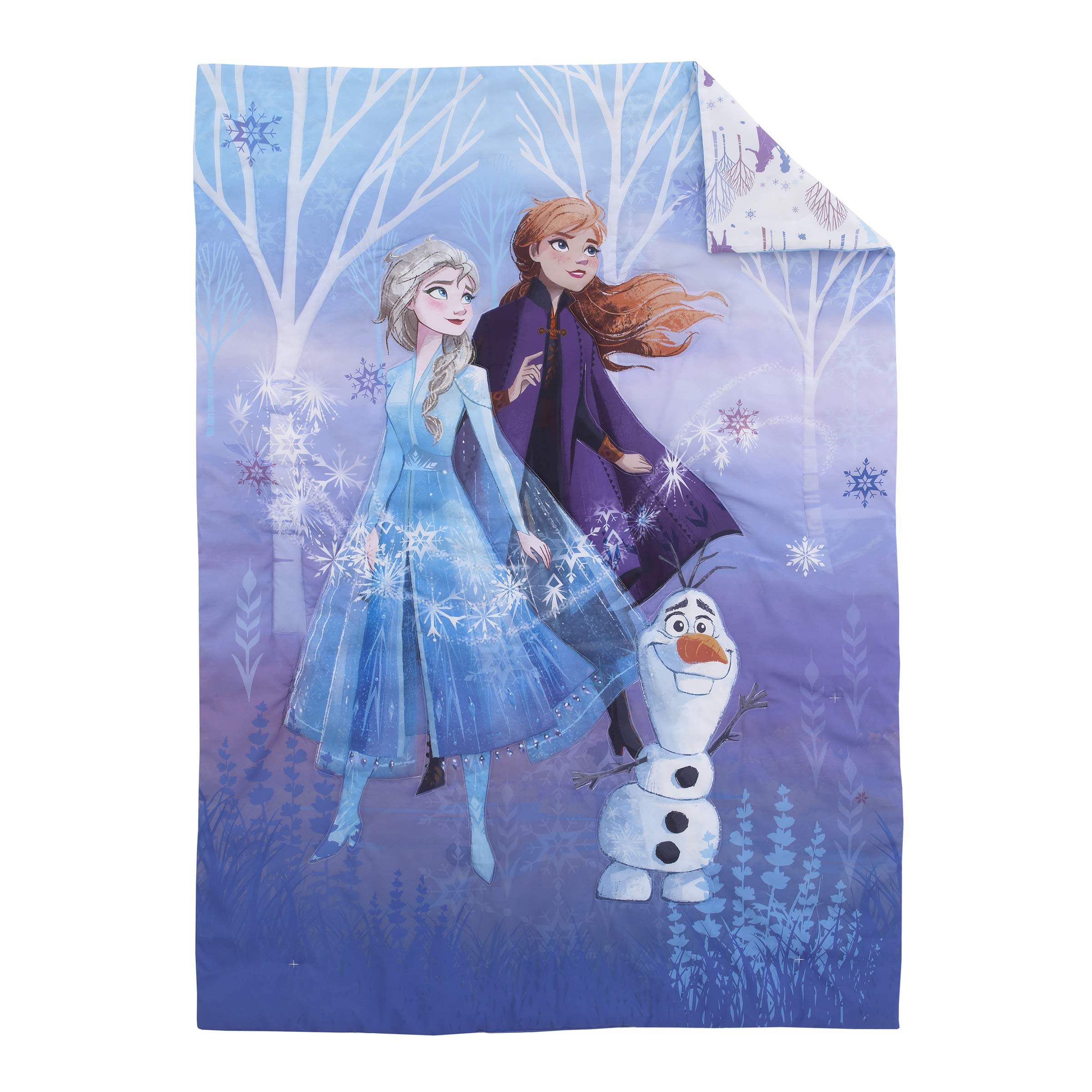 The Disney frozen 2 traveling North 4 Piece Toddler Bed Set includes a comforter, fitted bottom sheet, flat top sheet and reversible pillowcase. The 42" X 57" Comforter features Anna, Elsa, and Olaf in the forest in shades of lavender, light blue, white, and plum. The top sheet measures 45" X 60" And the bottom fitted sheet measures 28" X 52" With an elastic edge for a snug fit. Both sheets come in a fun allover print of Anna, Elsa, Olaf with snowflakes in cool colors of white, lavender, light blue, and plum. The 20" X 30" Reversible pillowcase features Anna on the front and Elsa on the back. This set fits a standard toddler/crib size mattress. The perfect playful pattern for your toddler's room.