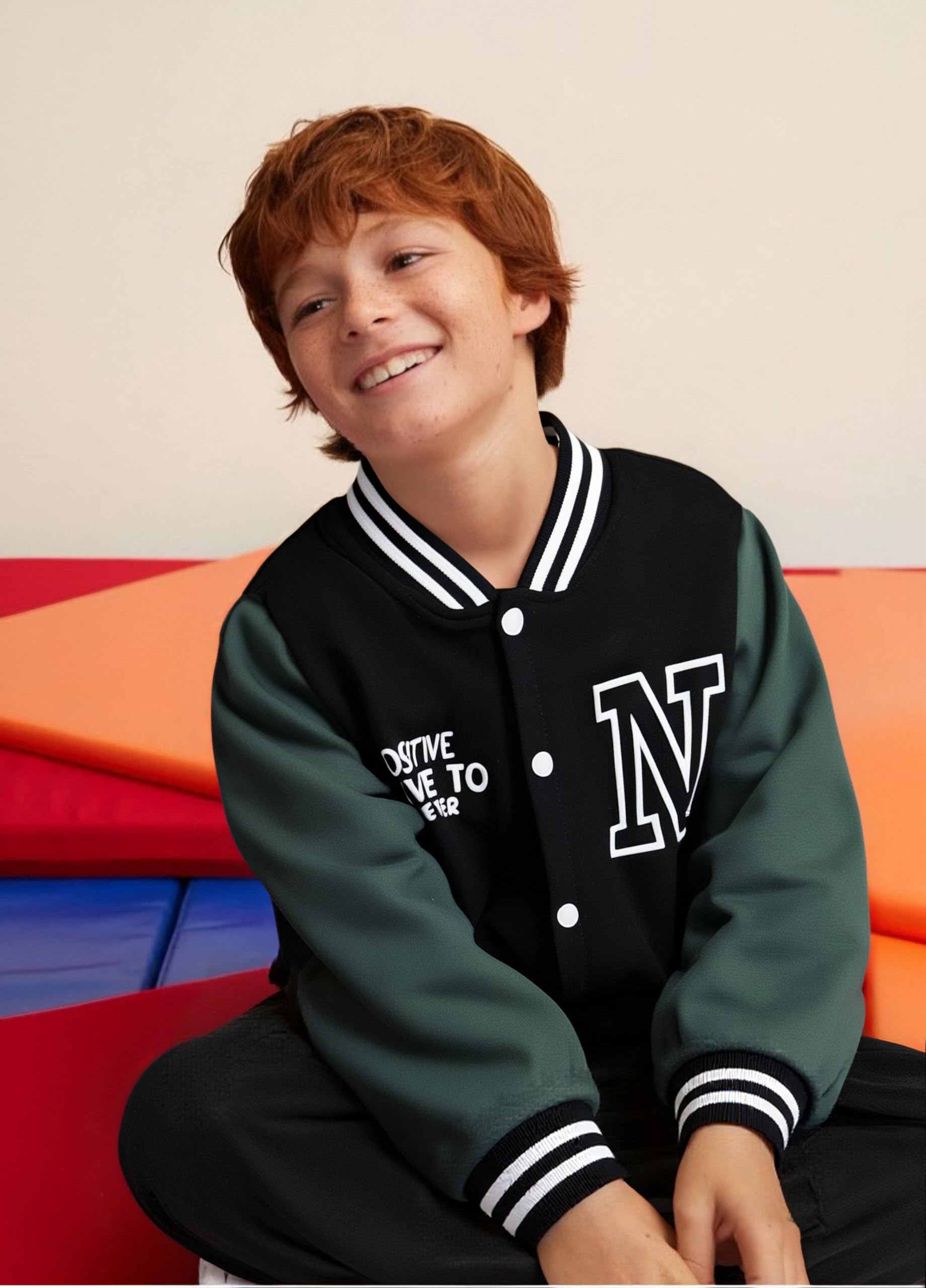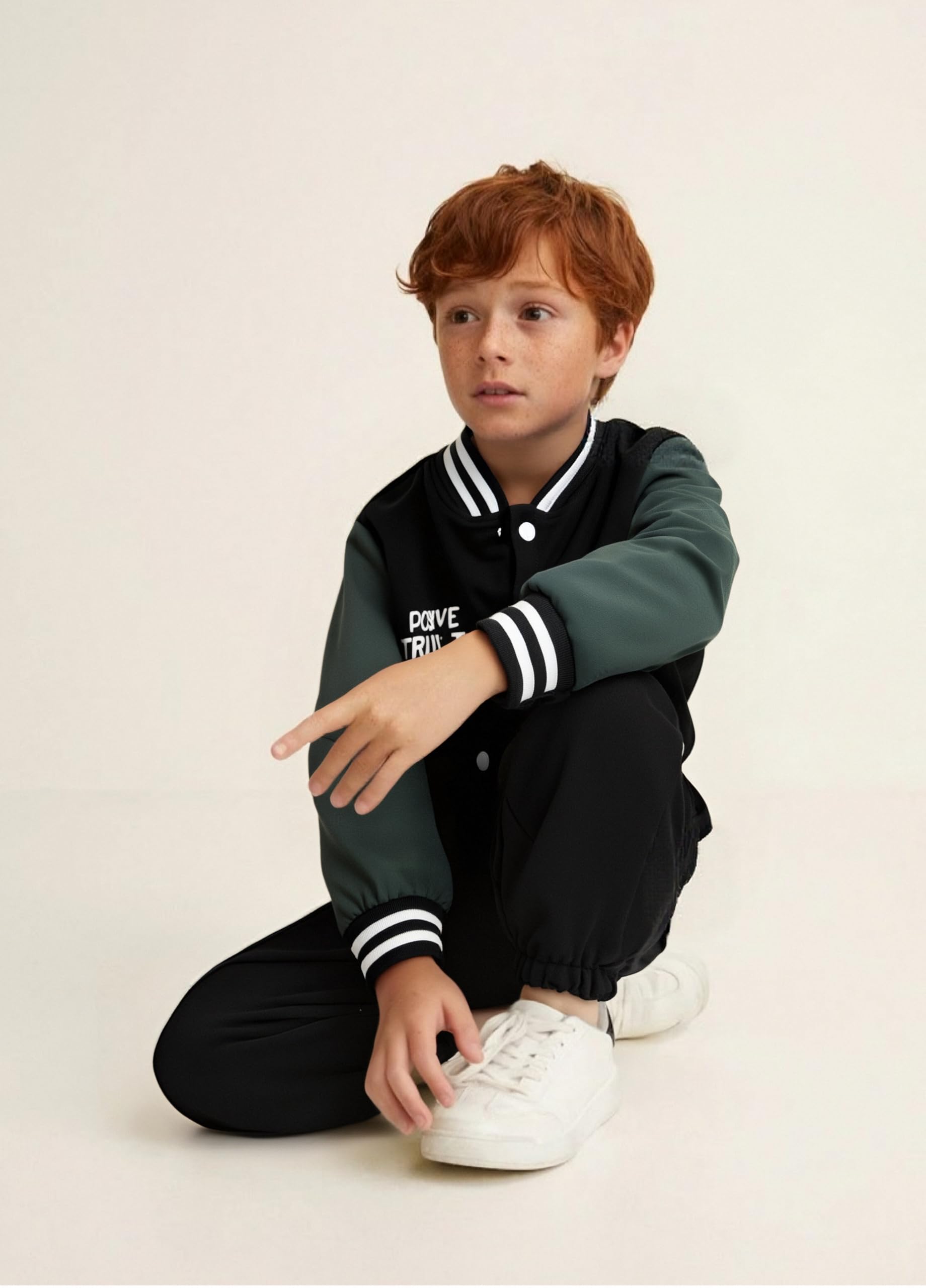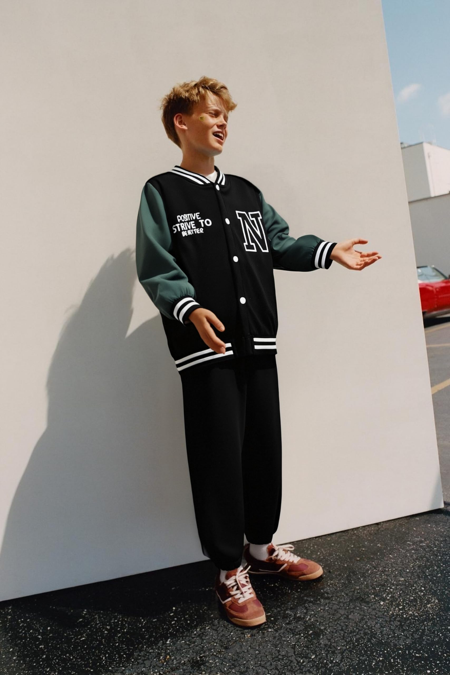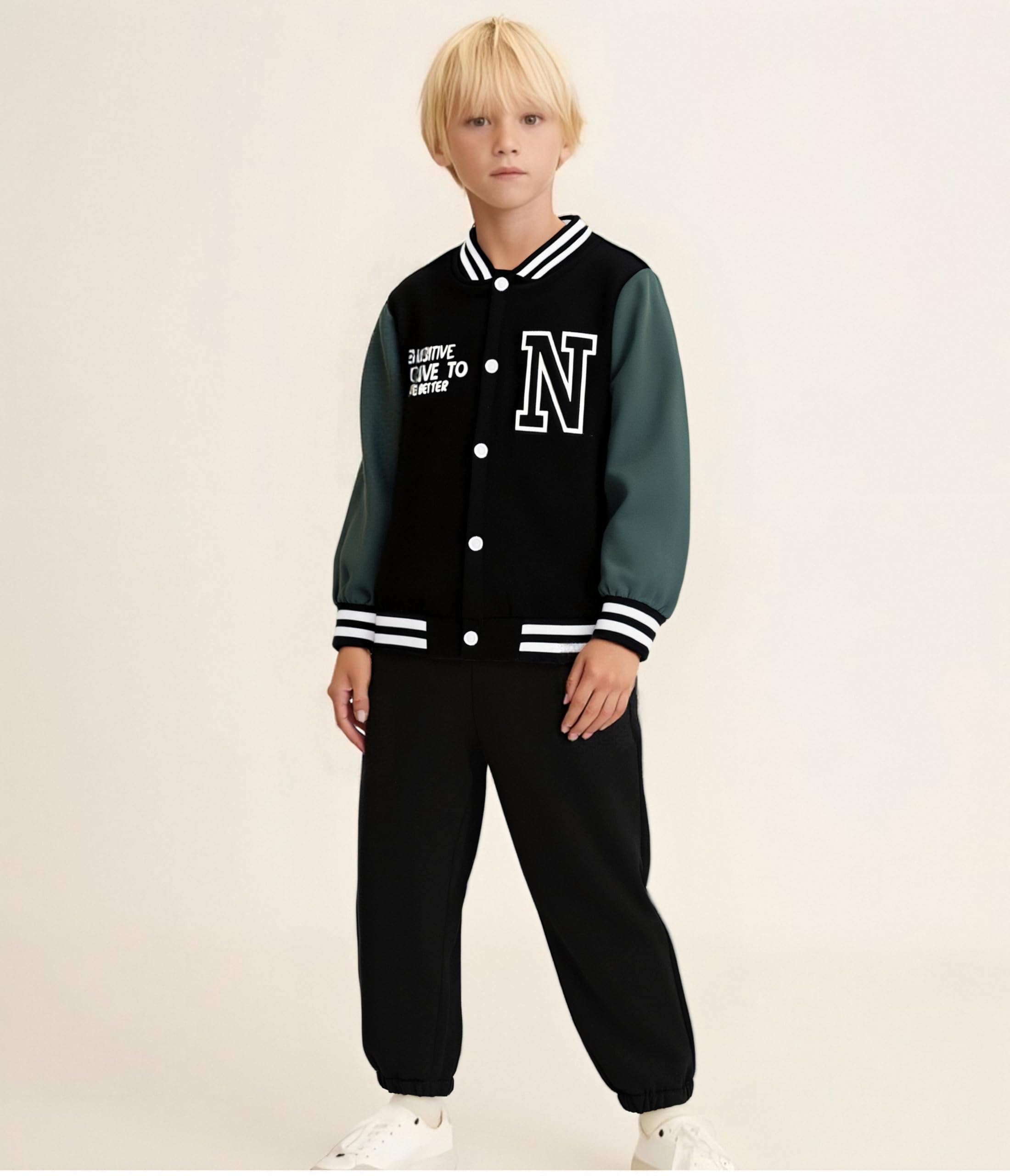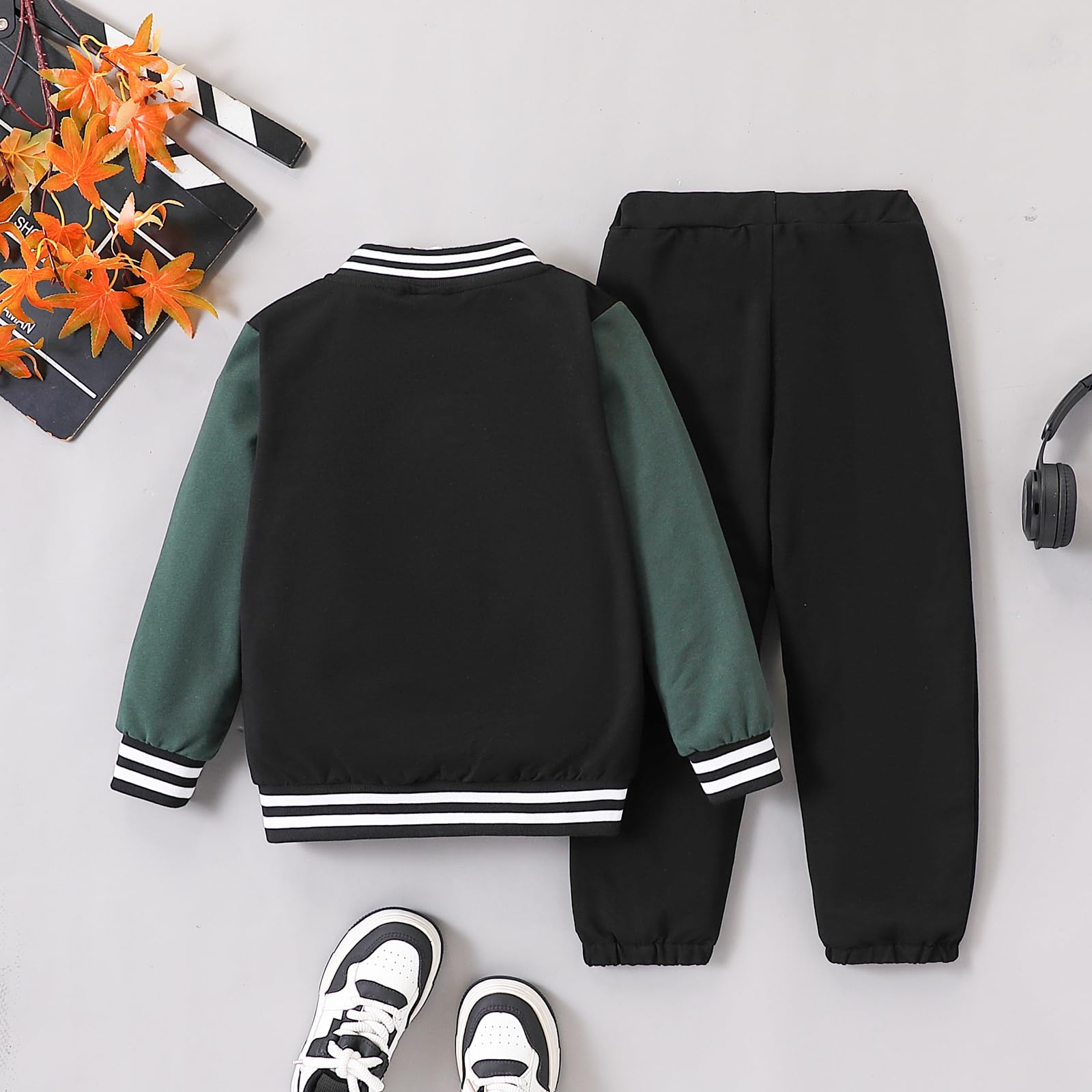 Design: This boys varsity jacket set includes a classic solid color baseball jacket with ribbed cuffs and matching jogger-style pants. Clean lines and sporty details give it the look of a boys bomber jacket set while staying casual and comfortable