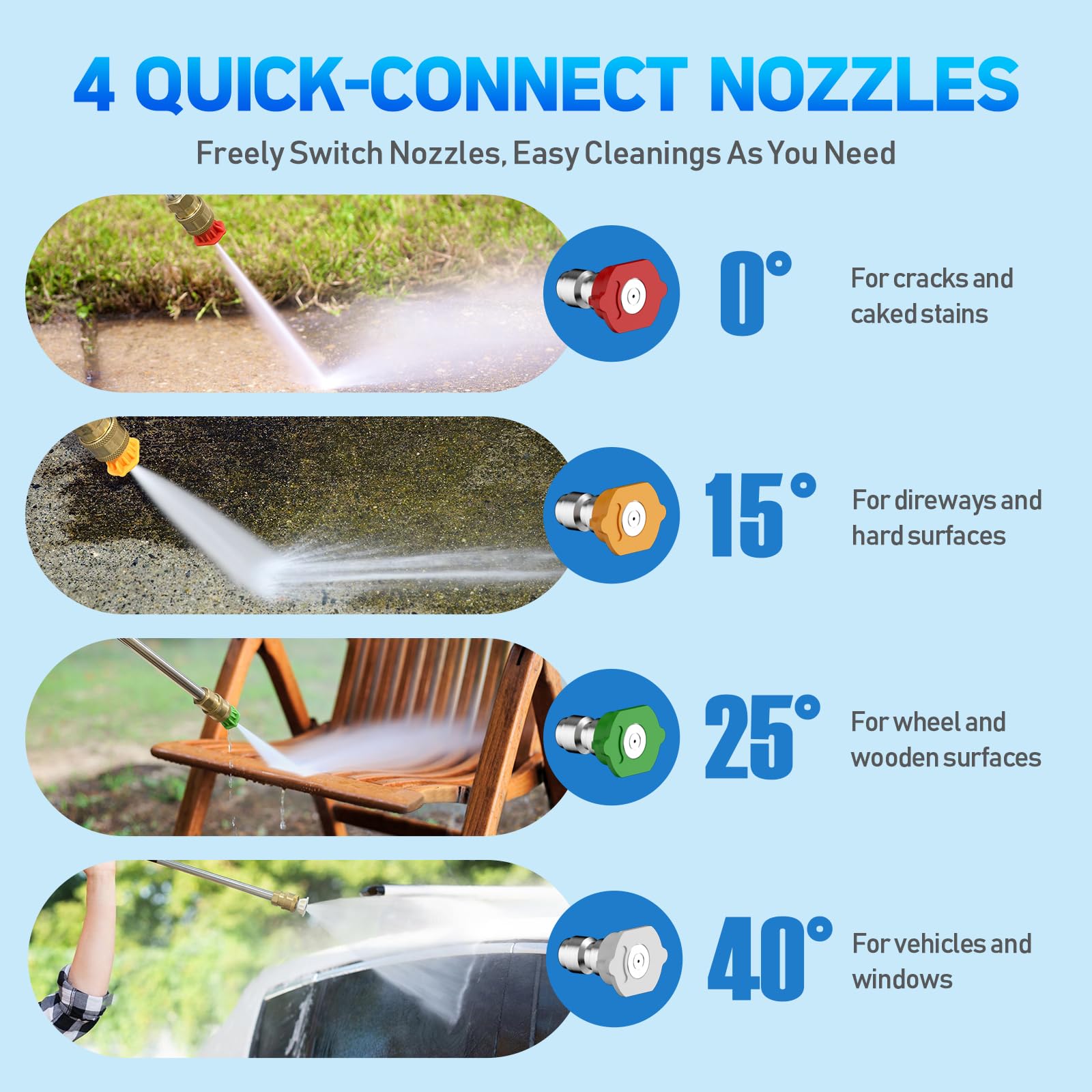 Accessories: 4 different nozzles (0 °, 15°, 25°, and 40°) and 500ml foam cannon meet your various requirements to complete any cleaning work