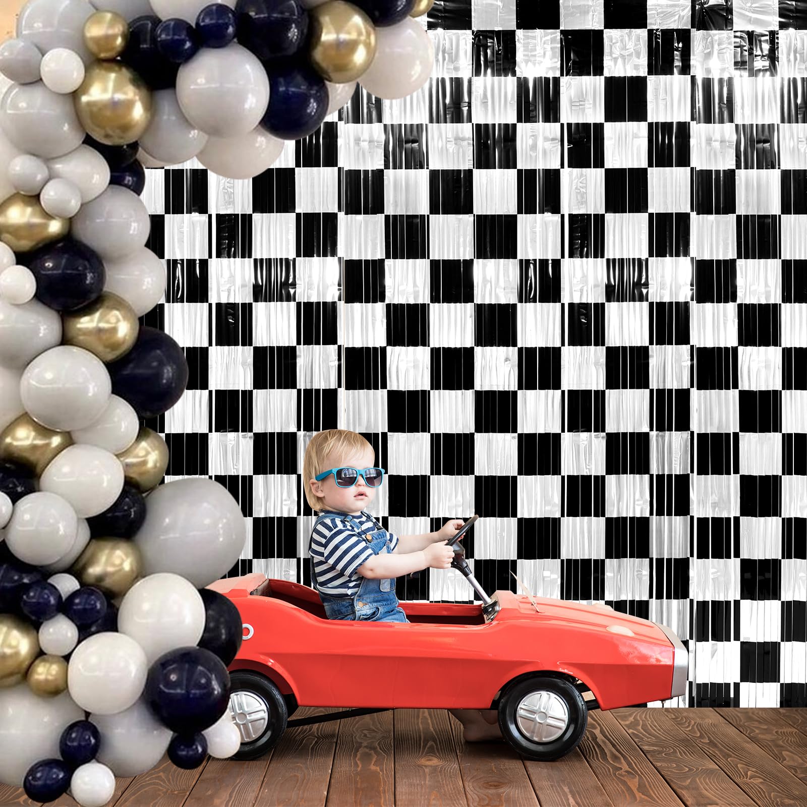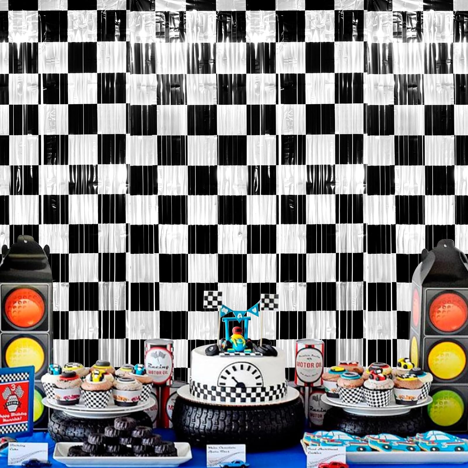Features: Black and White Checkered Race Car Foil Fringe Curtains The race car foil fringe curtain boasts classic black and white colors, and features a shiny design that is both beautiful and eye-catching. It will surely be a highlight of your party and add to the joyful atmosphere of your celebration. Wide Applications: Our race car tinsel party decorations are perfect for your shiny themed party, such as a birthday, or car theme parties. It can be used not only as decoration for indoor and outdoor walls but also as a background, wallpaper, photo backdrop, or any other creative use you can imagine. Enhance the festive atmosphere for your guests to enjoy even more. Notes: Manual measurement, please allow slight errors in size. The color may exist a slight difference due to different screen displays.