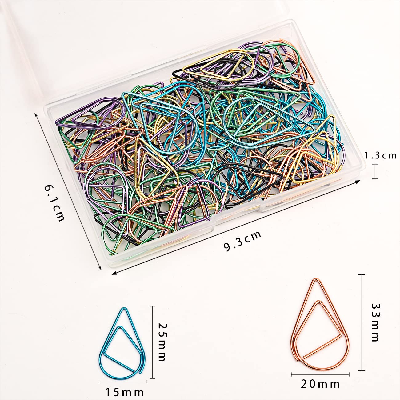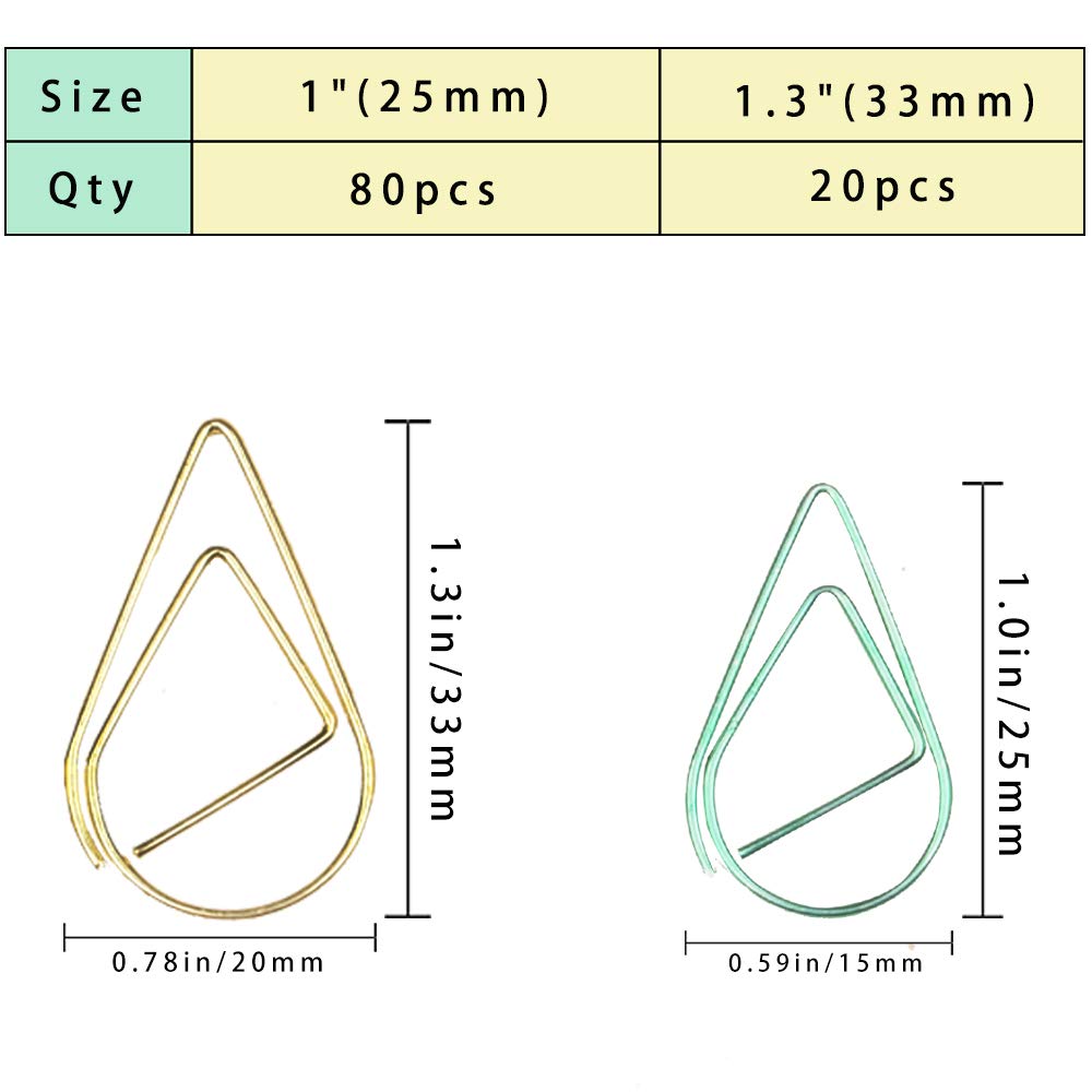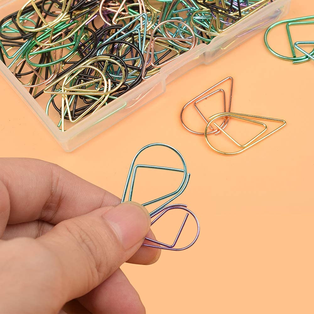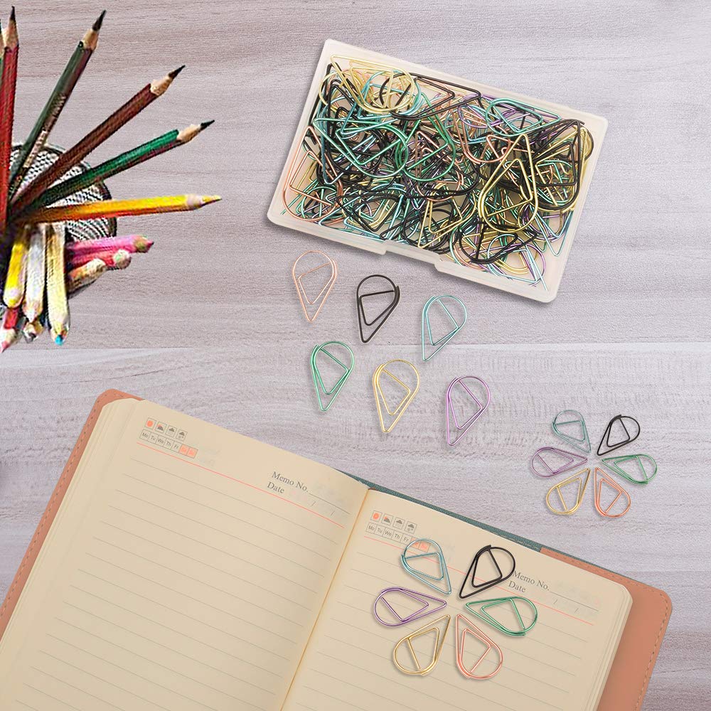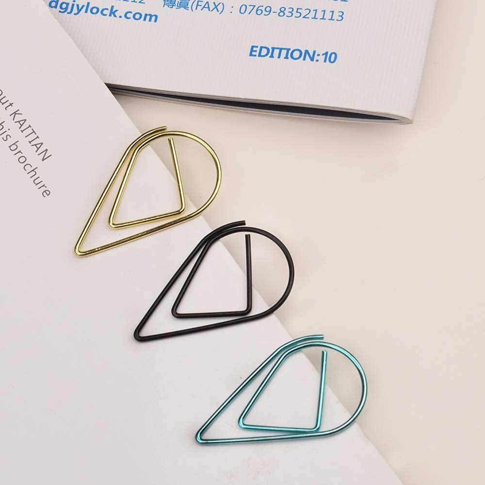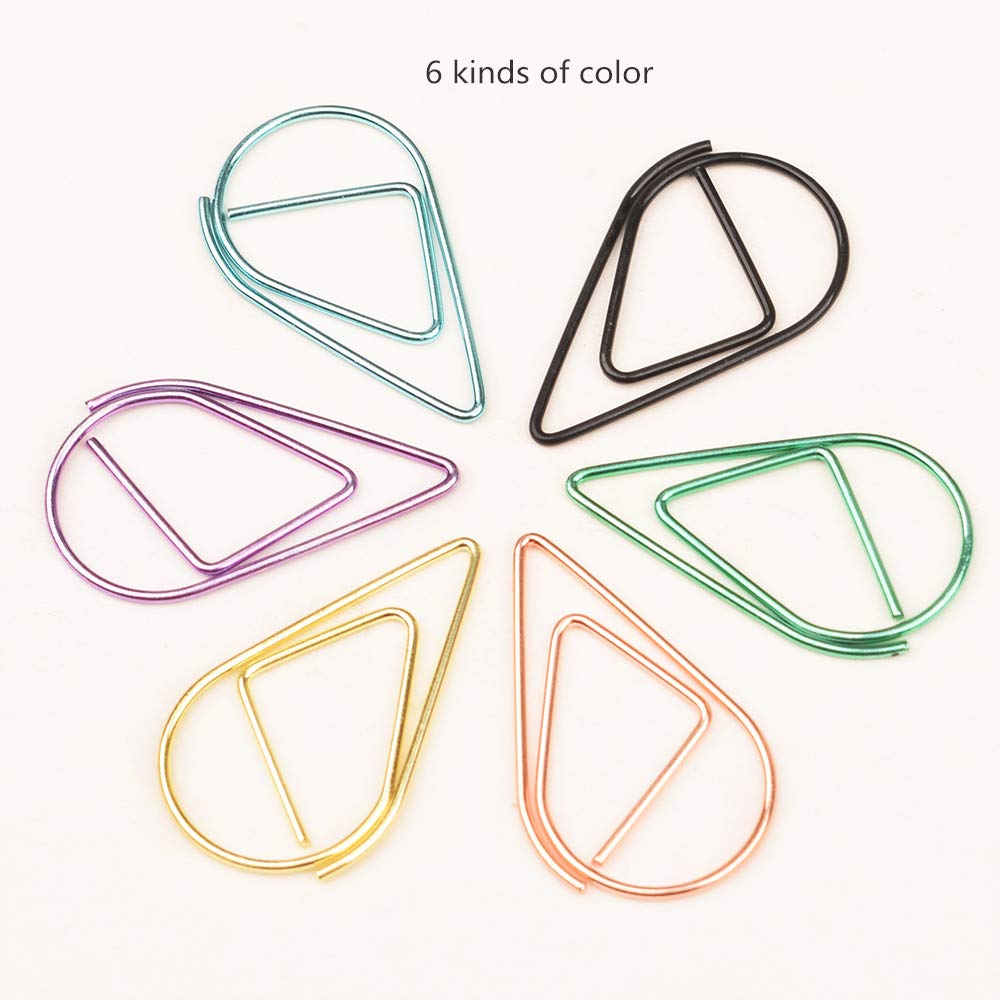 Delicate Design---The paperclips are in Water drop-shaped and shiny color, cute and exquisite, make your school or office life interesting and add more fun when you work.Water drop-shaped paperclips in 6 colors: includes black, gold, Pink Gold, purple, green and blue,A variety of colors can be effectively categorized,Make your day more organized.