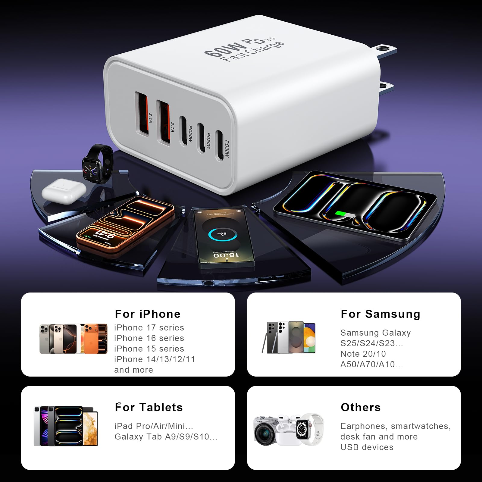【Twin-Pack Value | Reliable Support】Get TWO powerful 60W 5-port usbc charger blocks in this pack! (Cables not included). Backed by 24/7 friendly customer support – we're here to help anytime.