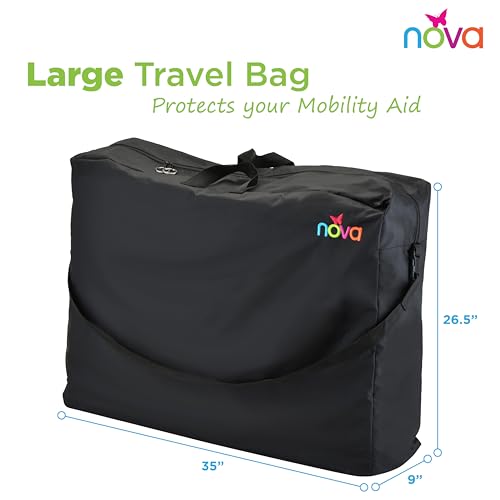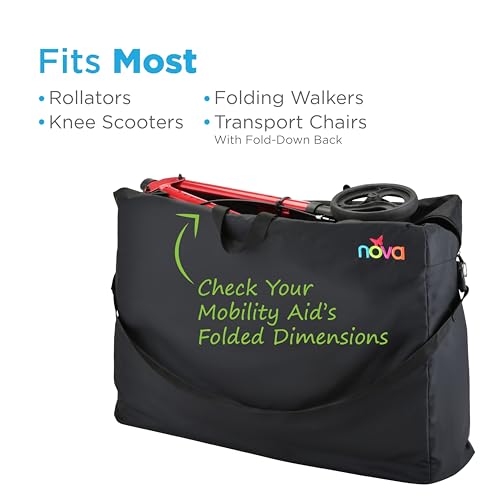 FITS ALL ROLLATOR WALKERS & TRANSPORT CHAIRS. Fits all rollator walkers and folding walkers (with the exception of the NOVA 4216 Mighty Mack Rollator). Note: Handles on rollator walker must be removed prior to placing the unit in the bag. Fits all transport chairs that have a fold down back (includes ALL NOVA model transport chairs). Will not fit transport chairs with a fixed back that does not fold down. Will not fit wheelchairs.