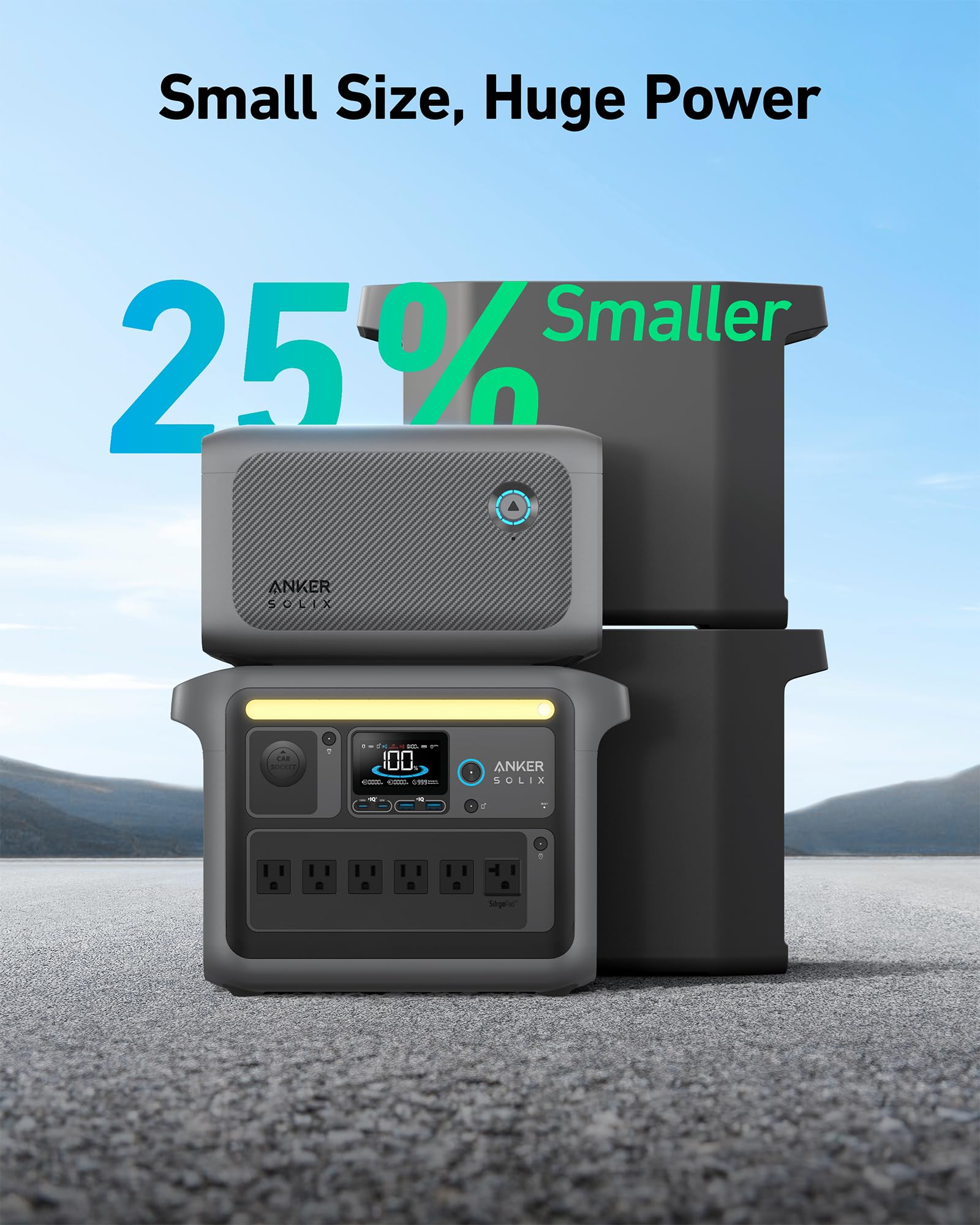 Compact, Now 25% Smaller: Less bulk, more space, no sacrifices in power. Easily carry Anker SOLIX BP1000 Expansion Battery and Anker SOLIX C1000 and power up the campsite.