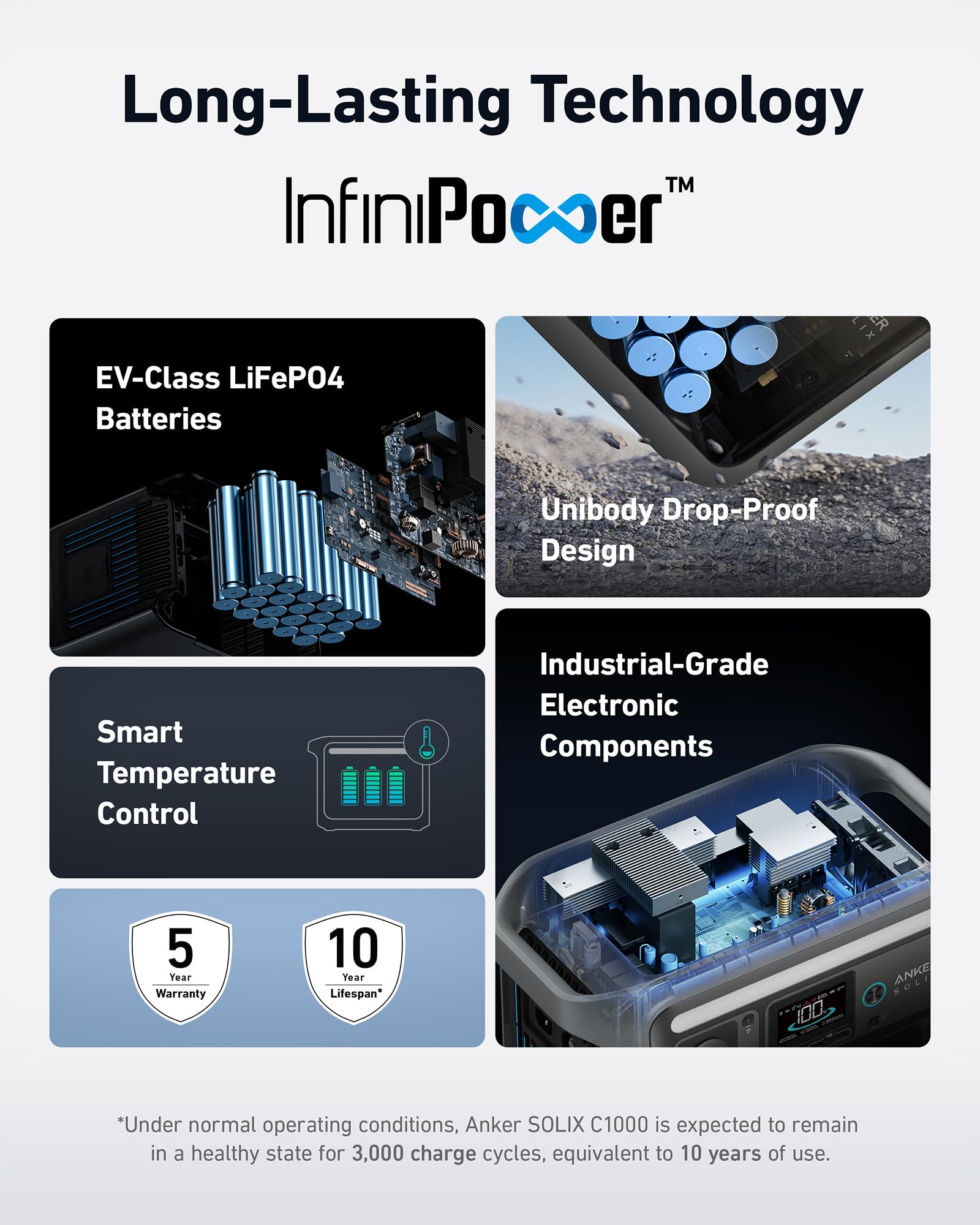 10-Year Lifespan, 3,000 Battery Cycles: Anker SOLIX BP1000 Expansion Battery features our proprietary long-lasting technology InfiniPower. The expansion battery powers up for over 3,000 battery cycles—or every day for 10 years.