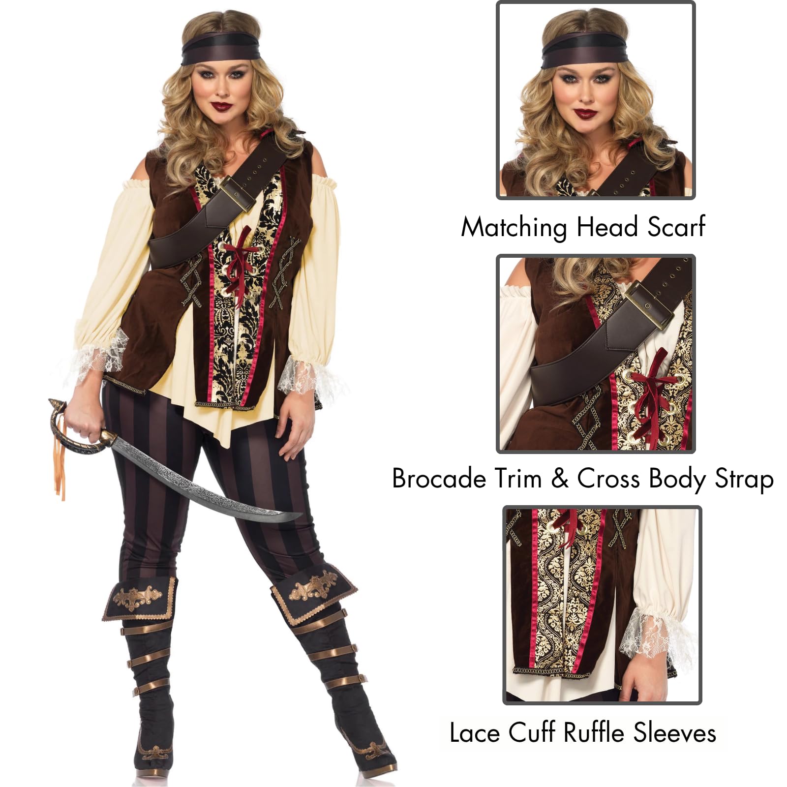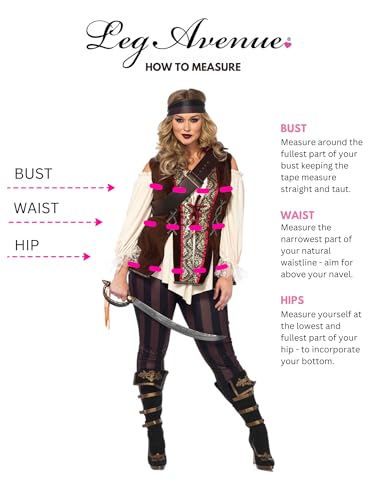 Description Raid the seven sea sin style in the beautiful Leg Avenue Captain Blackheart Pirate costume. This pretty privateer costume set includes a cold shoulder shirt vest with gold brocade trim, striped leggings, cross body strap, and matching head scarf. Show off that seaworthy body with the cinching lace up front, flirty cold shoulder design and eye catching split tail design. You've plundered the finest fabrics with the stretchy strip fabric, soft faux suede, and gold brocade accent. Top off this buccaneer beauty look with the matching strip head scarf and get to swashbuckling. Get your pirate crew ready by checking out the Leg Avenue collection of Pirate costumes for Women, Men and Kids. Great for Halloween, Gasparilla Festival and theme costume parties. Why Leg Avenue? Whether you want to wrap up in glamorous vibes or extra cozy ensembles, our goal at Leg Avenue is to make everyone feel confident and cute no matter the occasion. From costumes to lingerie to festival wear, Leg Avenue has a little something something for everyone.