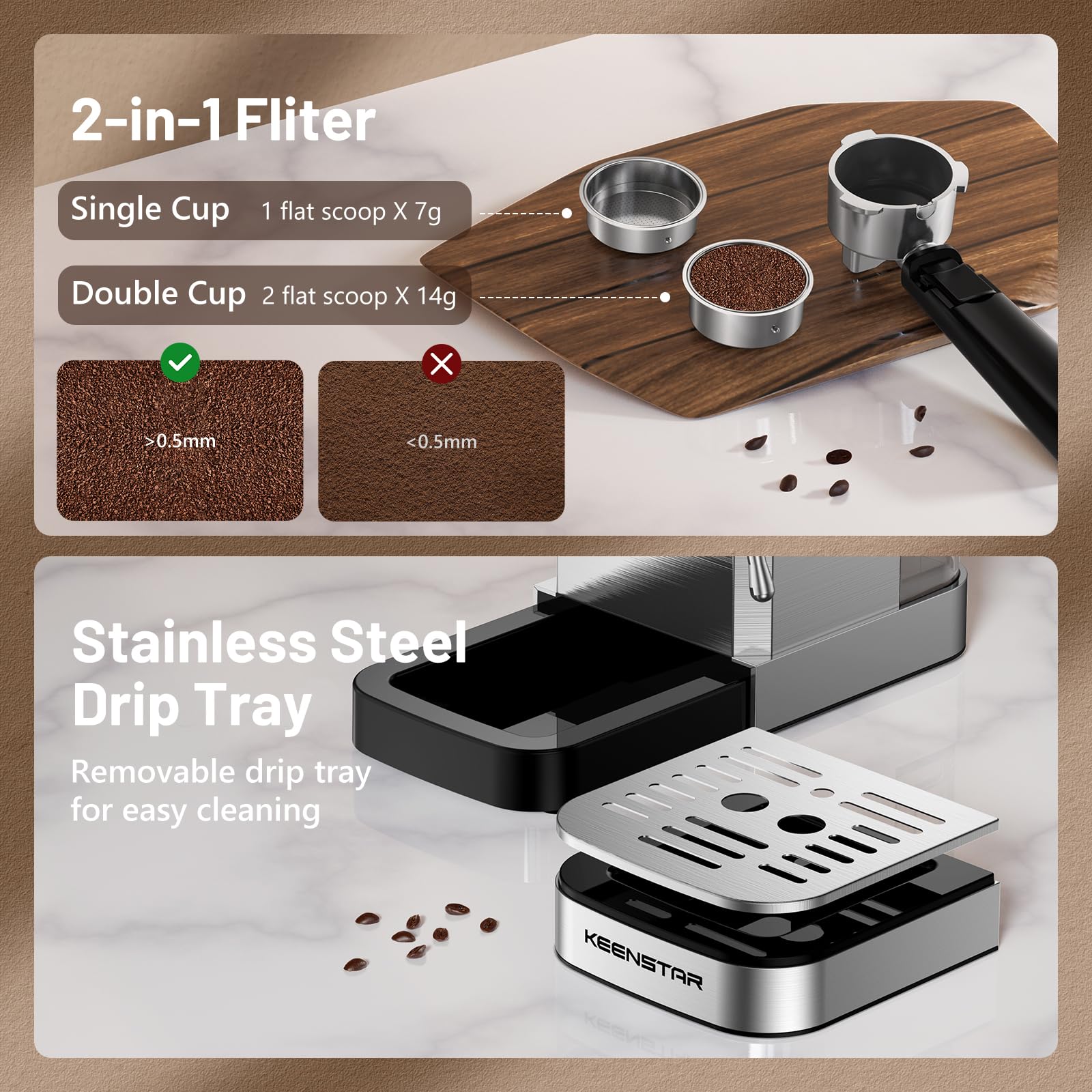 【Powerful Milk Frothing System】: Keenstar espresso machine with milk frother has a powerful steam wand, so you can texture creamy, rich microfoam milk to create amazing milk foam art and enhance the flavor of your brews. Accurate temperature control can ensure the best taste. Create your own unique milk foam art, make your favorite espresso coffee at home.