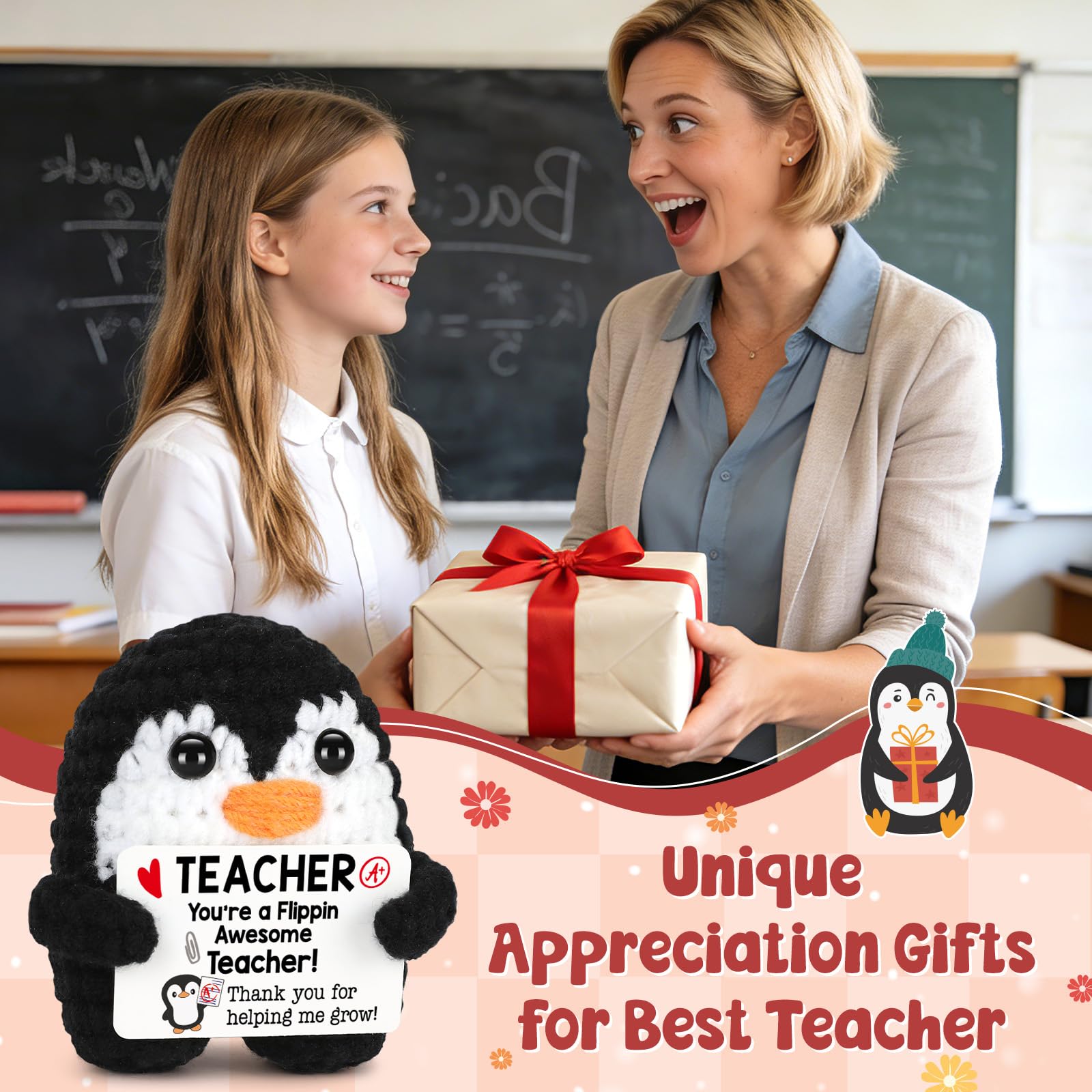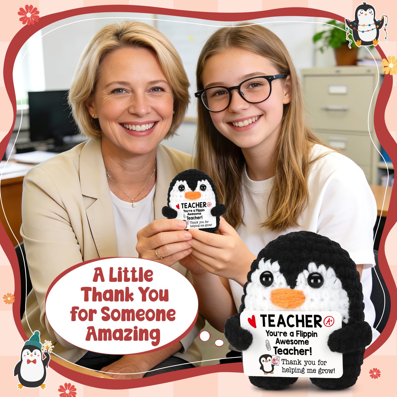 Appreciation gifts for Teachers: Express your gratitude to the teachers who make a difference every day with this adorable handmade crochet penguin. Holding an “A+” card and the heartfelt message “Thank you for helping me grow!”, it’s a playful yet meaningful way to say thanks and make your teacher smile