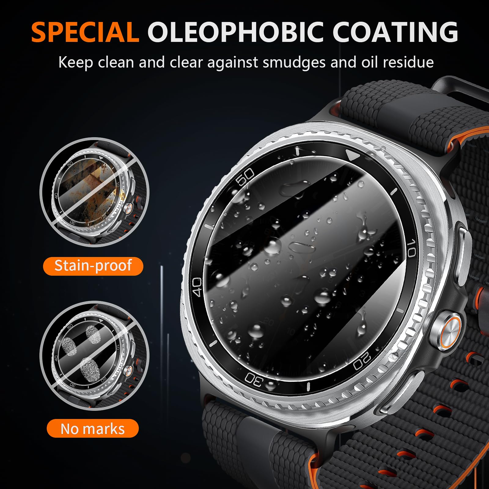 Product Material:Watch screen protector made of tempered glass Privacy film,gives you a better feeling than a bare screen.99.99% hydrophobic and oleophobic screen coating protects against sweat dirt,dust and oil residue from fingerprints.