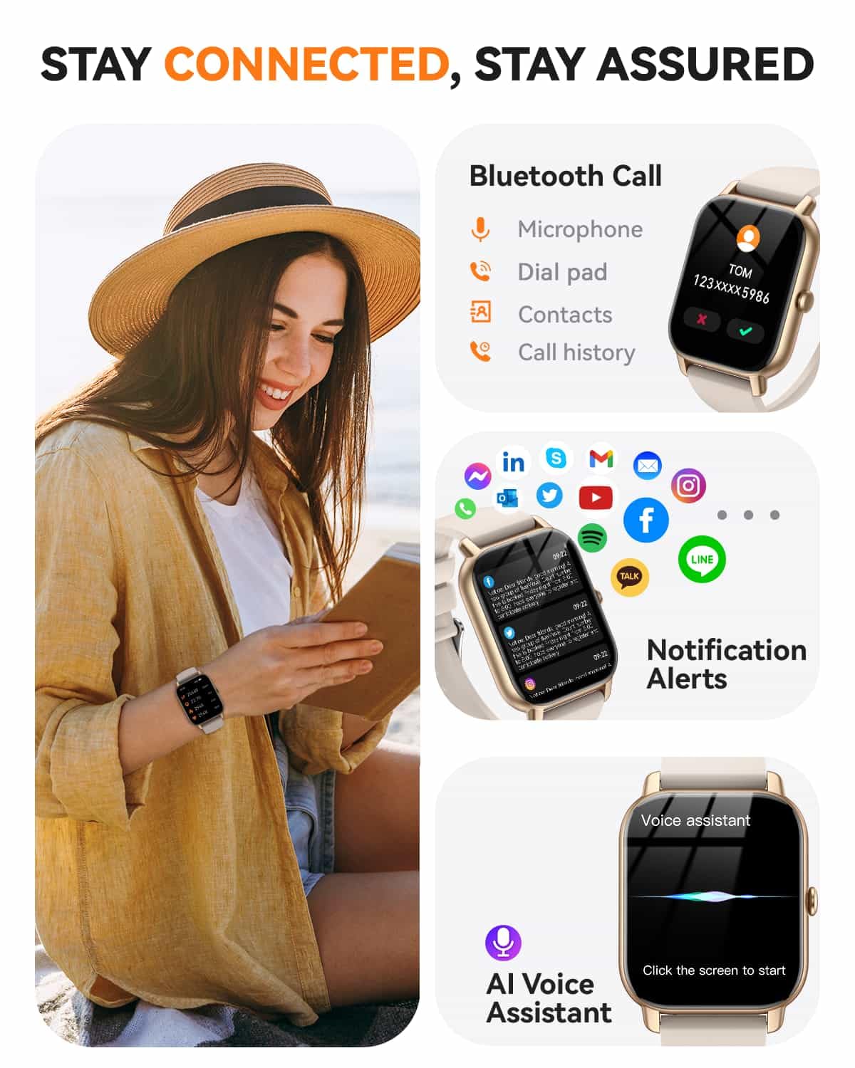 Stay in Touch with Ease:** Take calls, get notifications from Instagram, WhatsApp, and TikTok, enjoy your favorite tunes, issue voice commands, and stay updated on all alerts. The smart watch offers convenient communication at your fingertips.