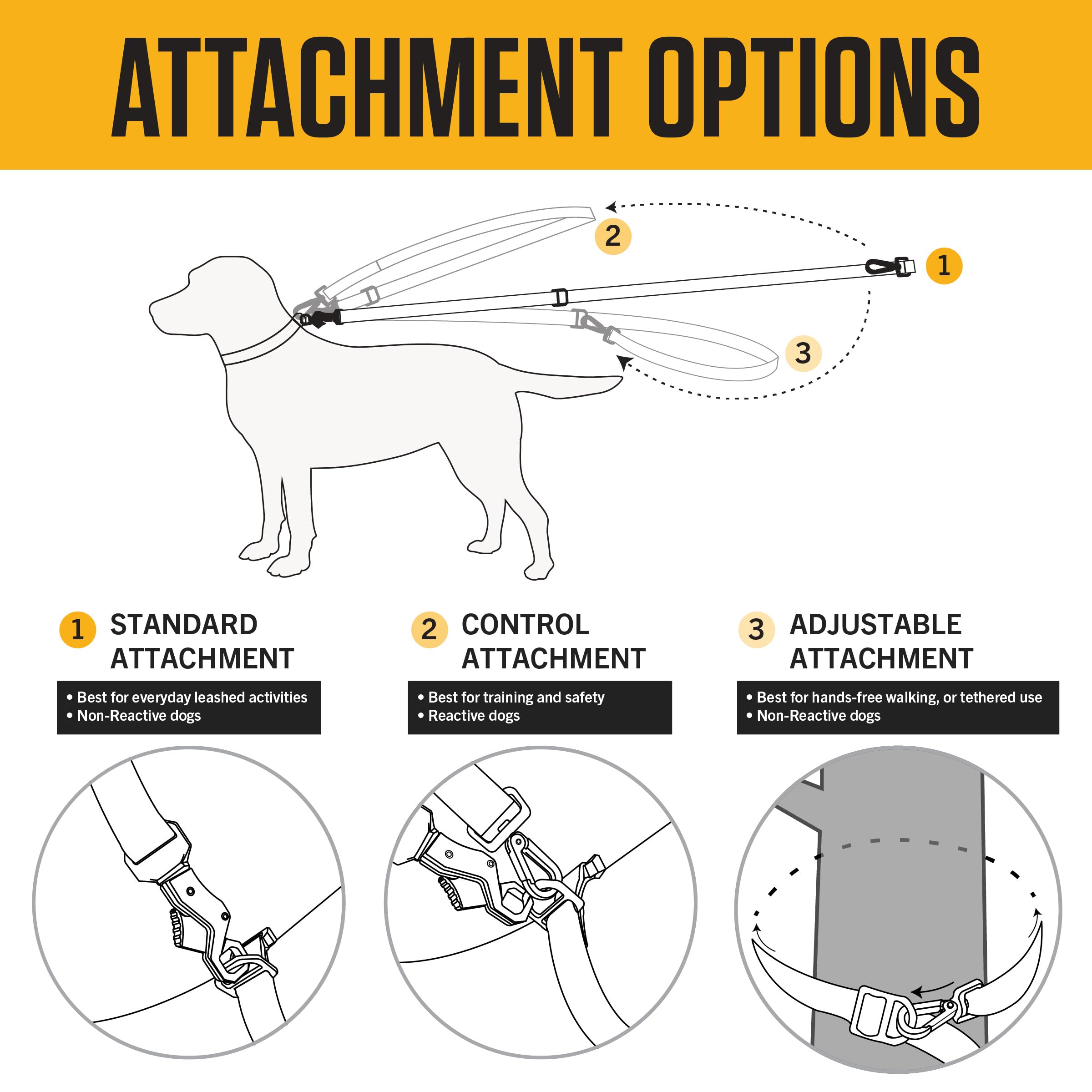 Multiple quick attachment options for tethering, and reflective triple-needle stitching for visibility in low-light situations. Rugged slotted metal D-ring that maneuvers up and down leash for adjustable attachment