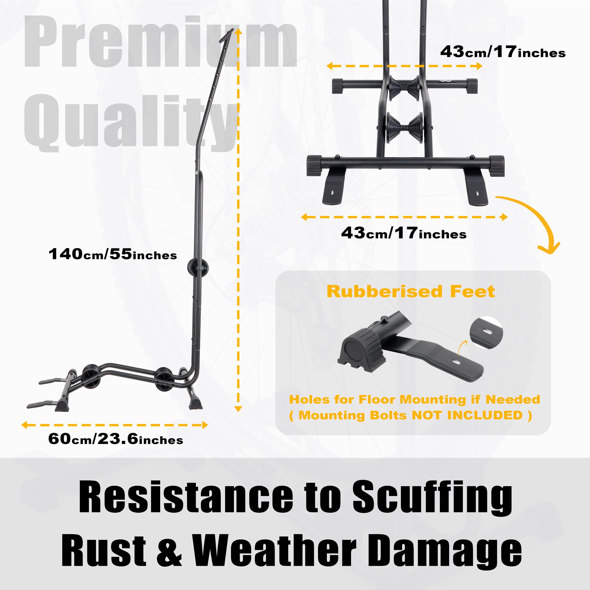 STABLE & SECURE: A sturdy bike rack that holds your bike firmly and securely in either position. The three rollers and hook on the rack are all fully adjustable to fit bikes of different sizes and firmly keep your bike in place without wobble. Thanks to the 3 adjustable pulleys system, this bike floor parking rack keeps the bike upright or horizontal perfectly, and it's also straightforward to use. The rubberised feet have holes for floor mounting if needed (MOUNTING BOLTS NOT INCLUDED).