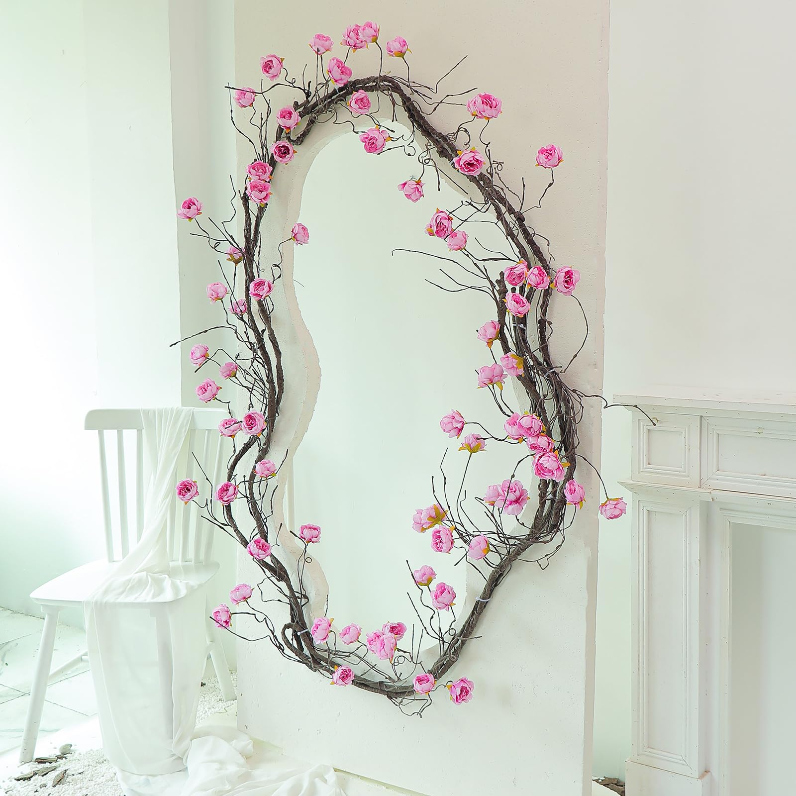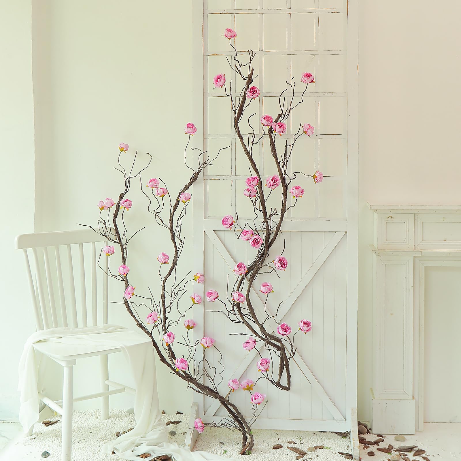 【Abundant application scenes】You can have a 2D-3D effect created with this flower tree vine in bedroom or living room background, or hang into into wall, hang over to canopy/fireplace/hallway. With malleable hydrangea flower cane to deccor for romantic vibe. It can be apply to wedding arch, DIY into wreath, artificial flower tree onto wall, habitat enclosure ect.