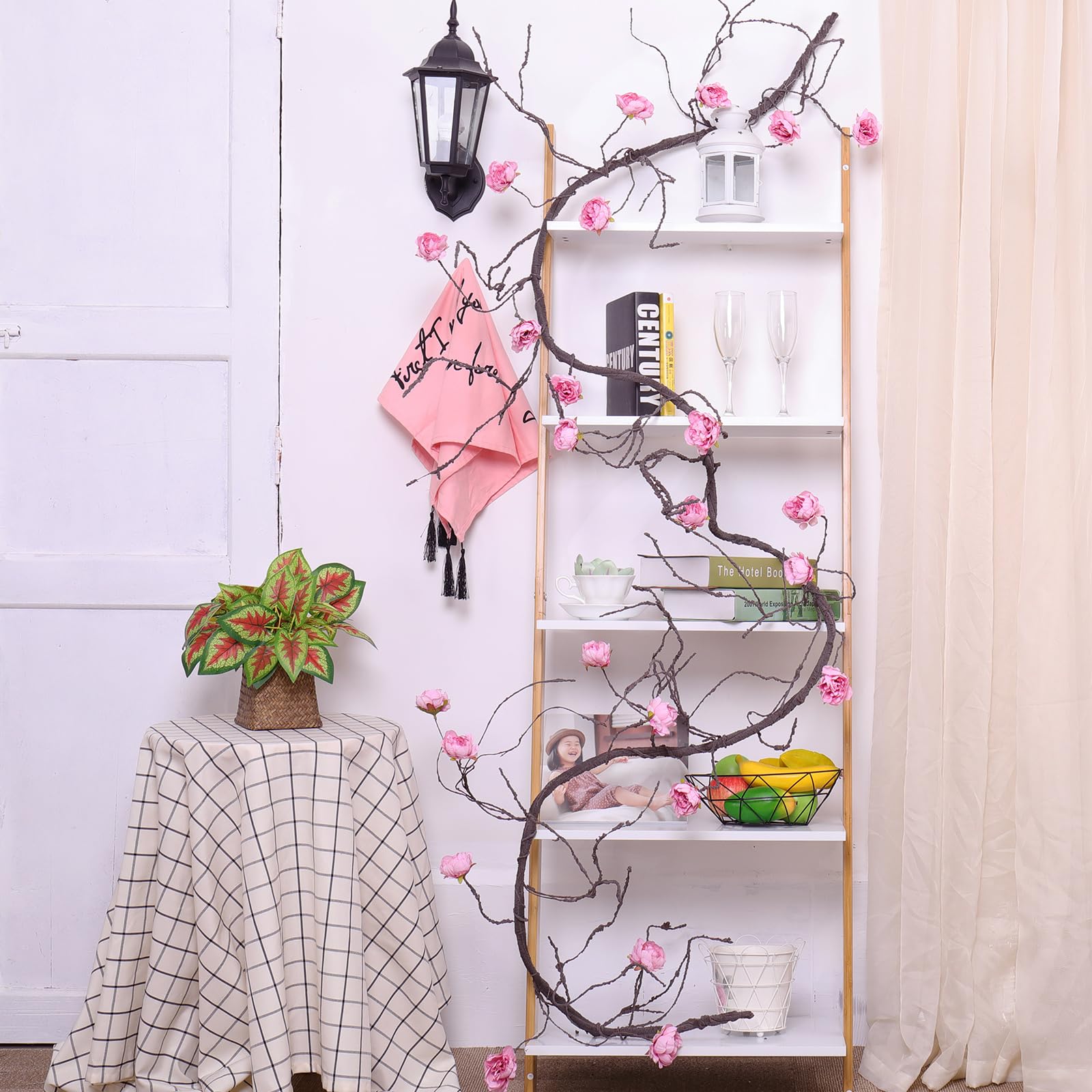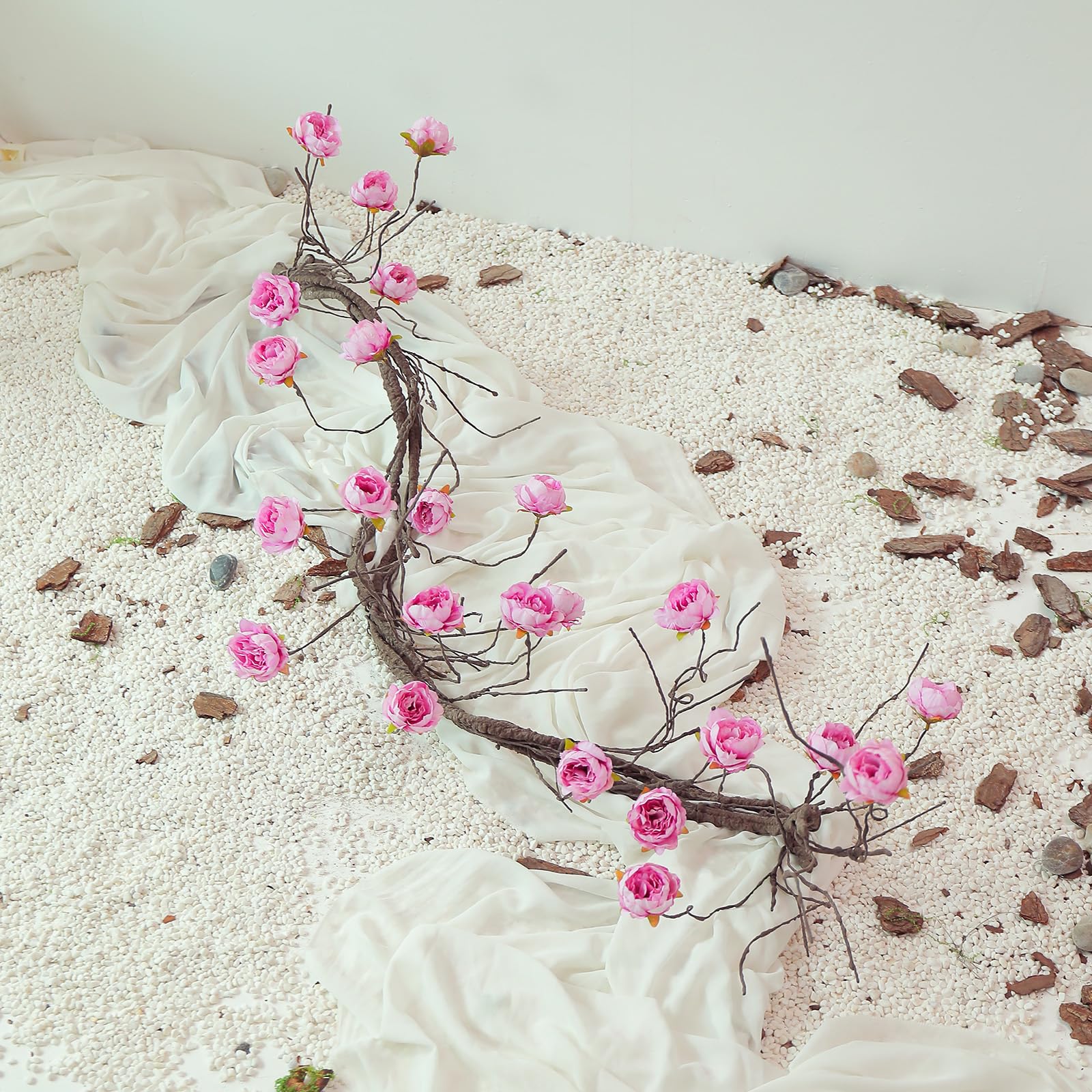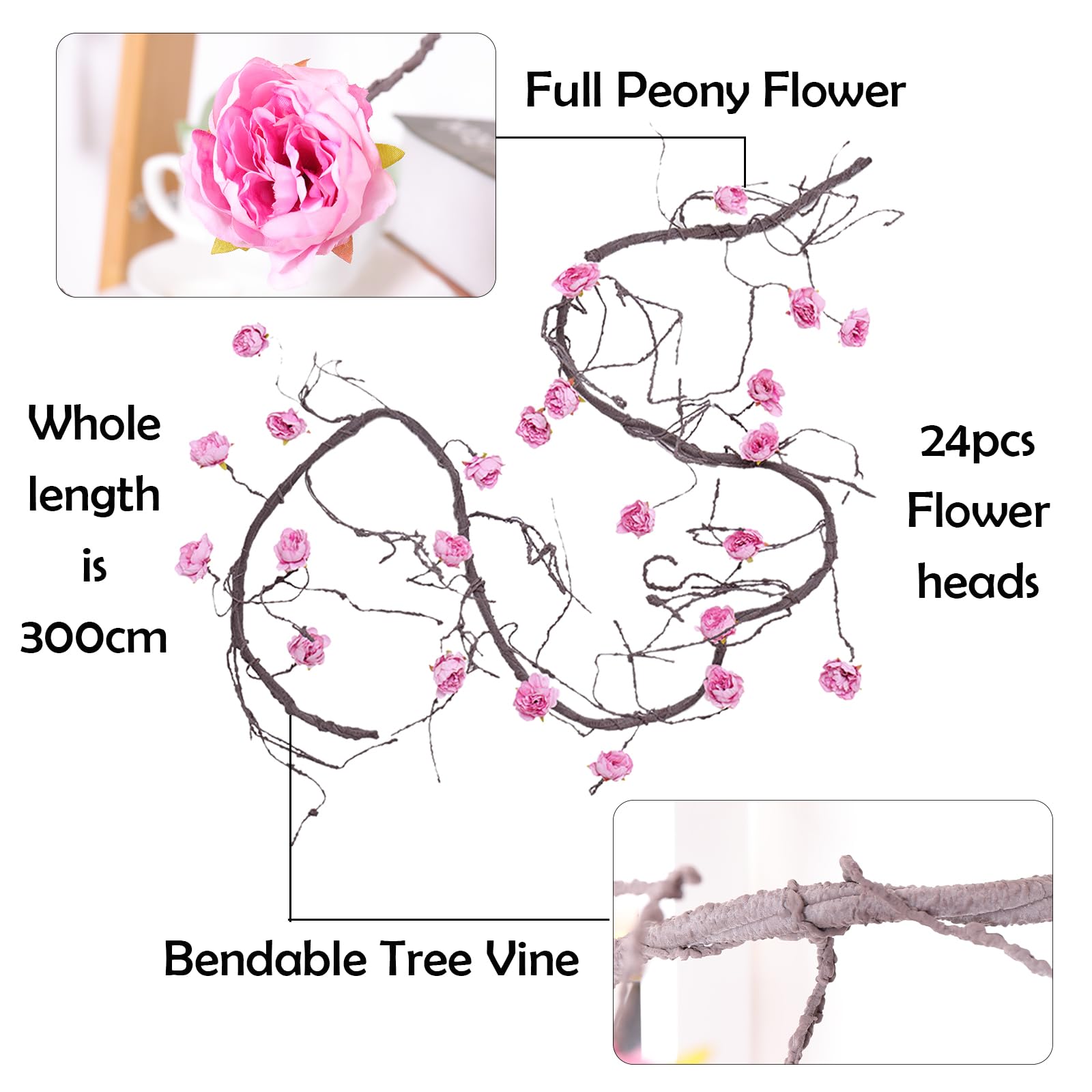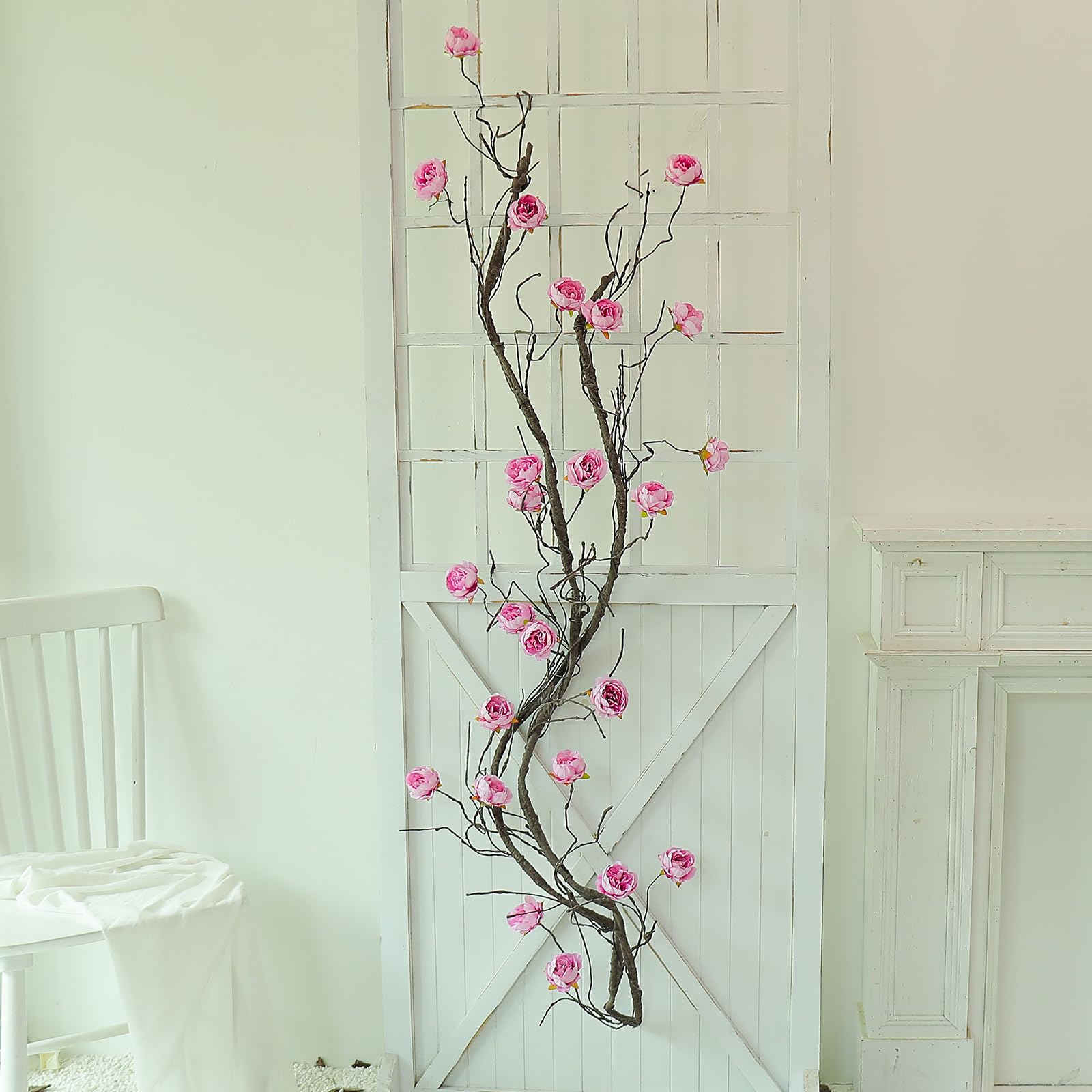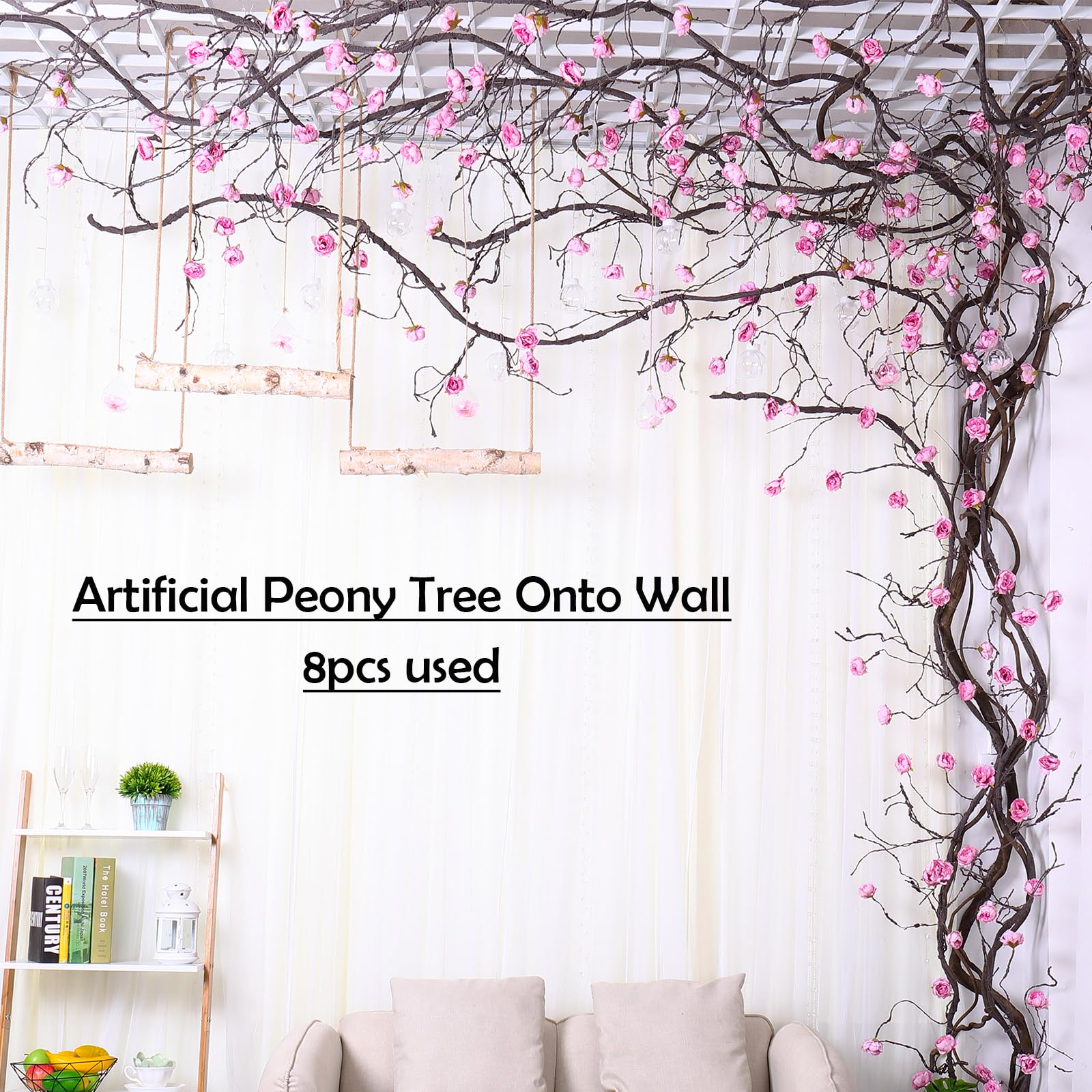 【Feature】Realistic brown tree barky vines match with vivid big peony flower heads, 2 in 1, no need to add any extra flowers or plants. One long piece plants cane can meet all your decorative need. Light weight and easy to hang and stay hung.