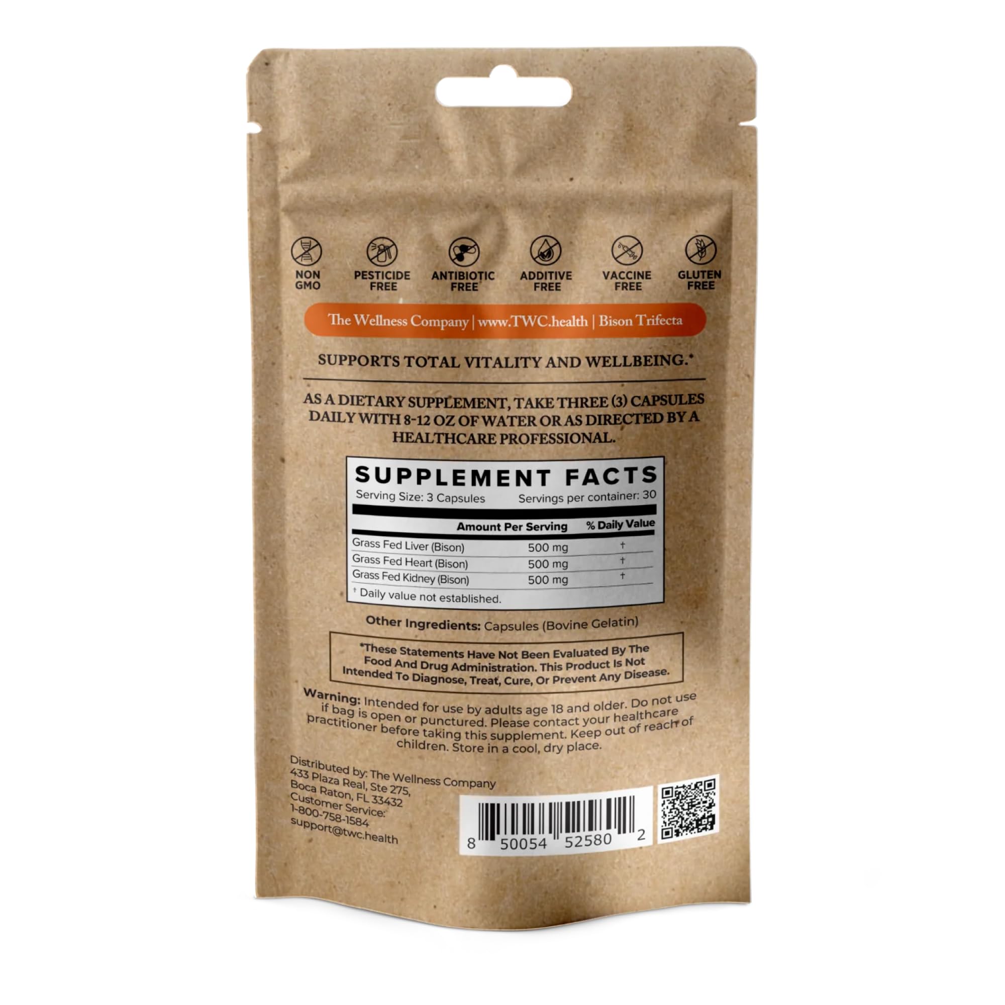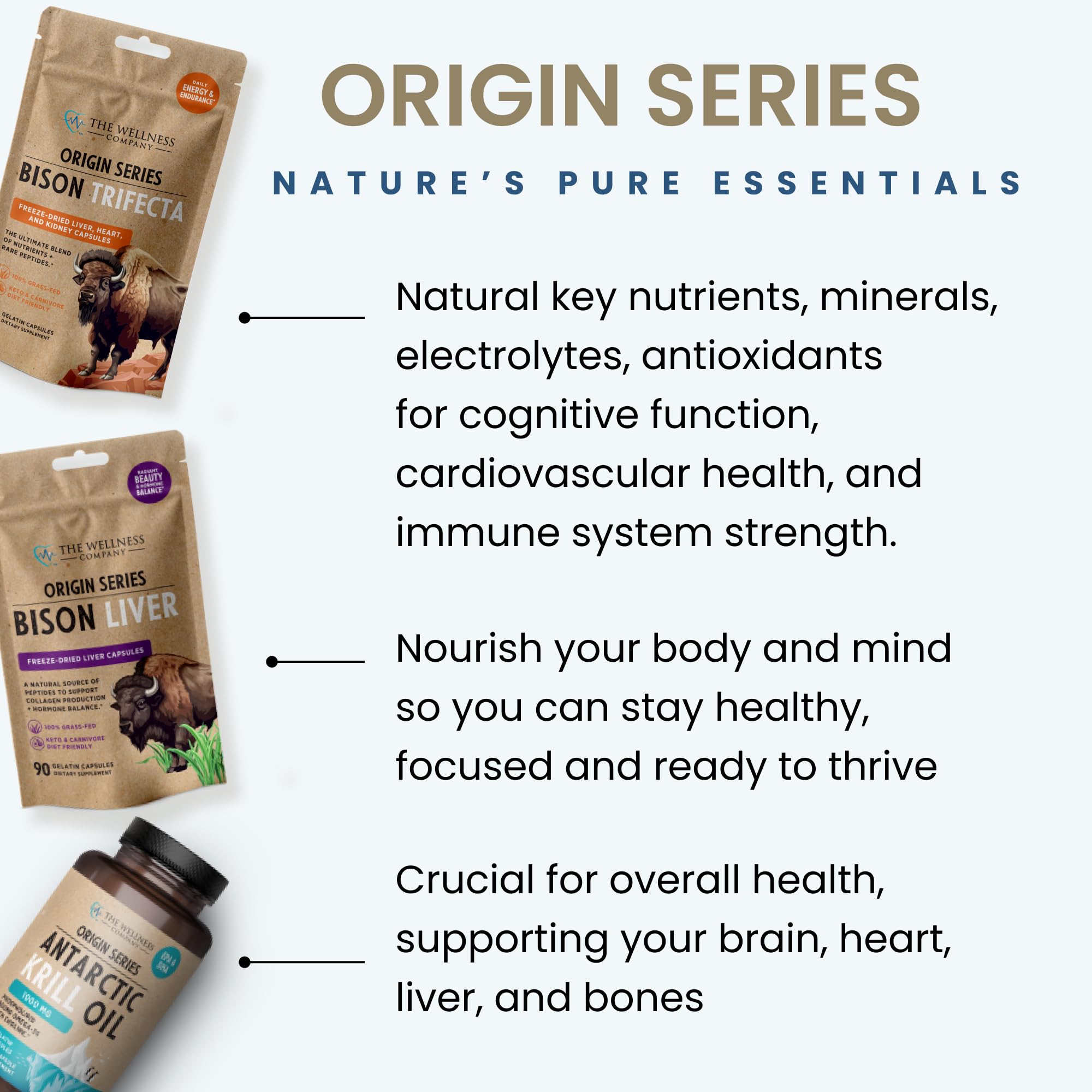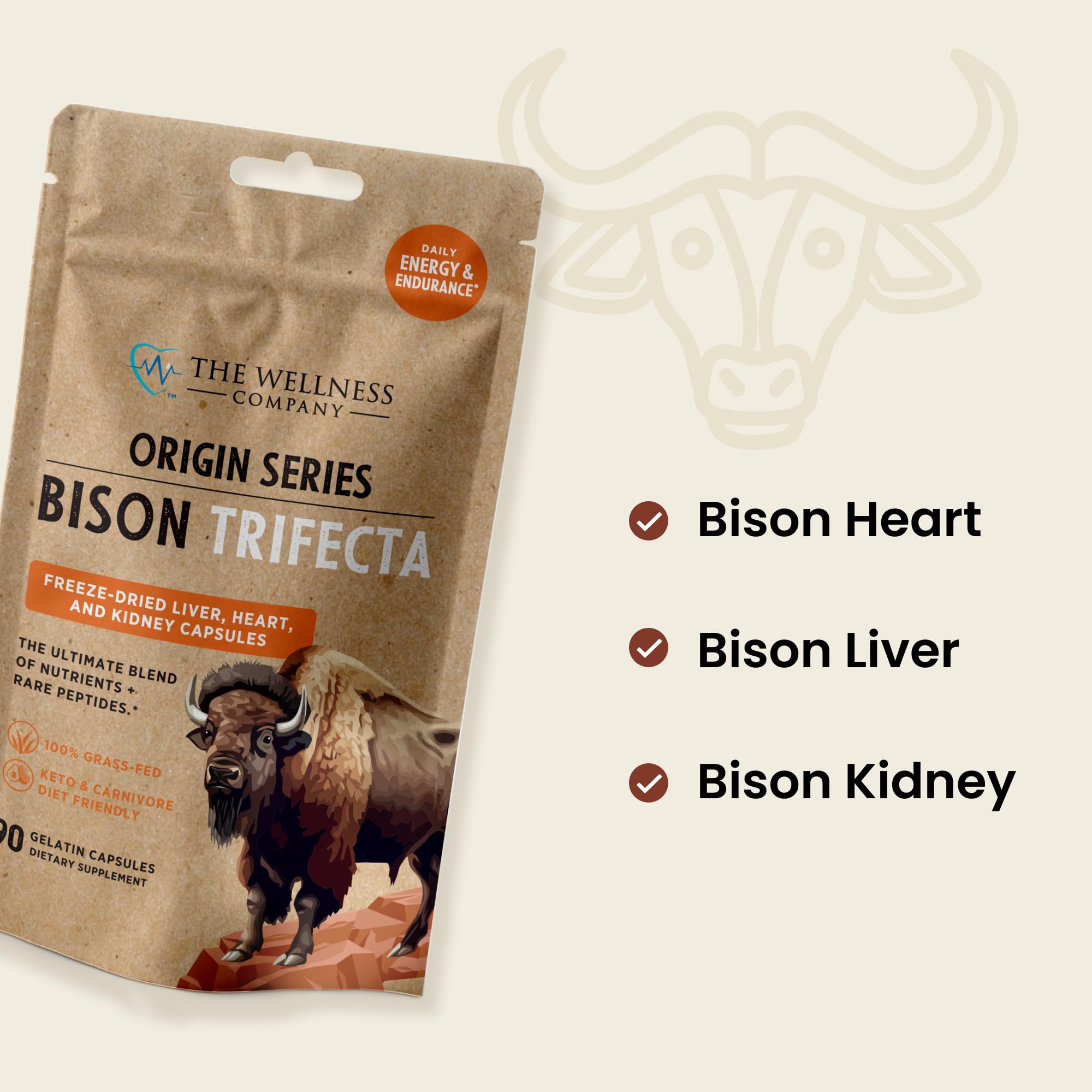 Support your daily vitality with The Wellness Company Origin Series Bison Trifecta Freeze-Dried Organ Capsules, the ultimate blend of nutrients plus rare peptides.