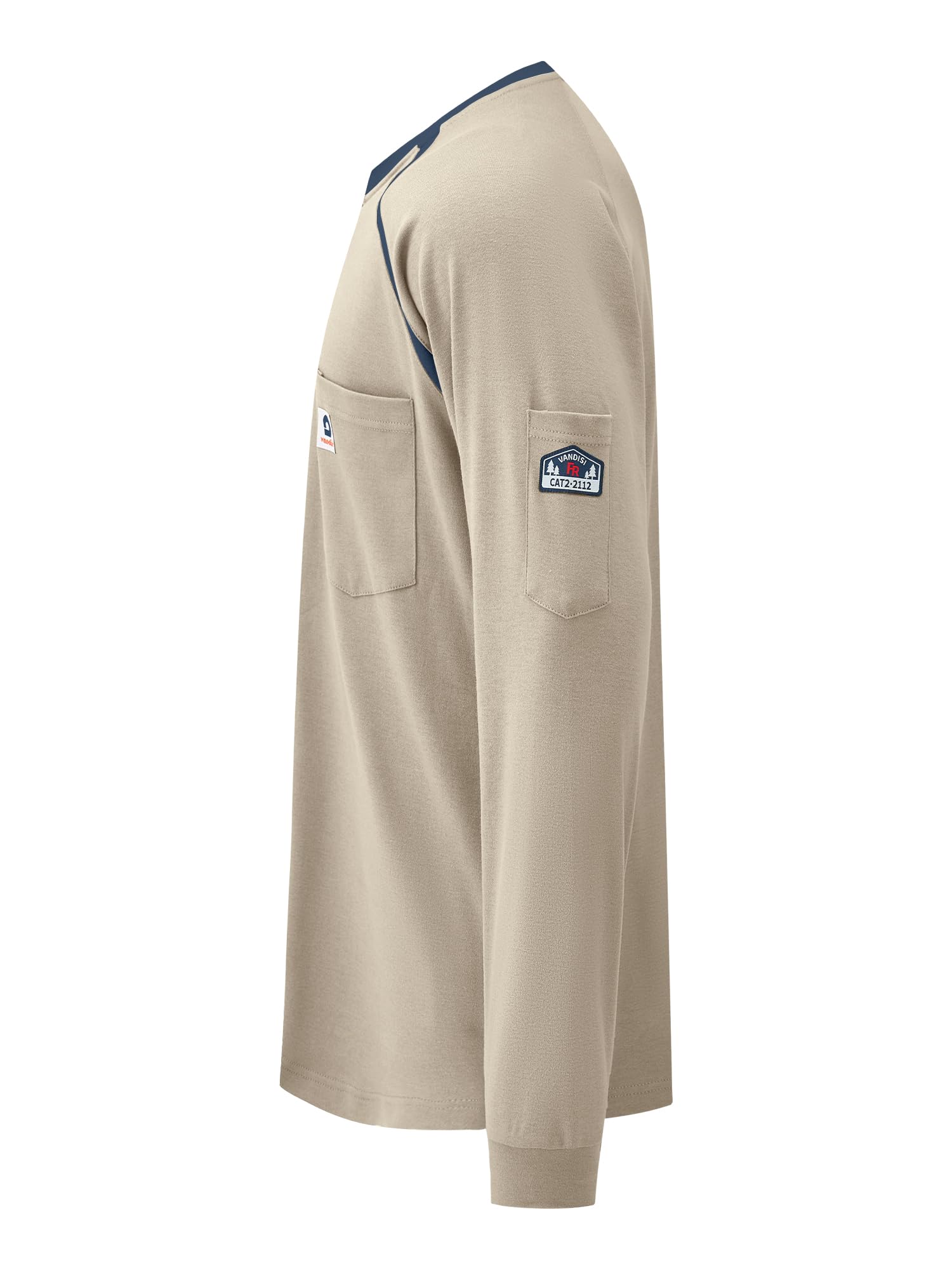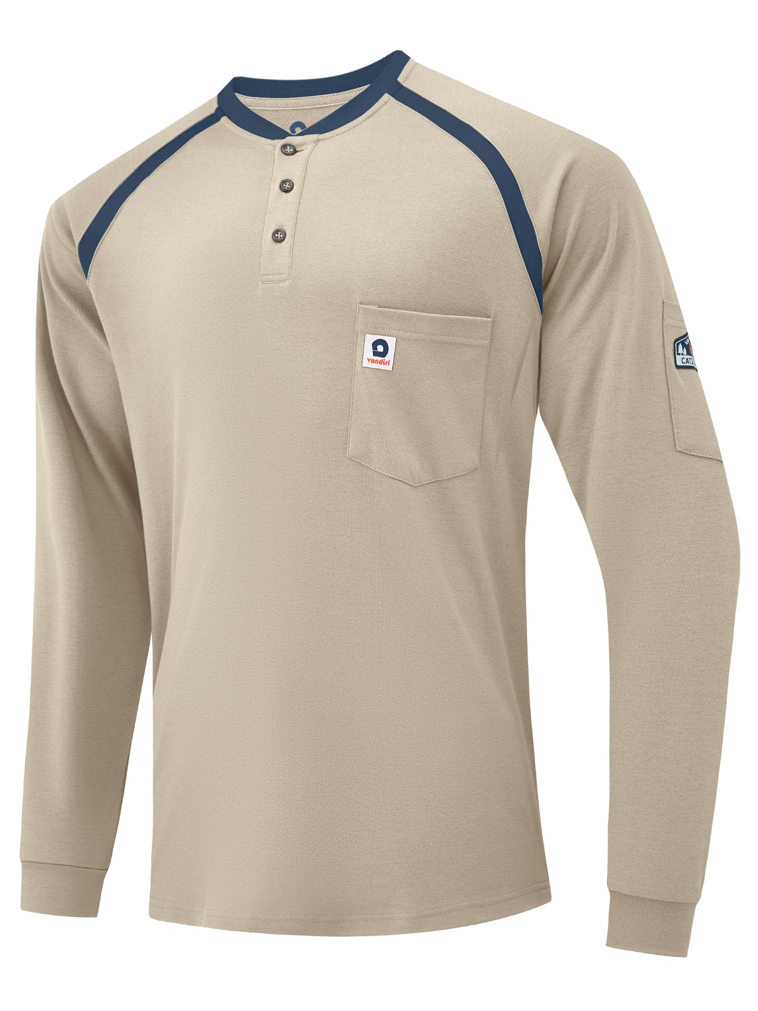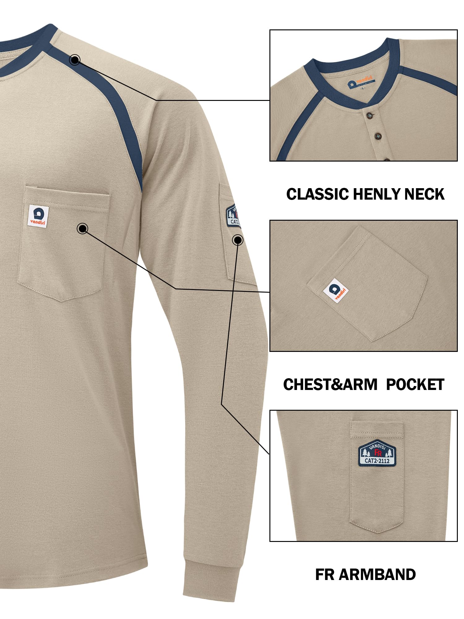 【Humanized Design】The Vandisi CAT 2 FR shirt features high-density seams and thermal transfer labels neckline for a true comfort experience. Henry collar and rib knit cuffs, enhanced fabric durability and stretch provide ease of movement and longer-lasting wear. Raglan sleeves significantly improve the fit of the shirt, 1 left chest pocket and 1 sleeve pocket for great convenience!