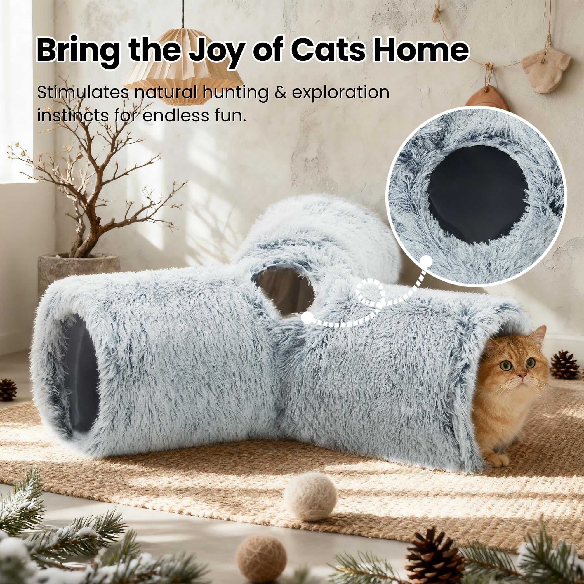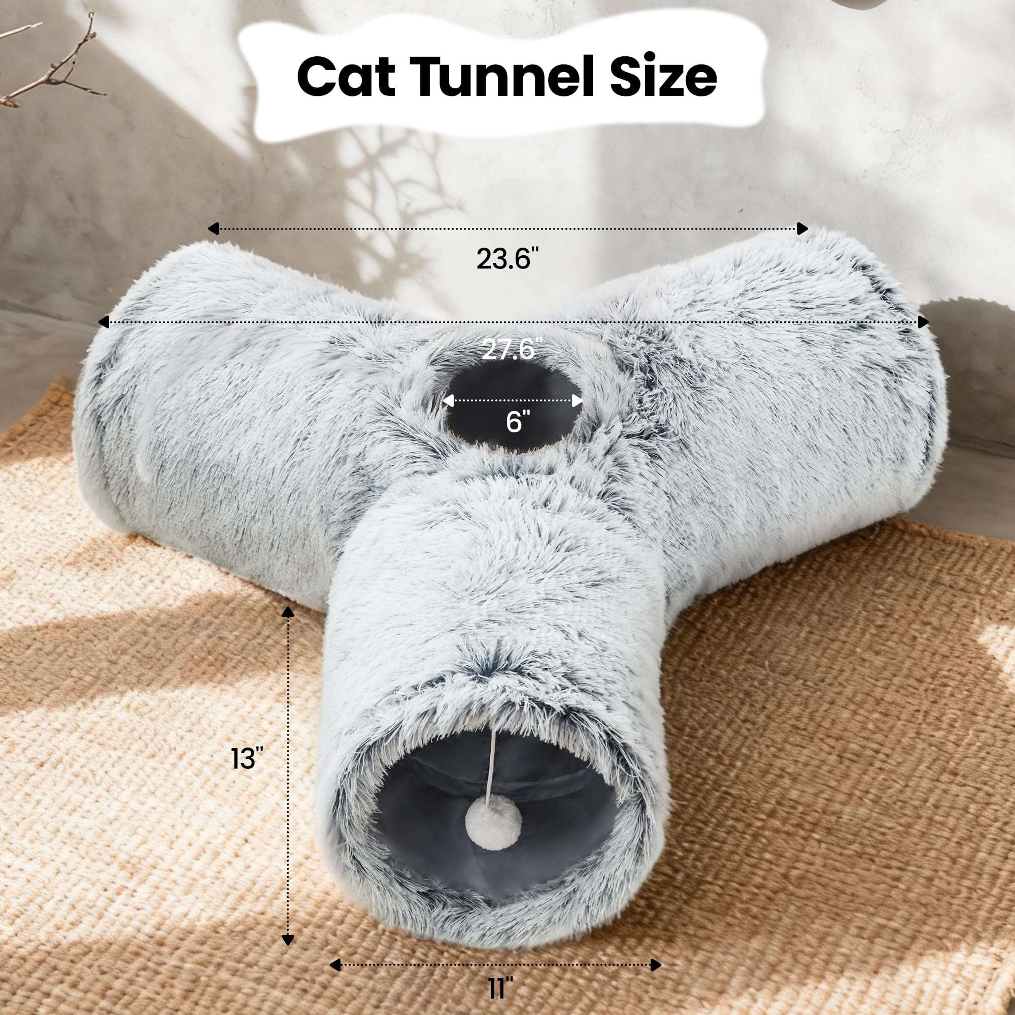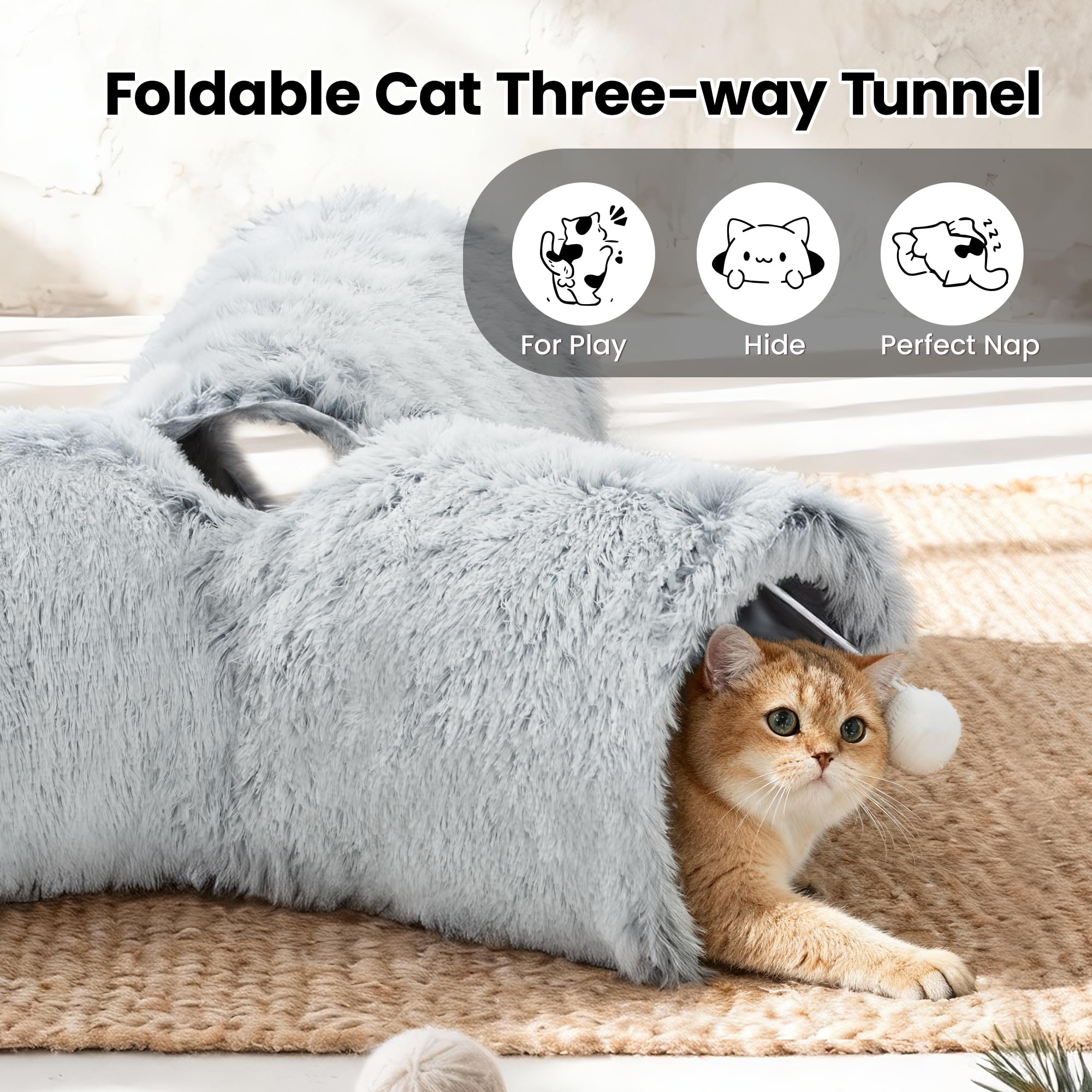 Best Ways to Play: Our cat tunnel with 3 spacious tunnels, peephole & beall toy, this popular cat toy gives your kitty more ways to have fun. Provides hours of exercise & self-amusement.And its furry appearance can decorate your room, giving you a beautiful experience.