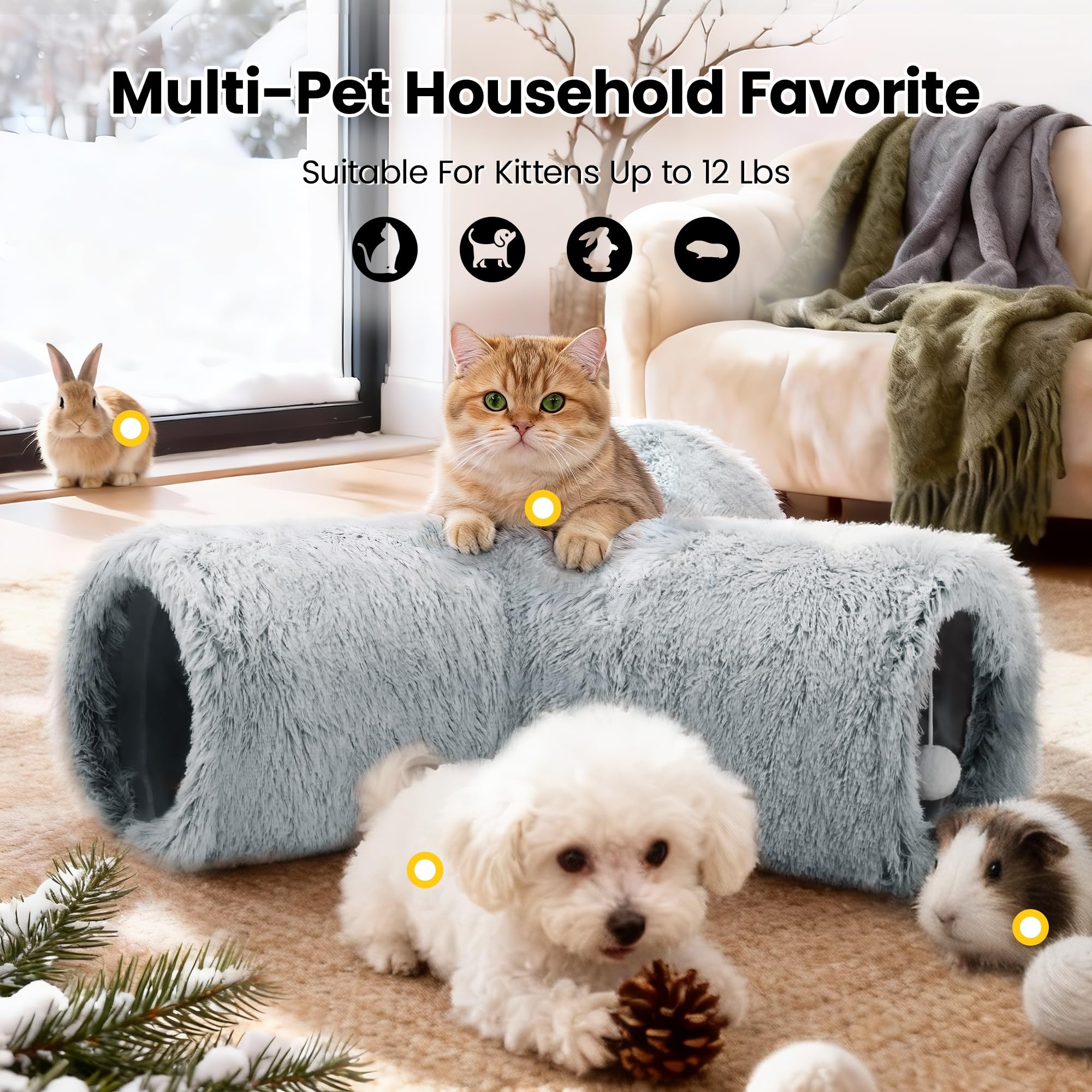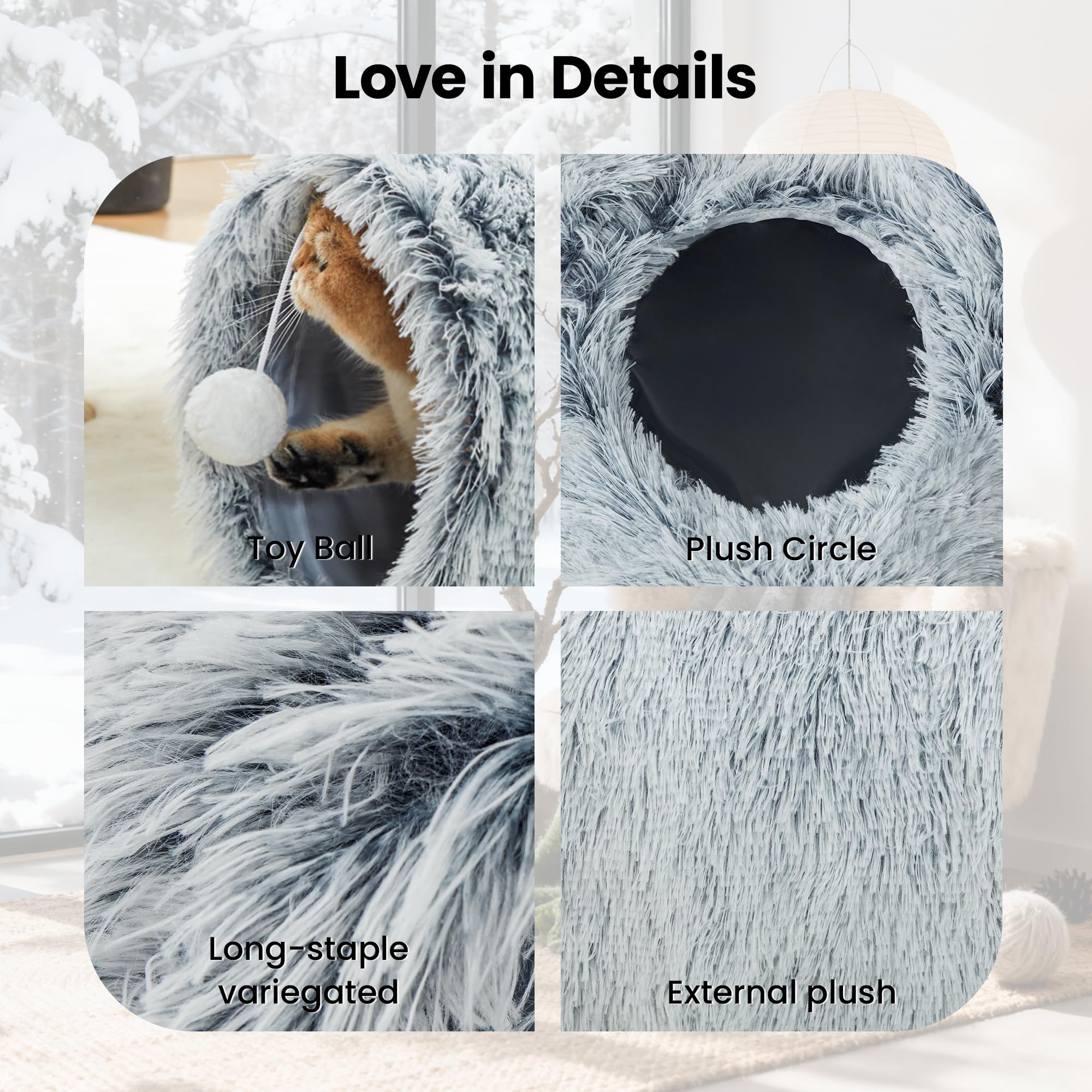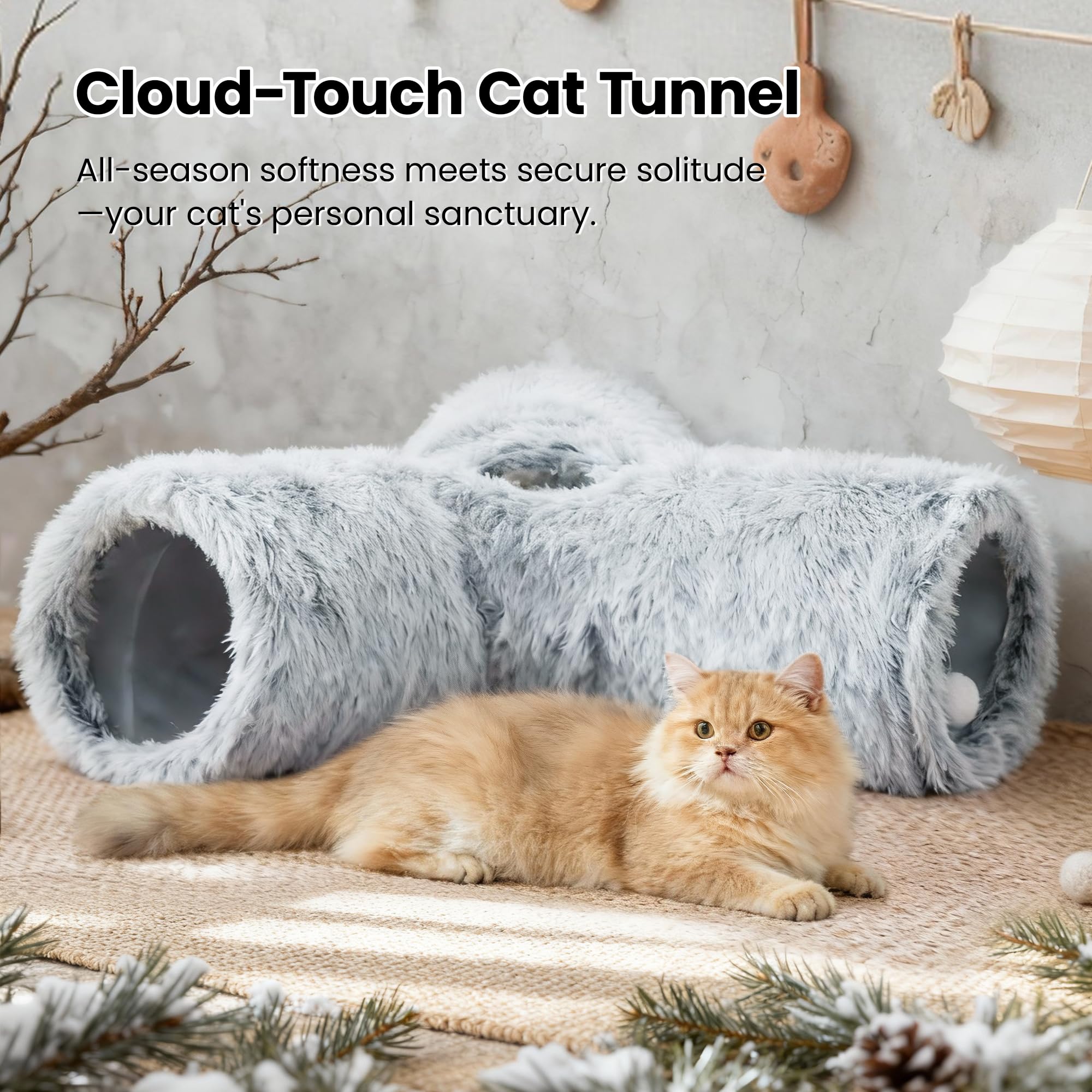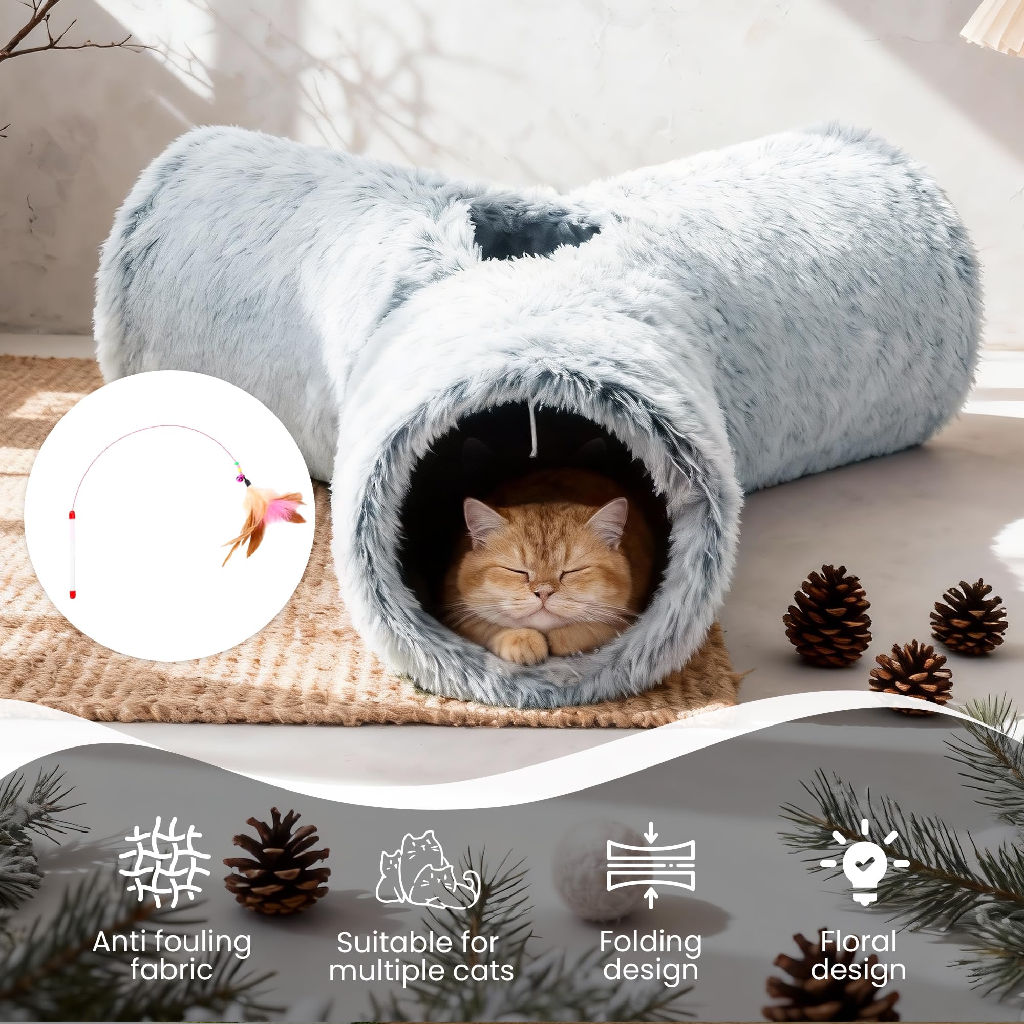 Best Ways to Play: Our cat tunnel with 3 spacious tunnels, peephole & beall toy, this popular cat toy gives your kitty more ways to have fun. Provides hours of exercise & self-amusement.And its furry appearance can decorate your room, giving you a beautiful experience.