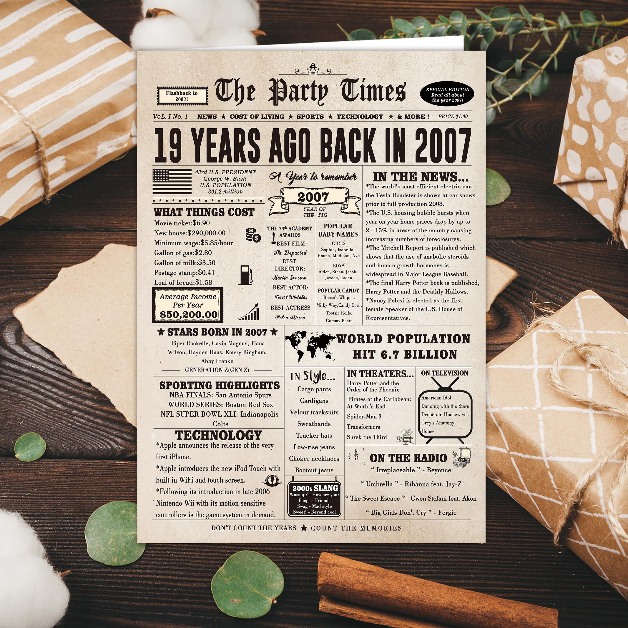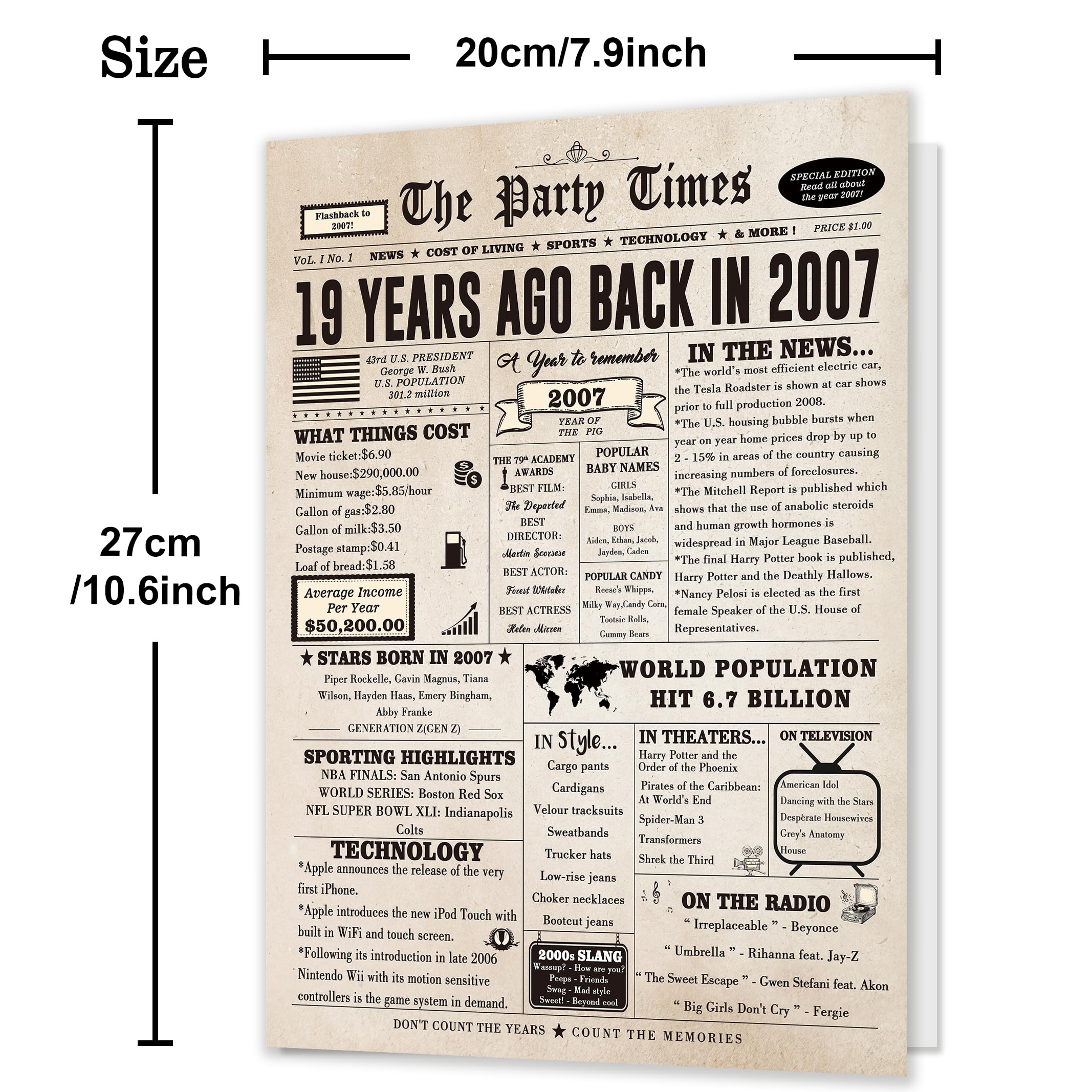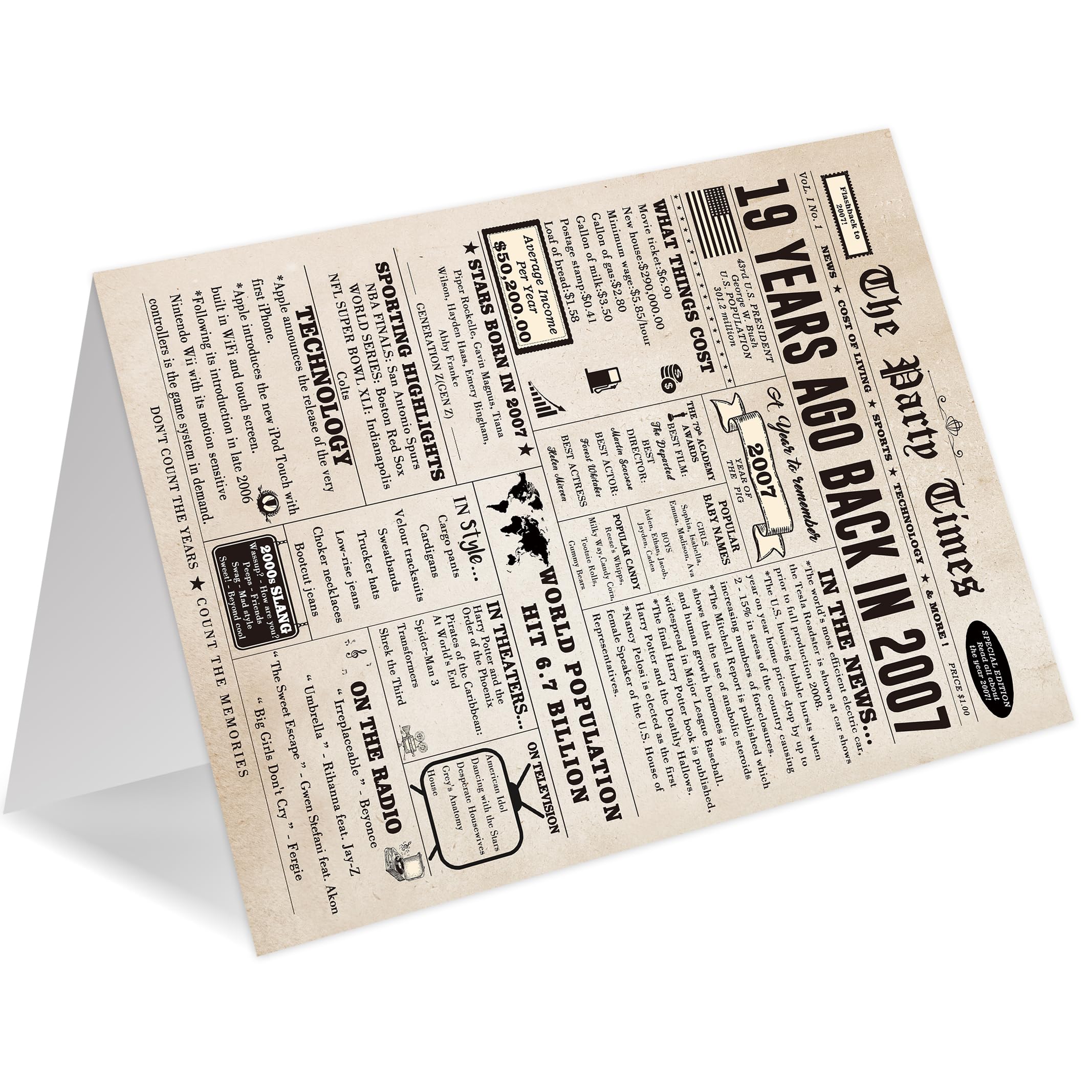 This large 19th birthday card features a vintage newspaper design, showcasing important events, movies and sports events from 19 years ago
