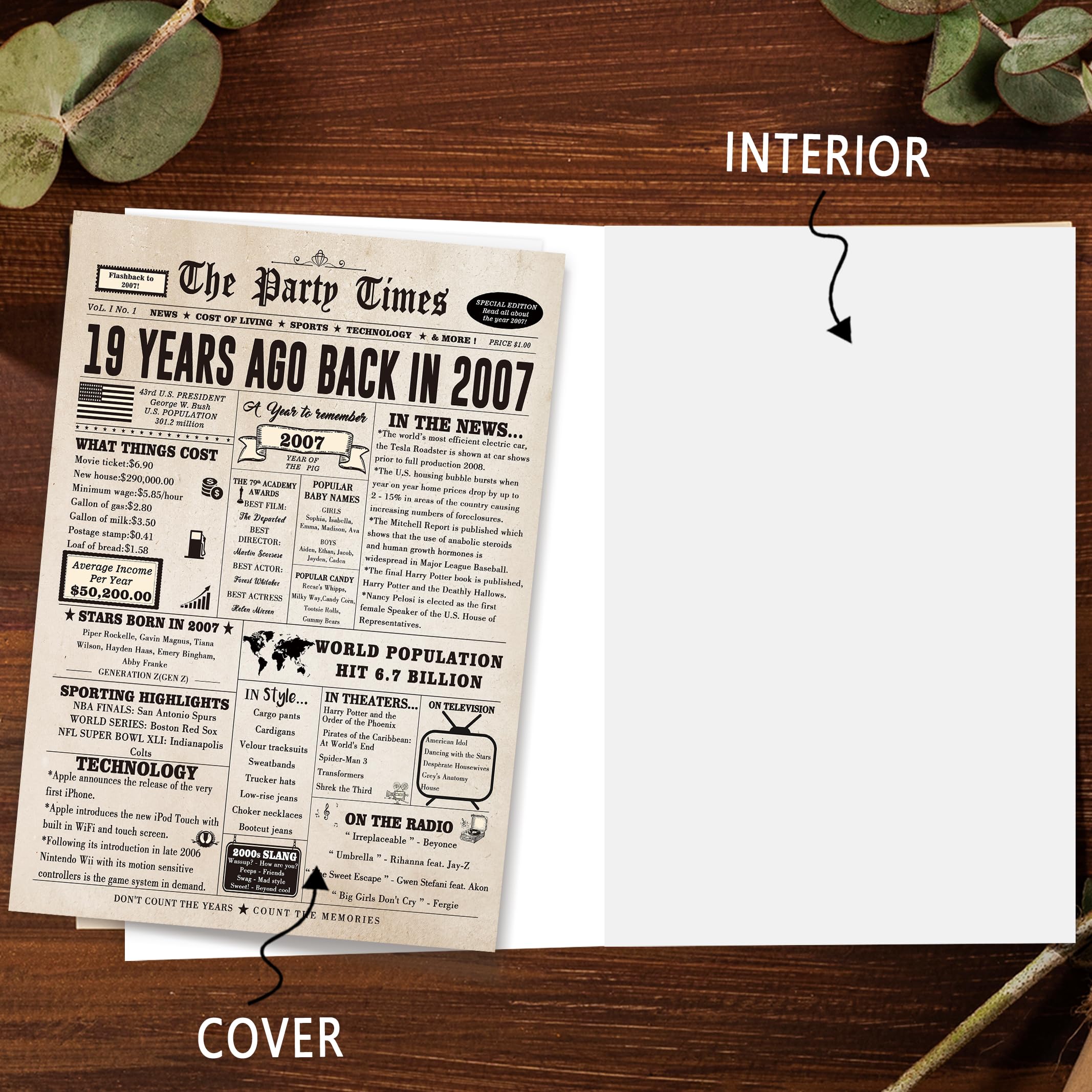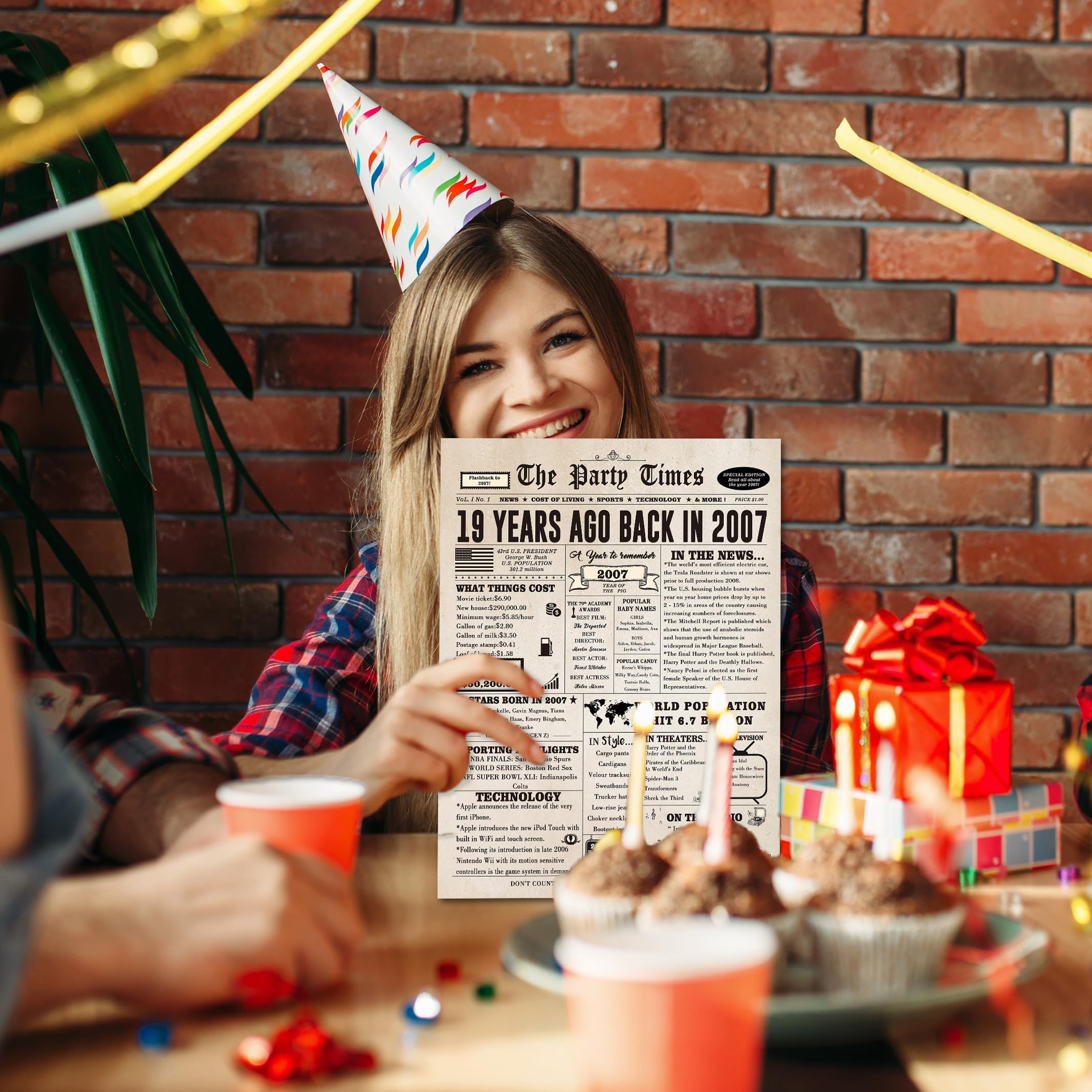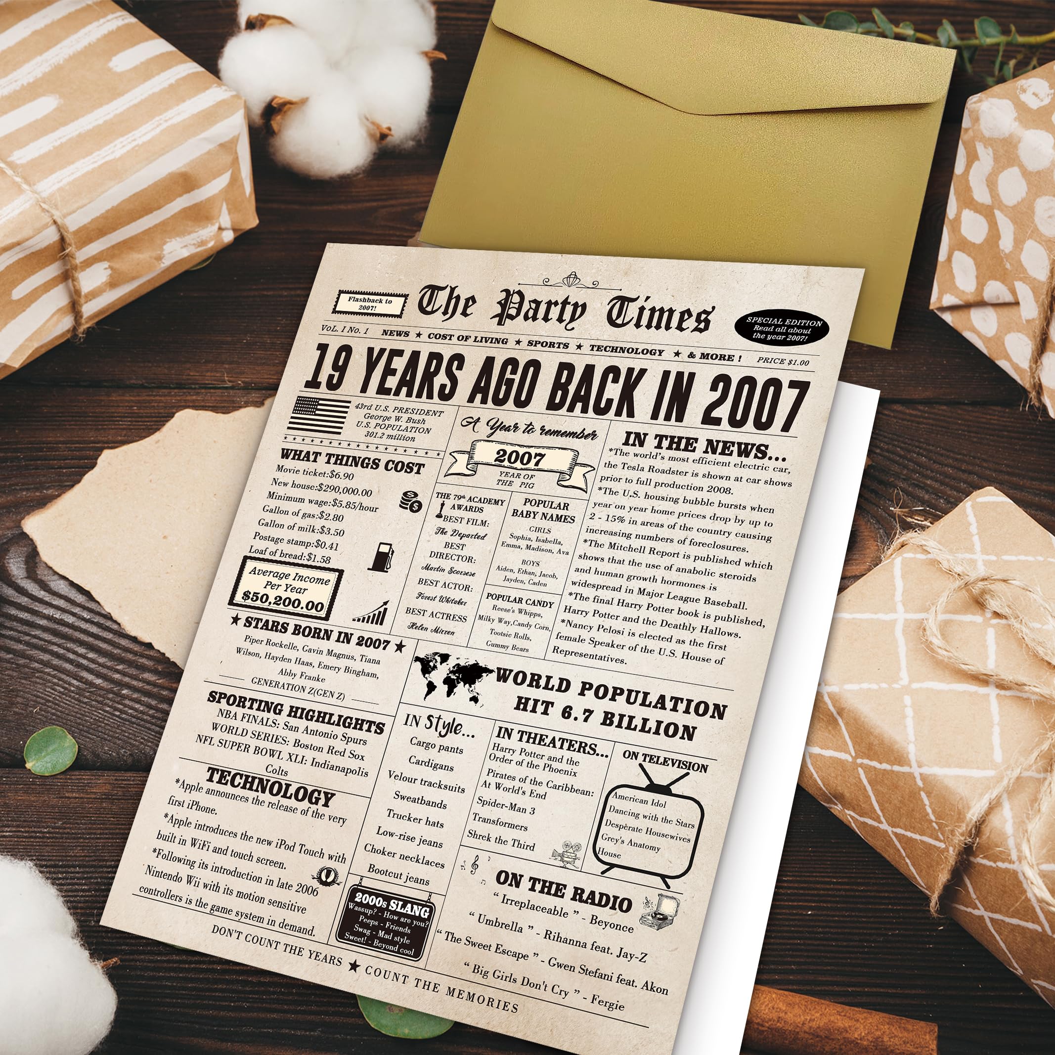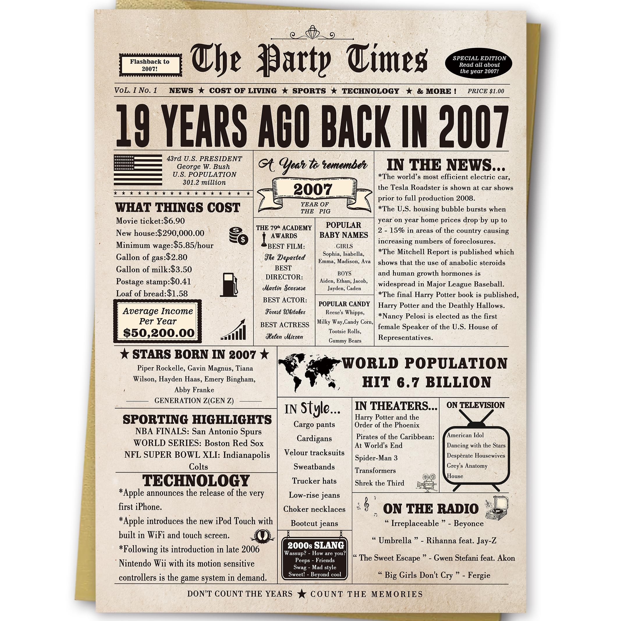 This large 19th birthday card features a vintage newspaper design, showcasing important events, movies and sports events from 19 years ago