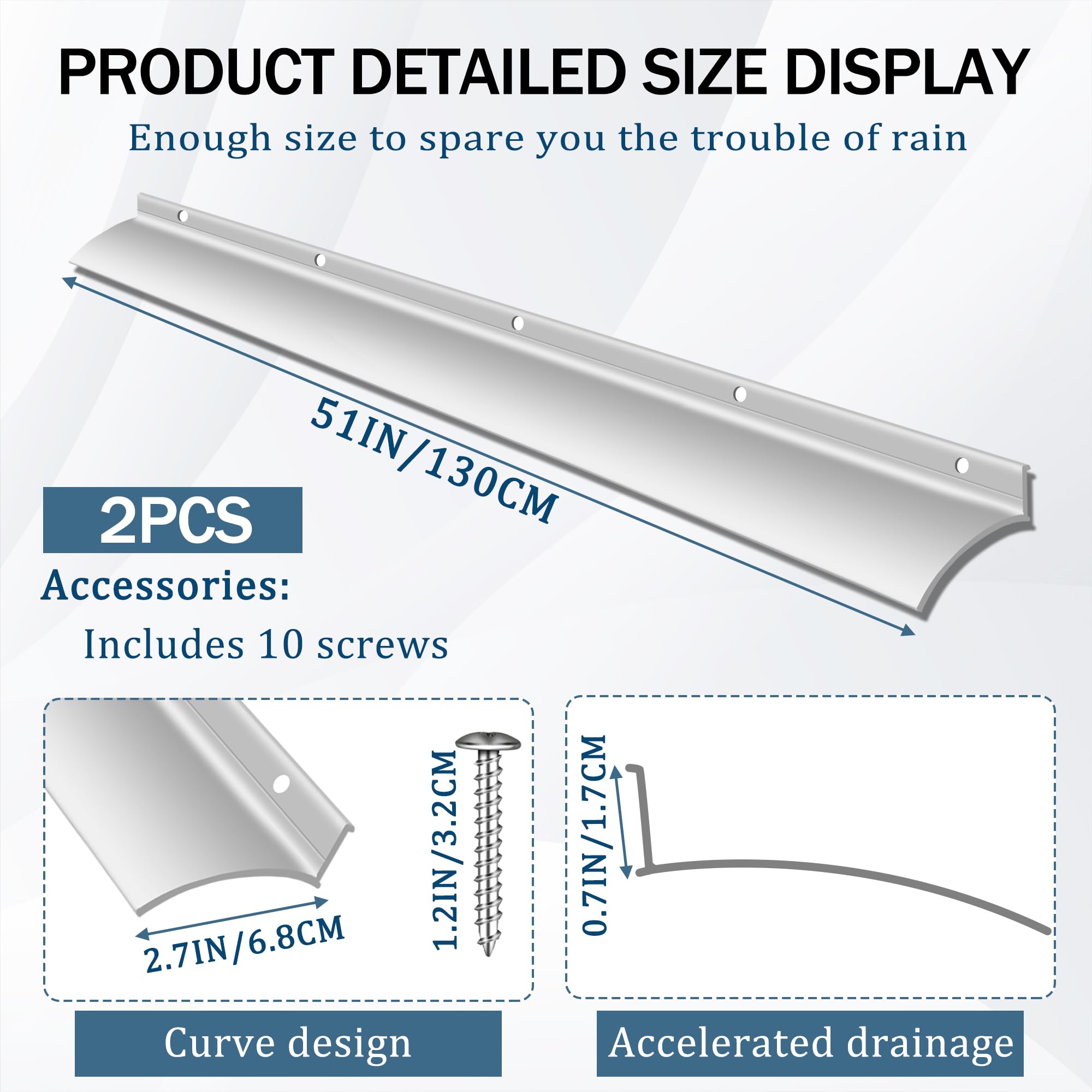 【Door Rain Drip Guard】Includes 2 pieces of aluminum top door raindrop caps that come with 10 mounting screws, each 51 inches /130 cm in size, professionally transparent anodized finish weatherproof and rust-proof, and is subtly adapted to different door sizes and layouts, ensuring you have the necessary protection in place.