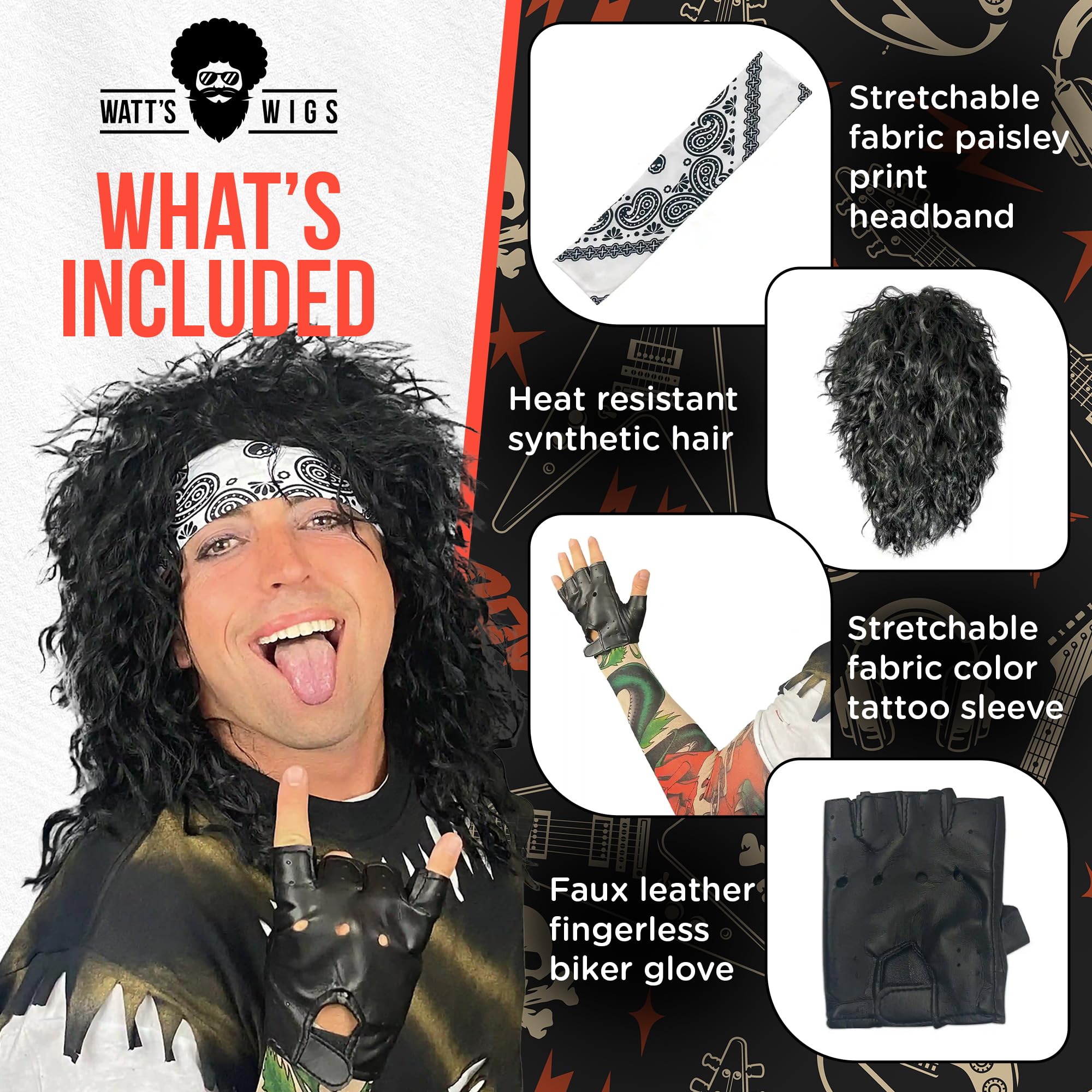 [PREMIUM MATERIALS] Features a heat-resistant 80s wig men style with black curls, plus a stretch-fit tattoo sleeve and faux leather glove. This durable rock and roll costume is made to handle wild nights of fun.