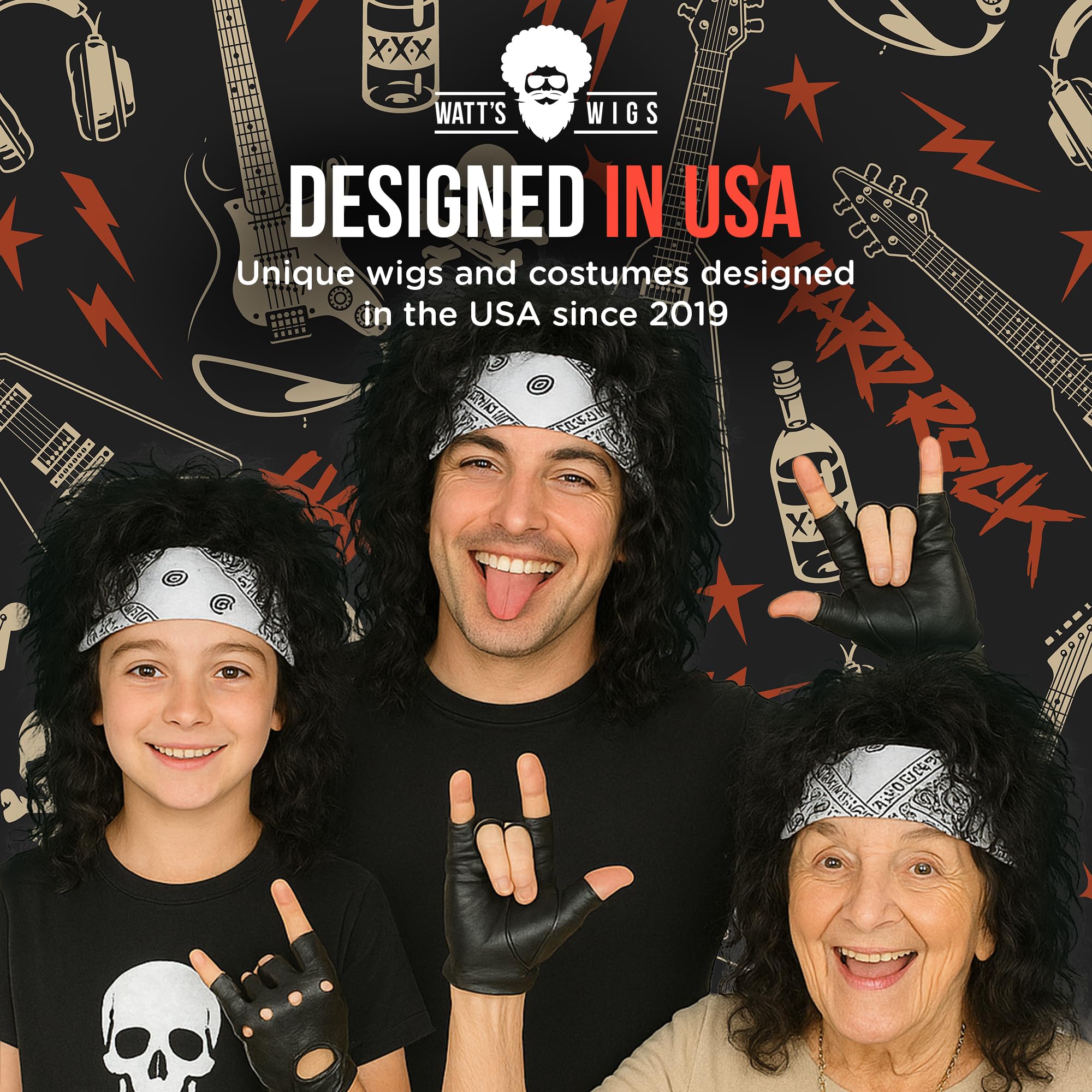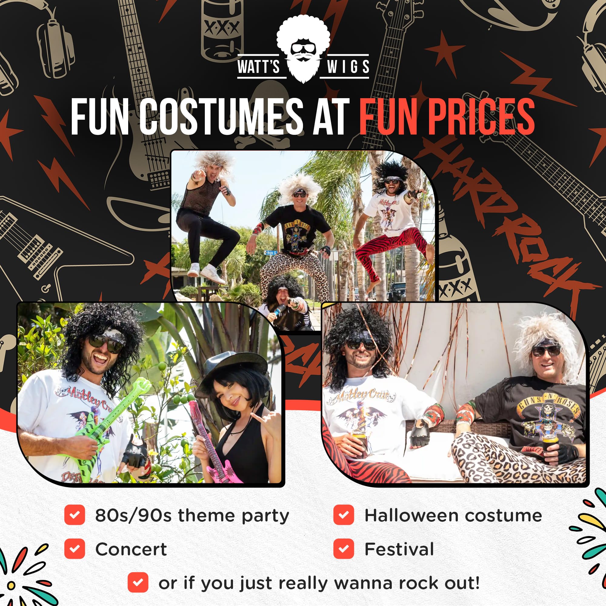 [ONE SIZE FITS MOST] This 80s wig men costume set is designed to fit all rock legends. The adjustable wig and accessories stretch to suit various sizes, making it the go-to rock star outfit for parties, cosplay, or a spontaneous jam session.