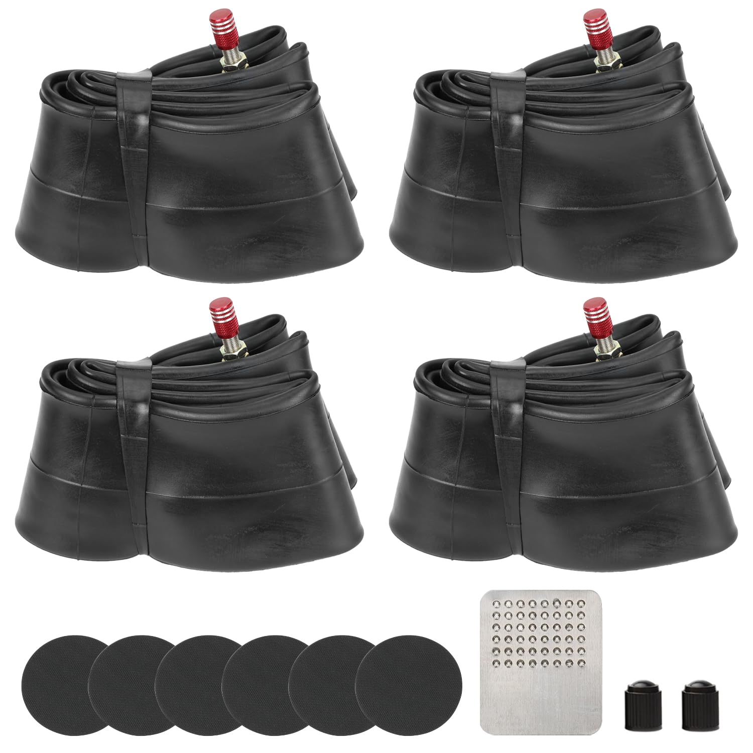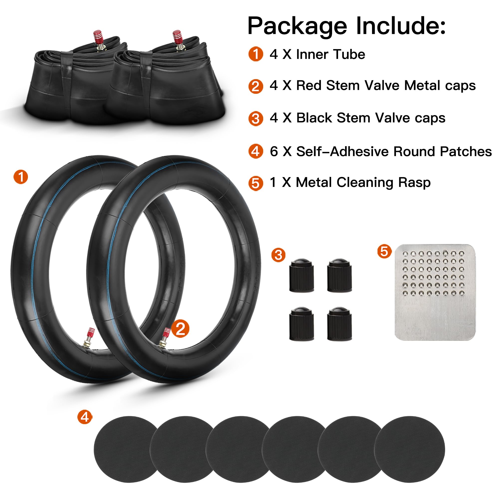 PACKAGE INCLUDED—4 x inner tubes, 4 x red stem valve metal caps, 4 x black stem valve caps, 1 x metal cleaning rasp, 6 x self-adhesive round patches.