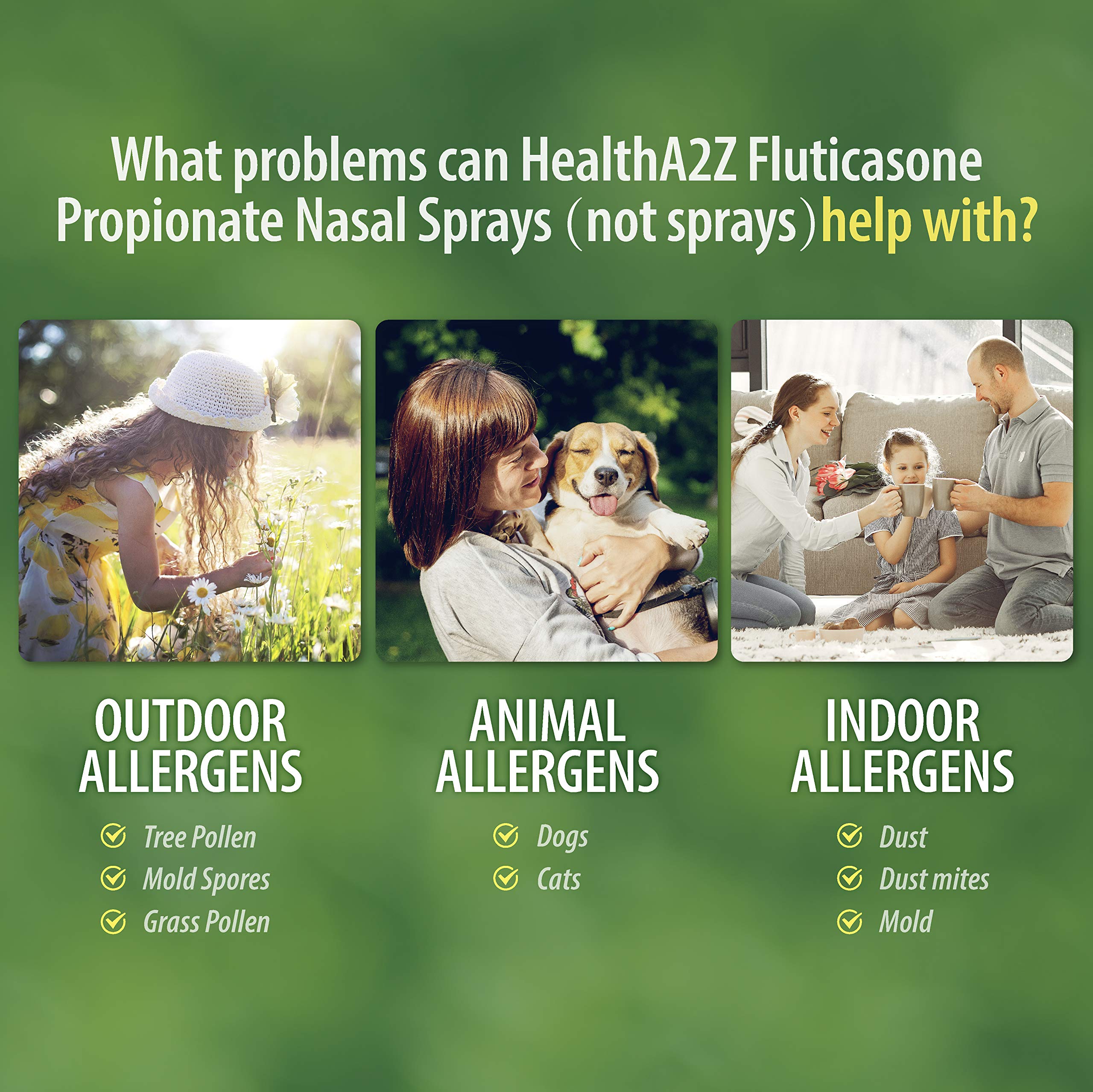 24-HOUR ALLERGY RELIEF: HealthA2Z Fluticasone Propionate Nasal Spray temporarily relieves symptoms of hay fever or other upper respiratory allergies: Itchy, Watery Eyes, Nasal Congestion, Runny Nose, Itchy Nose, Sneezing.