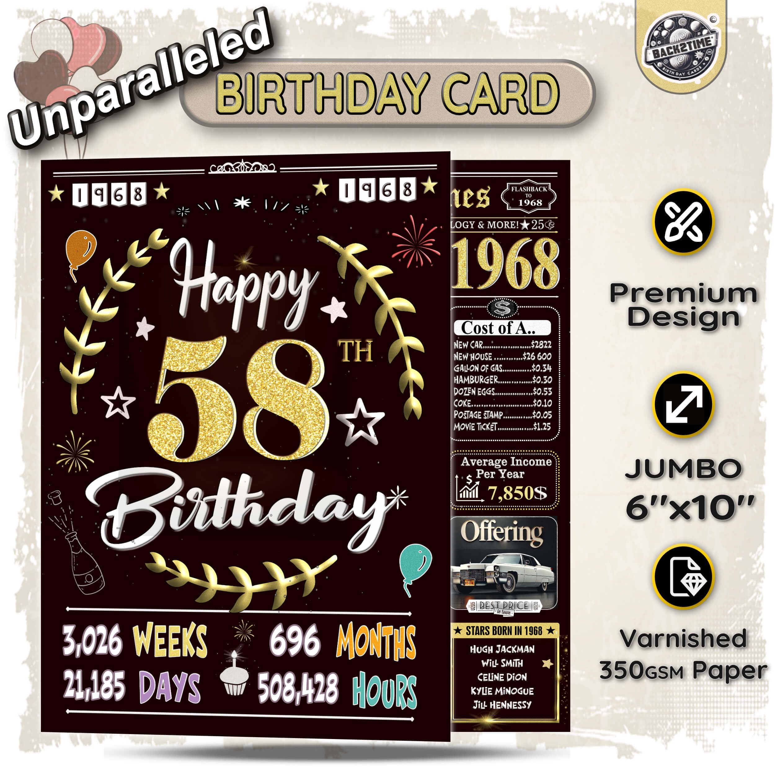 π 58TH BIRTHDAY CARD BACK IN 1968 π Celebrate birthday with this premium vintage design. Perfect for men and women, You are looking for a card for brother, sister, husband, wive, dad, mom, cousin, friend β€οΈ. Spread happiness and create unforgettable memories! Ideal for Gifts, 58 Decorations. Happy Birthday Cards for Women, Happy Birthday Card for Her, 58 years old Birthday Decorations for Men, Boy, Boyfriend.