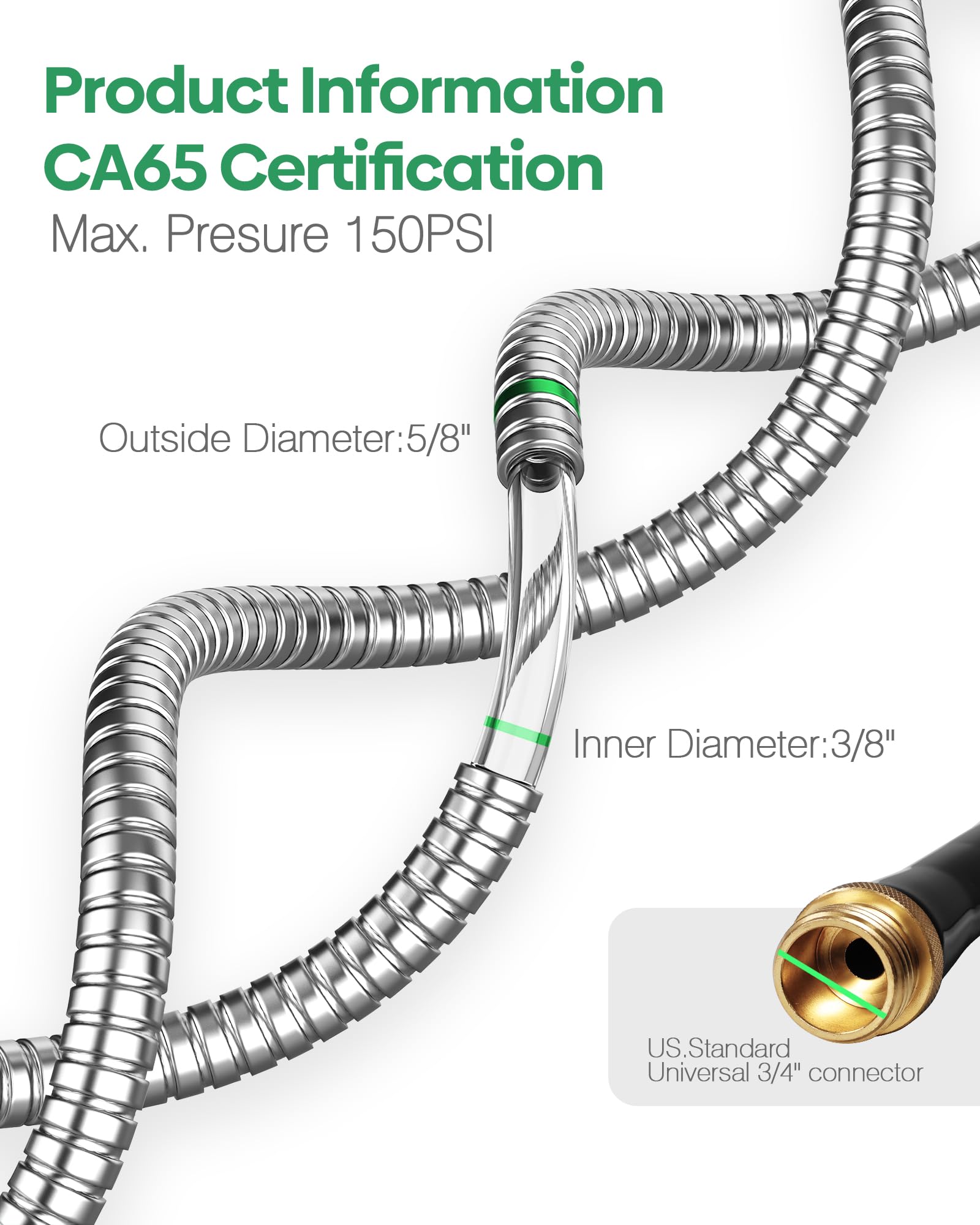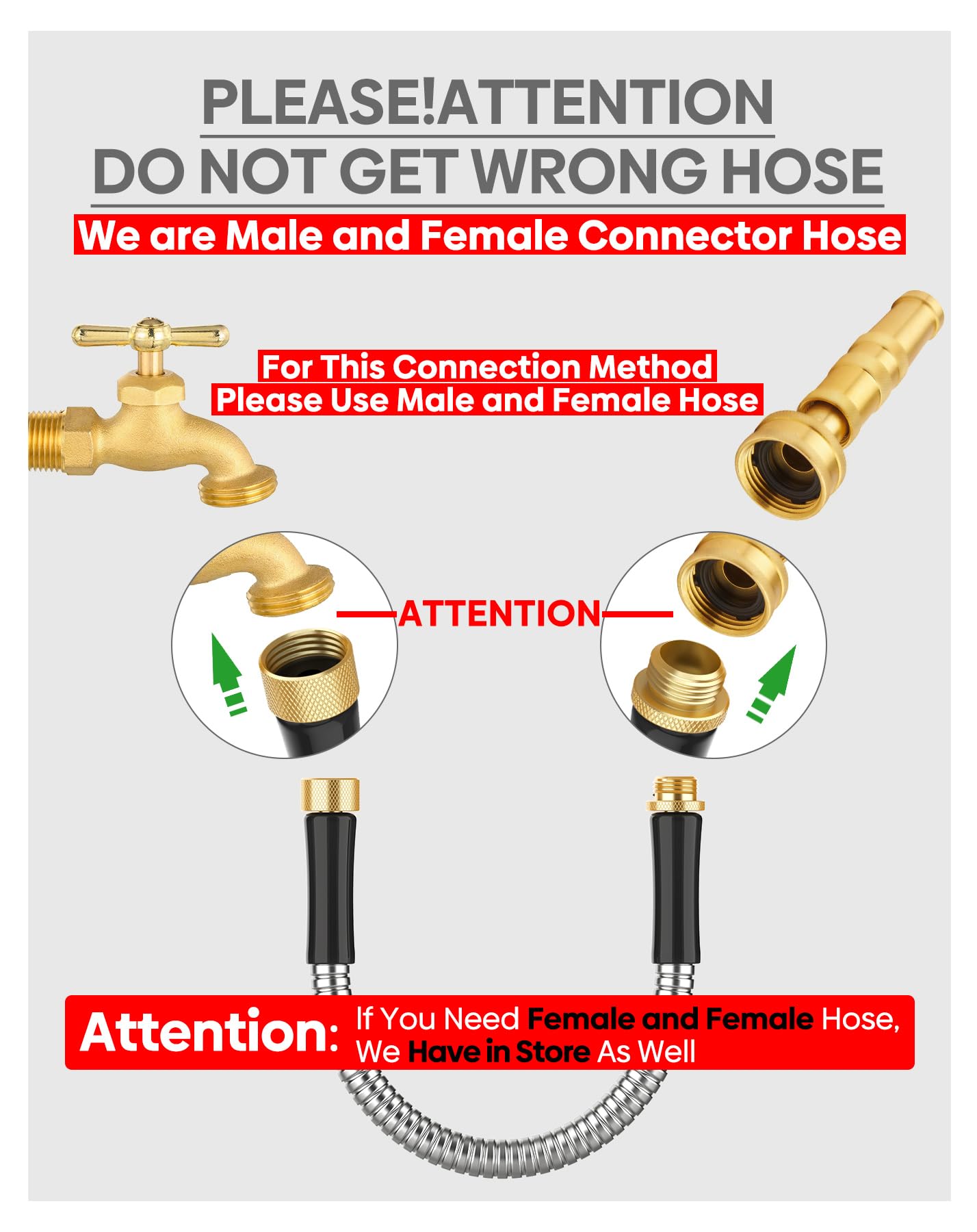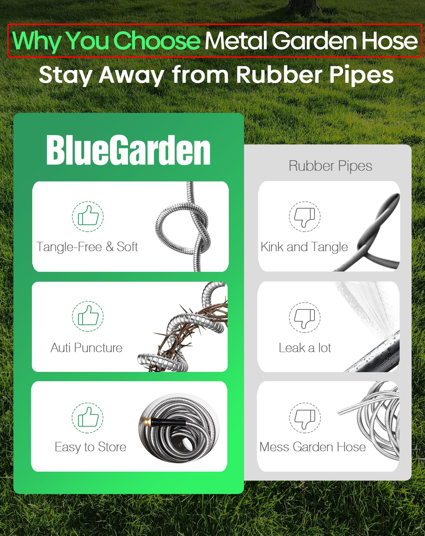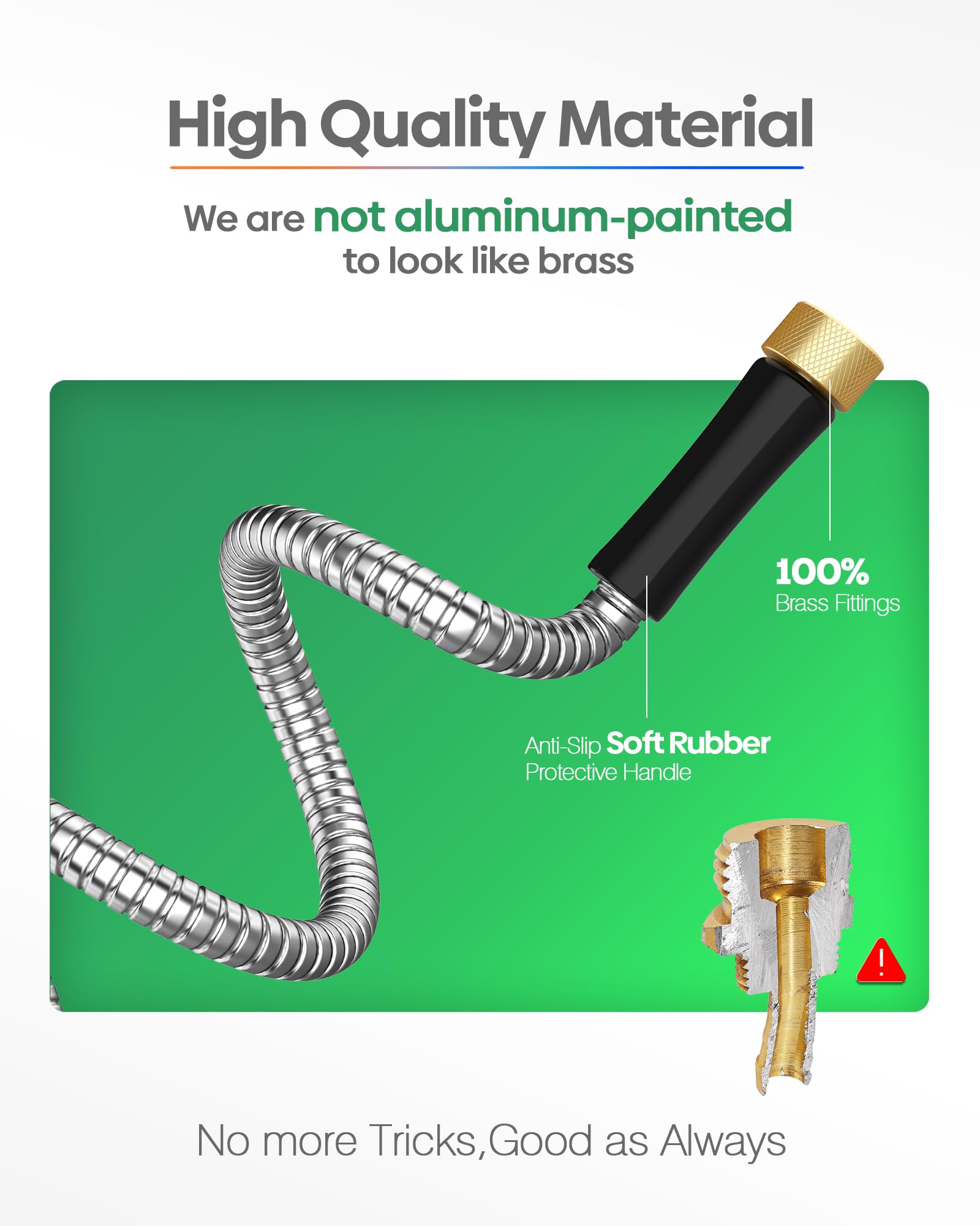 【Premium Metal Hoses】The non-expandable garden hoses are made from 304 stainless steel. This ensures they are durable and resist leaks, punctures, and harsh weather. Their sturdy build protects them from being dragged on rough ground and from dog bites in your backyard.