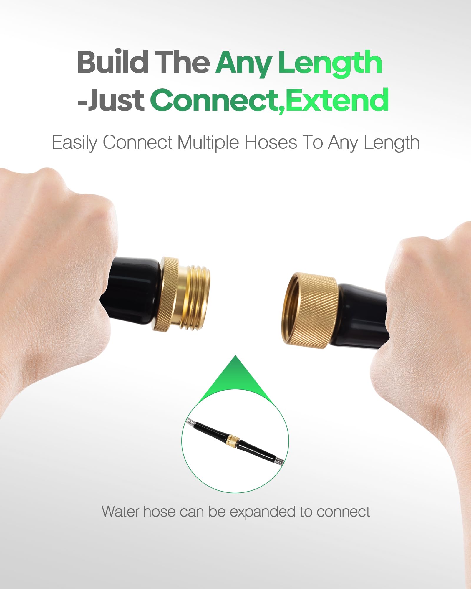 【100% Real Brass Fittings】Our water hoses feature 100% solid brass fittings instead of copper-plated connectors. This design provides a tighter connection to the faucet, helping to avoid water leaks. The design of the 3/4-inch hose connector allows it to fit most U.S. garden hose connectors. You can use it for connecting the hose to the hose reel and for joining two hoses together as needed to extend the extra length of the hose.