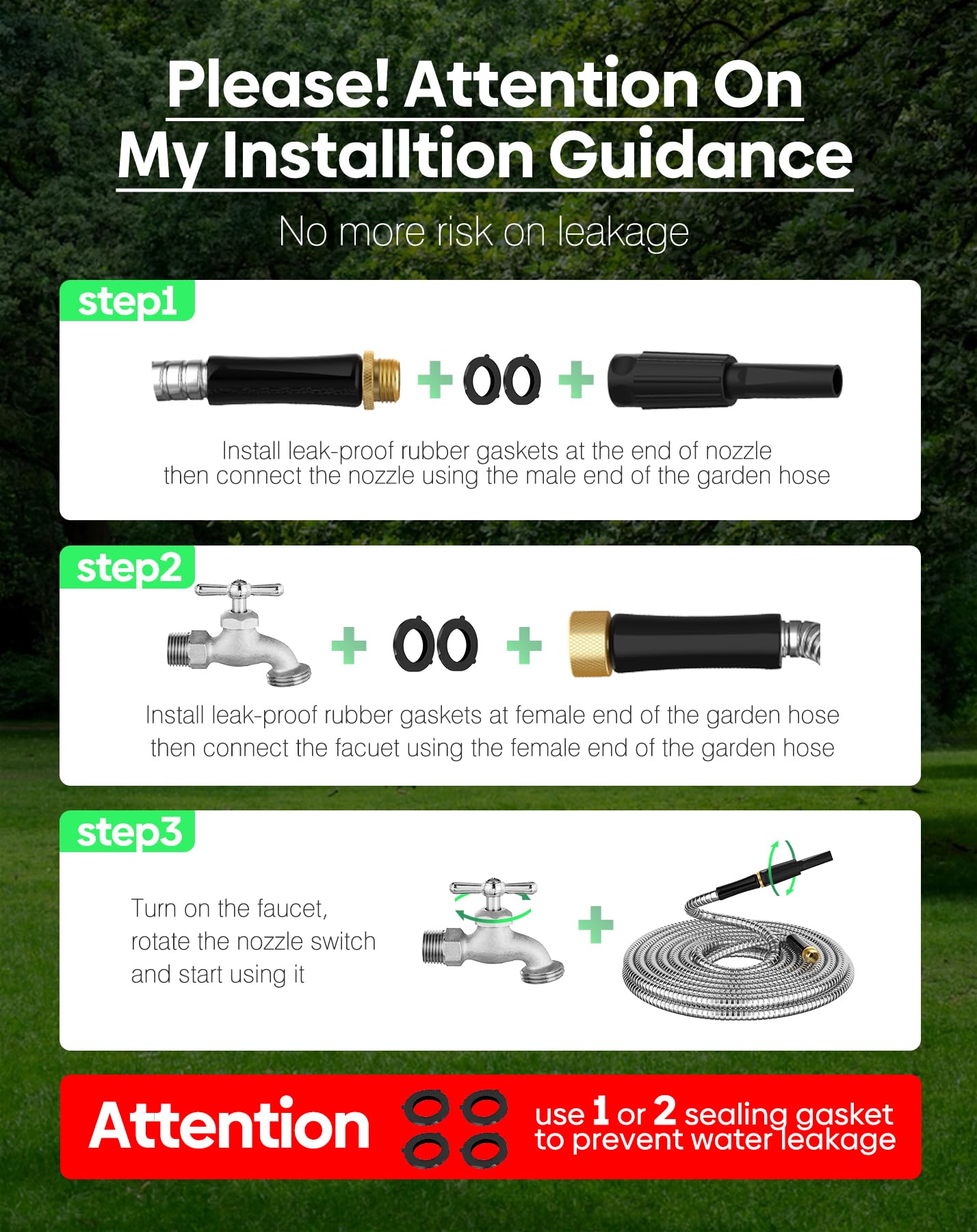 【Kink Free & No Leakage】The metal water hoses feature exceptional flexibility, a non-kinking design, and a lightweight construction compared to traditional rubber pipes. A rubber gasket is on the male end (2 extra rubber gaskets are included). Seal it in a way that prevents the hose from leaking. NOTE: Please drain water from the hose if it is not used for a long time.