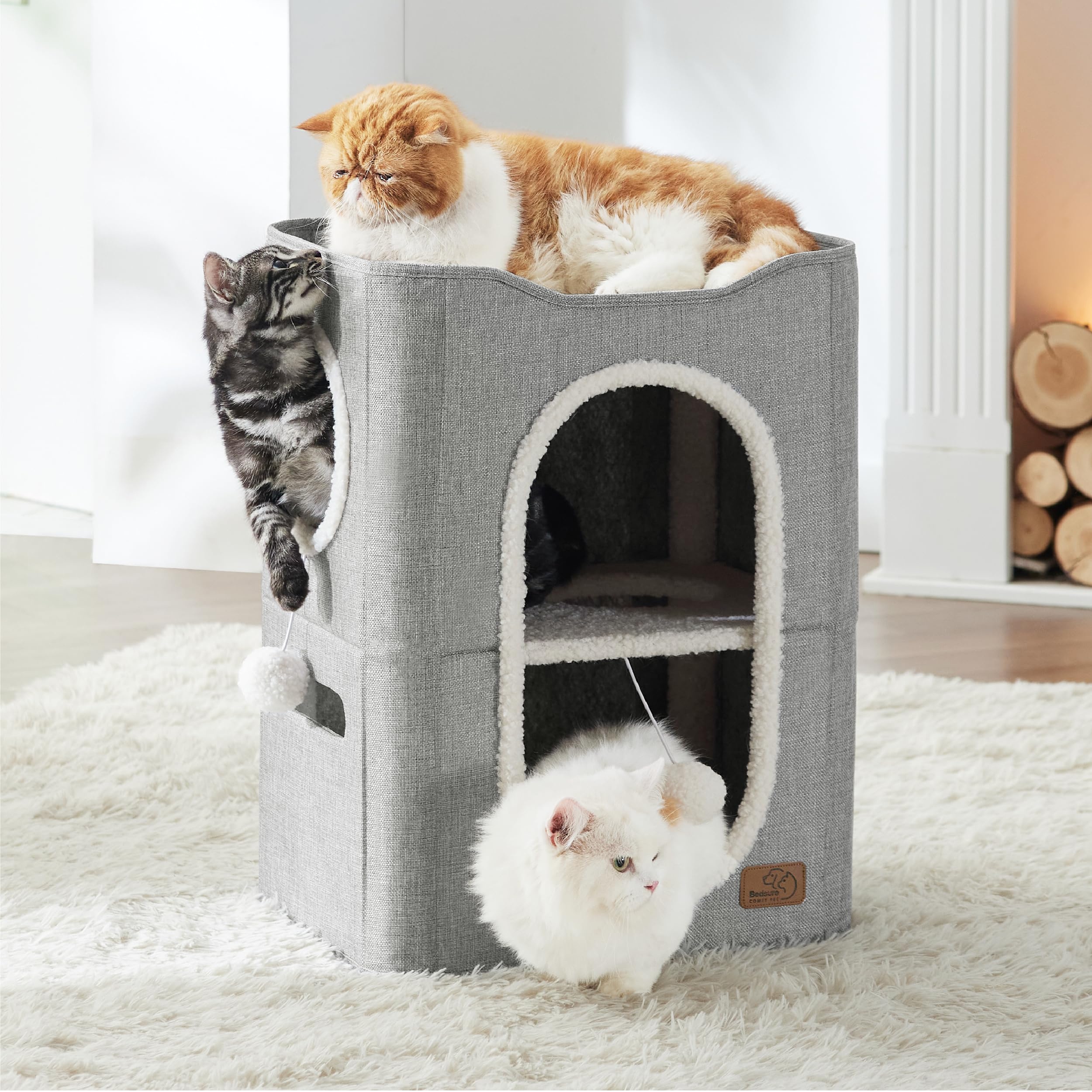More Room to Lounge: With dimensions of 23 x 18 x 14 inches, our cat house boasts three cozy spots for playtime or relaxing. The 2-level layout offers a roomy yet snug haven for kittens and adult cats alike. Plus, its design is ideal for multi-cat households. Get ready to see your kitty's eyes light up!