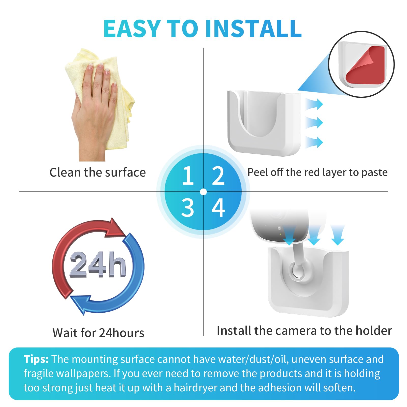 Easy to install - Simply stick the tape to the backside of the mount and then remove the other side of the tape, place it in your desired position and let it stand for about 24 hours. You can slide the camera into the slot.