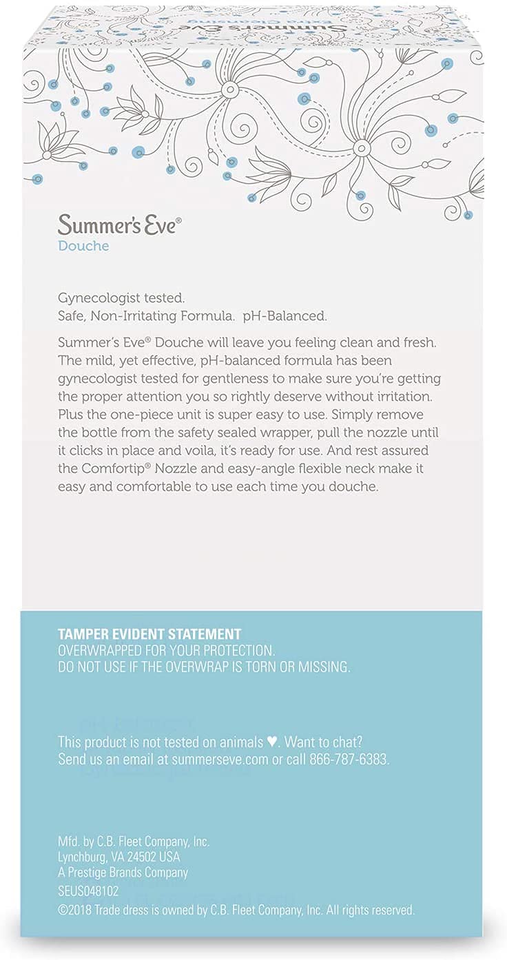 Summer's Eve has a Extra Cleansing Vinegar & Water Douche and Medicated Douche. Summer's Eve Douche will leave you feeling clean and fresh. Gynecologist Tested formula is effective and gentle (no irritation) will leave you feeling clean and fresh. pH balanced and Hypoallergenic. Clinically Tested Safe Scents. Also available in Sweet Romance, Island Splash, and Fresh Scents.