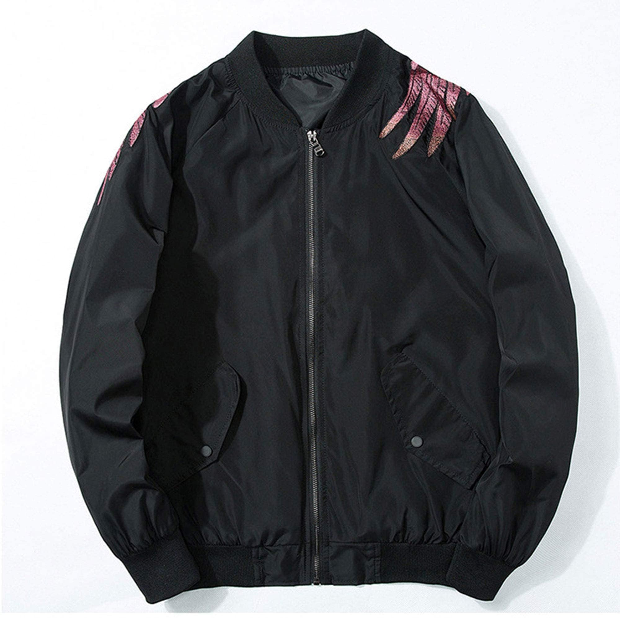 (Features of mens streetwear) This bomber jacket men has two external pockets. The front of the jacket has a relatively simple design, and the back uses a large embroidered phoenix print. This is a very hip hop clothing for streetwear men jacket