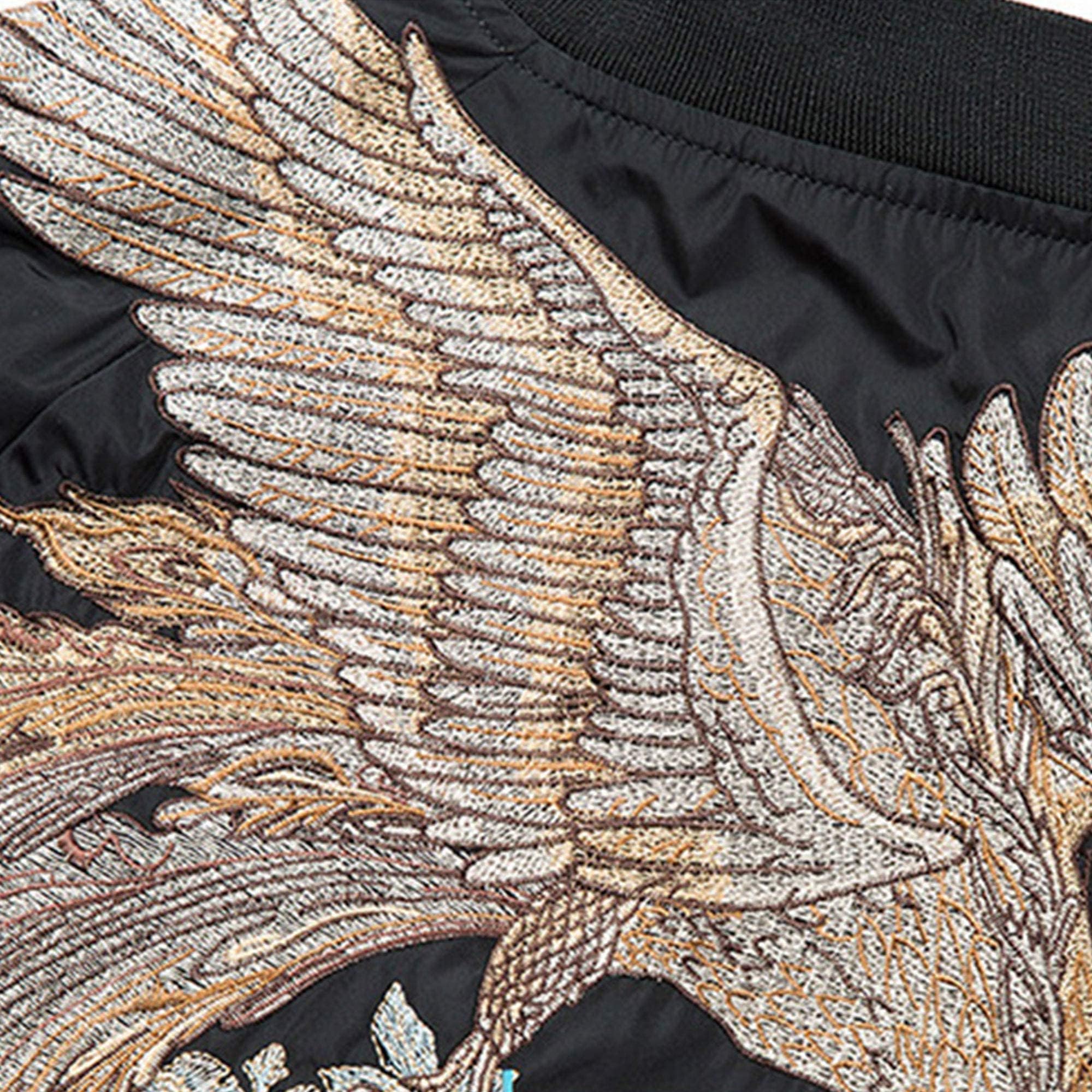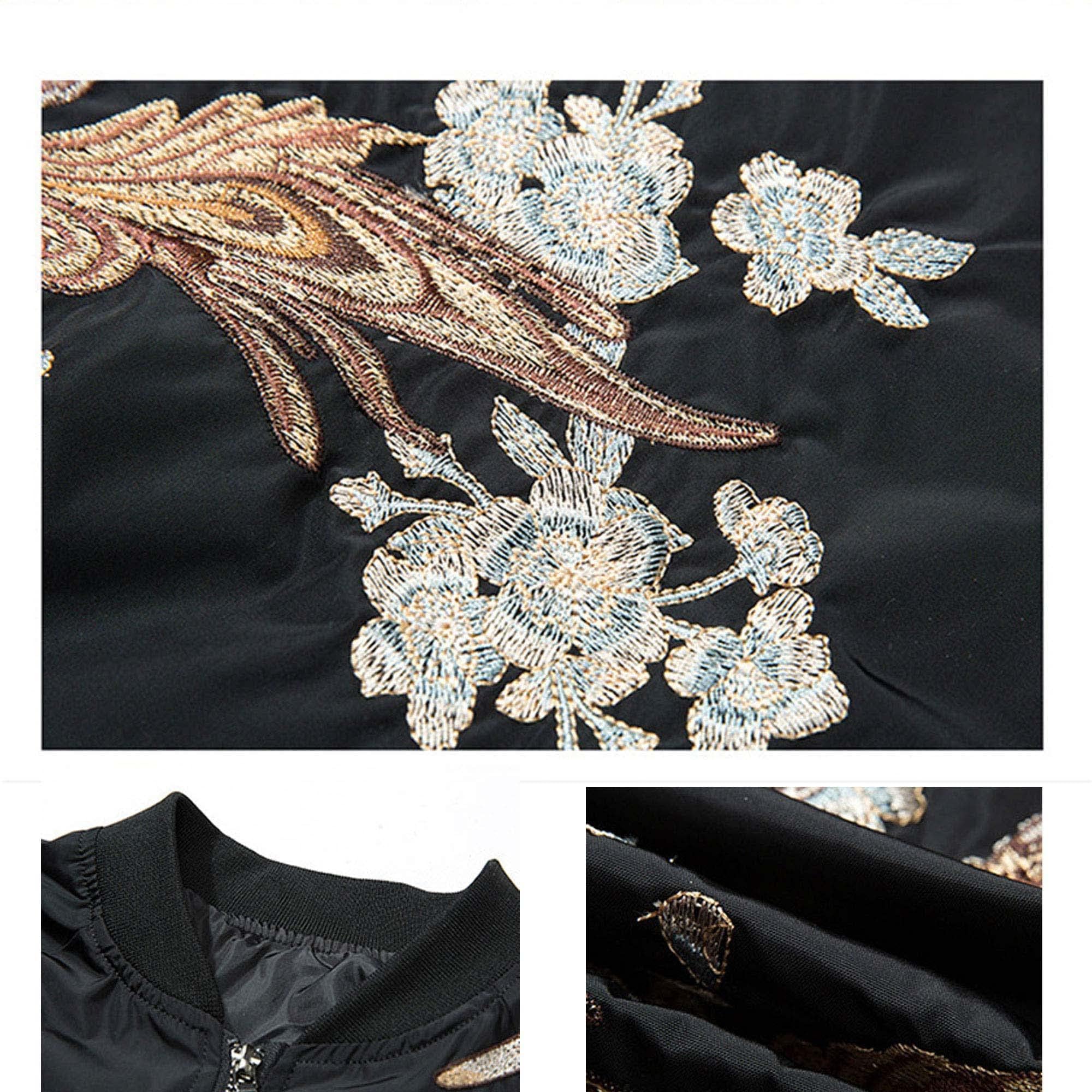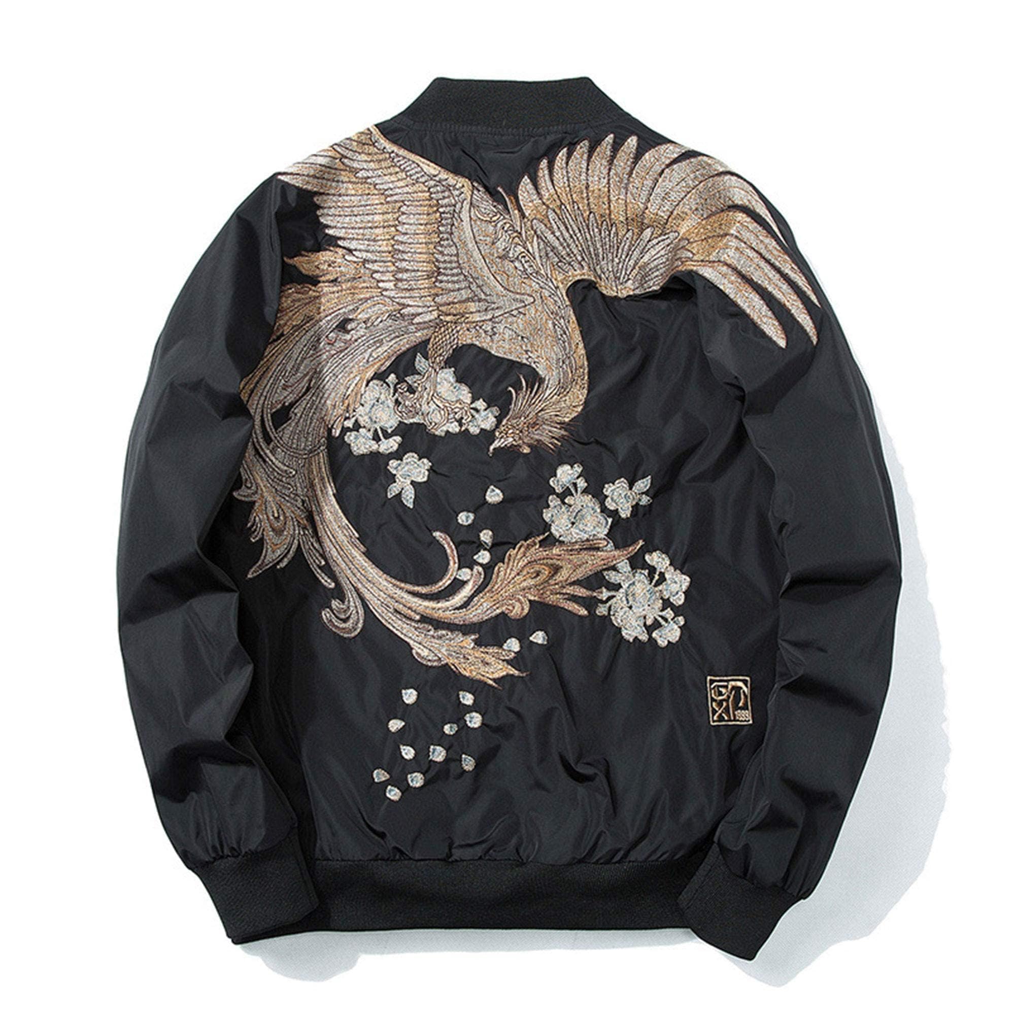 (Featured design embroidery Phoenix) The back of this mens bomber jacket uses a phoenix pattern. The phoenix is a kind of auspicious bird and has a very high status in China and Japan, which means good luck and happiness.